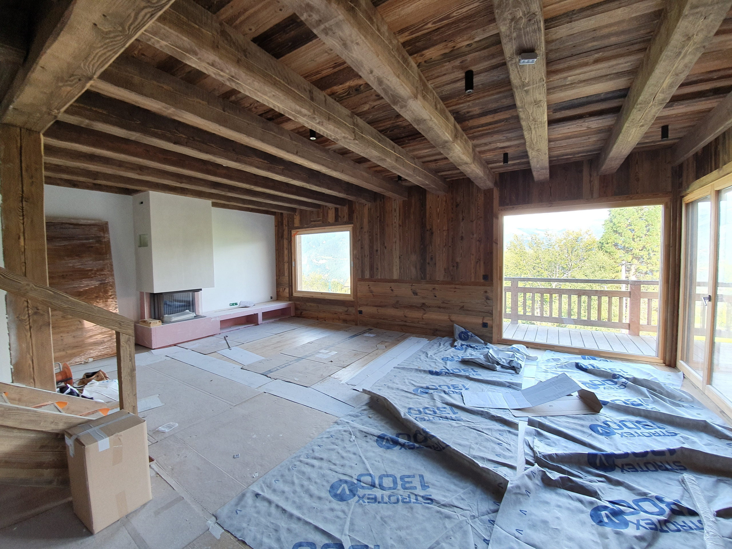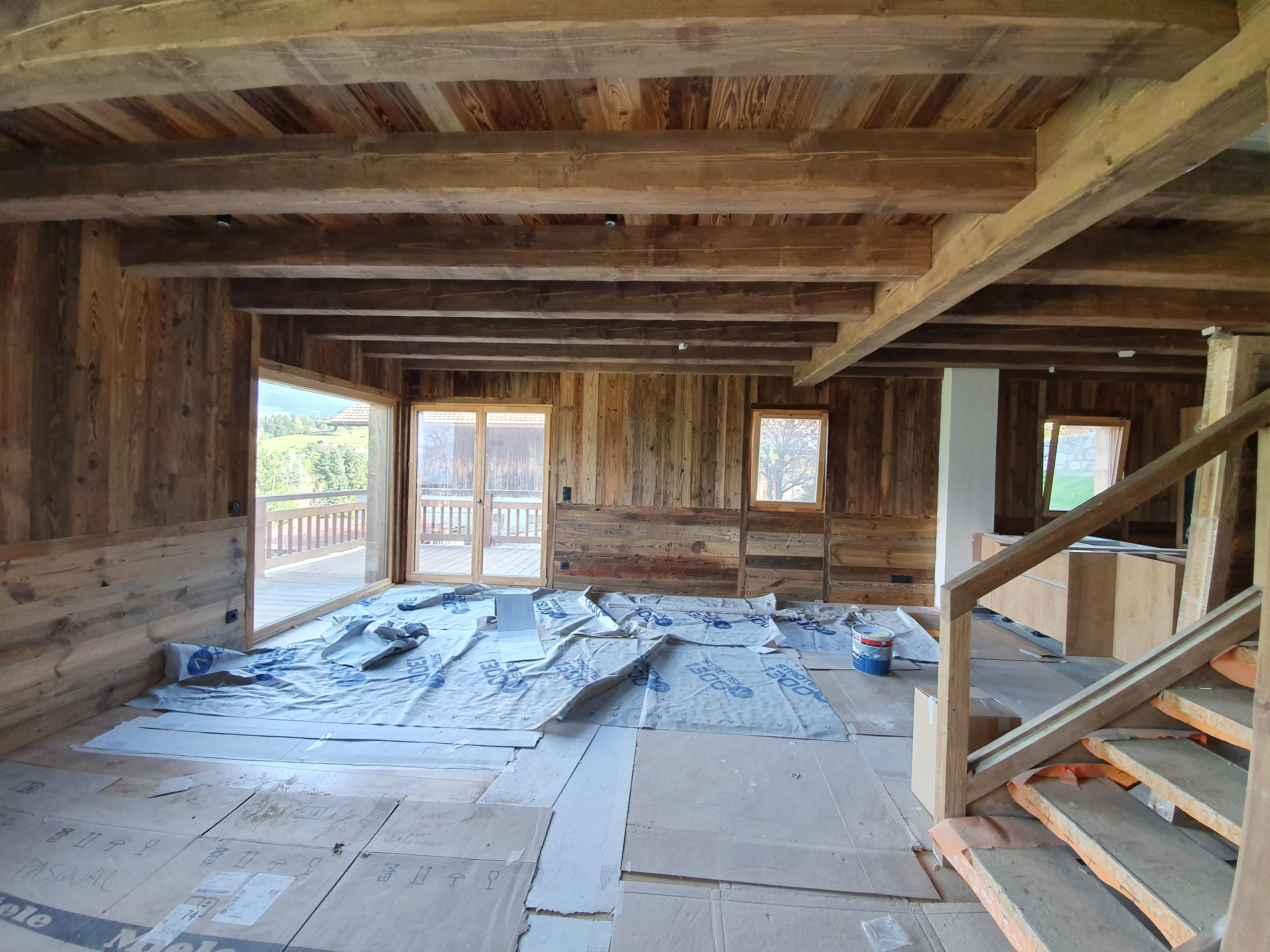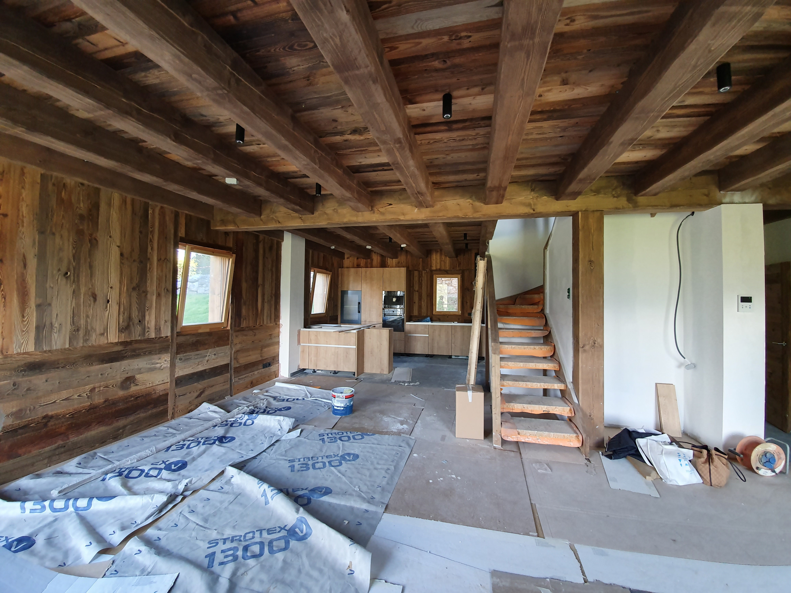 Avant. Ces maîtres d’ouvrage avaient précisé dès le départ au promoteur qu’ils ne se chargeraient pas d’aménager le bien. Aussi, le Groupe Angelloz Nicoud, a fait appel à une l’architecte d’intérieur de son réseau, Anne-Valérie Ollien, pour inventer l’ambiance du chalet « jusqu’à la petite cuillère ». Nous découvrons ici la pièce de vie principale, peu de temps avant la livraison du chalet en septembre 2019.