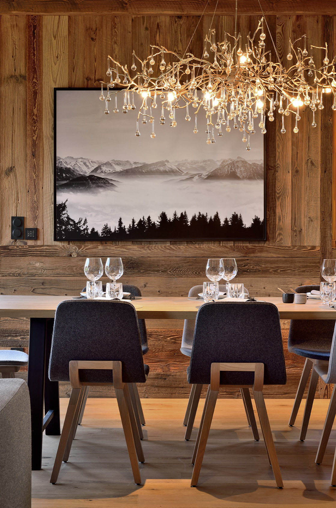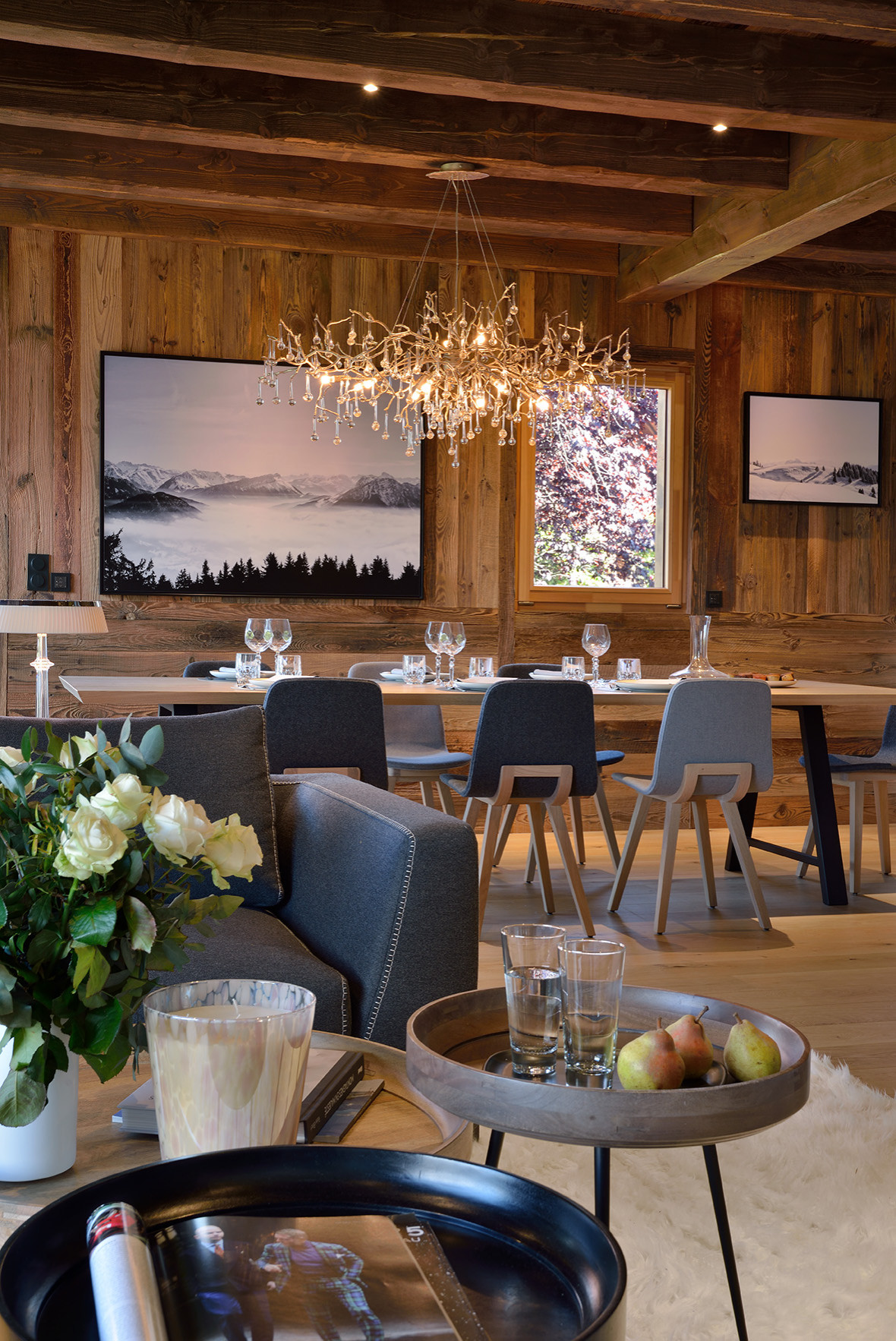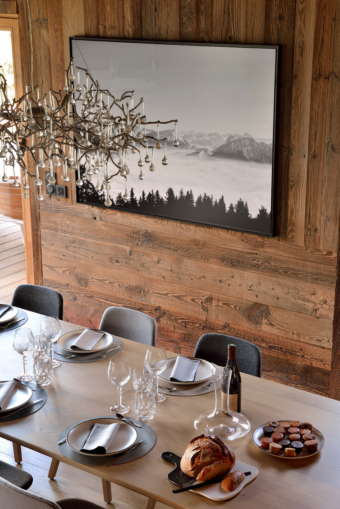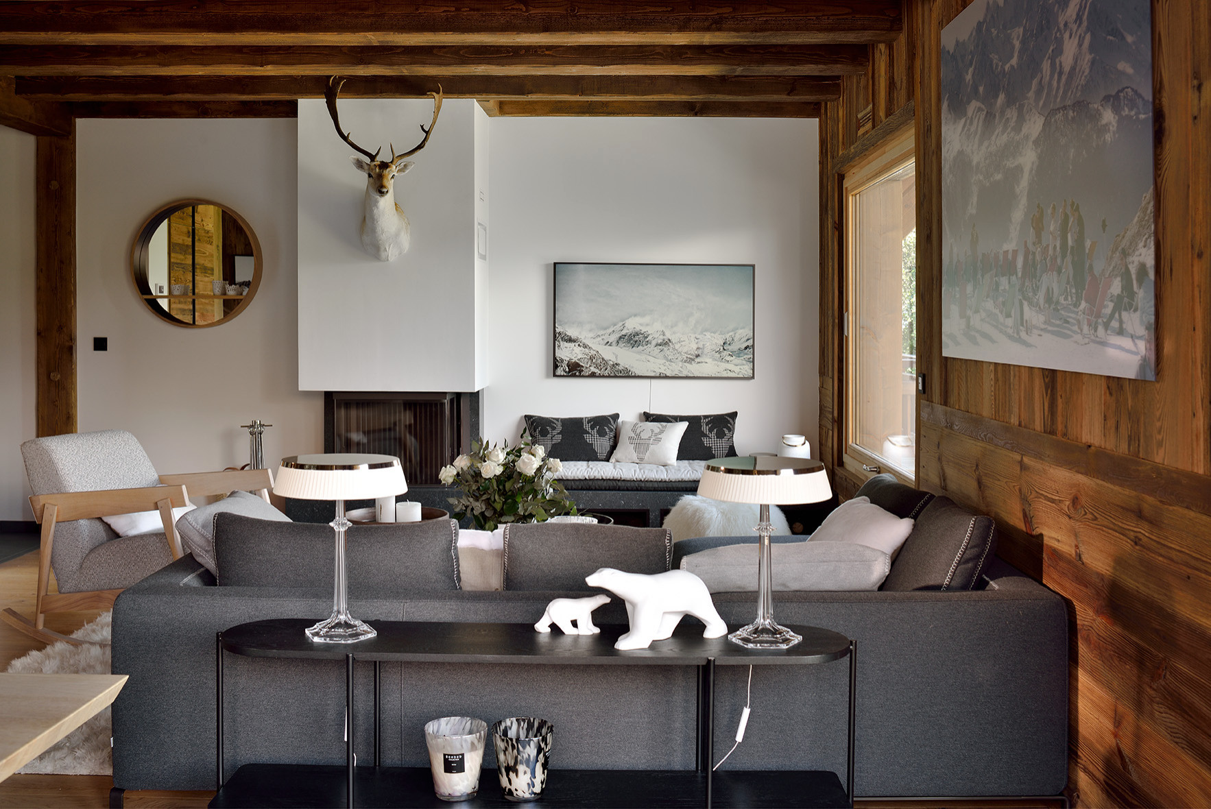 Pour que propriétaires déterminent l’ambiance du chalet, la professionnelle a élaboré des mood-boards (des planches d’inspiration) de plusieurs styles qu’elle leur a soumis. « Ils imaginaient le chalet comme un lieu de réception élégant et aimaient les décors intemporels, chaleureux. Ils ont souhaité partir sur un univers contemporain, mixant deux des ambiances que j’avais proposées en “blanc et bois” et “gris intemporel”, mâtiné de touches luxueuses », explique-t-elle.