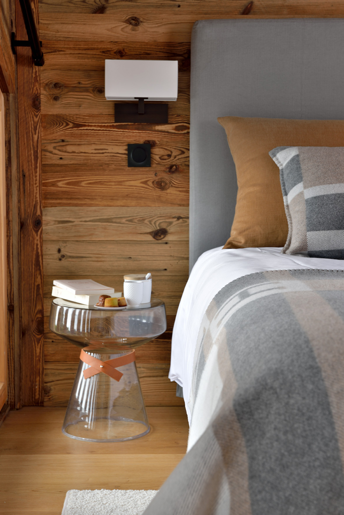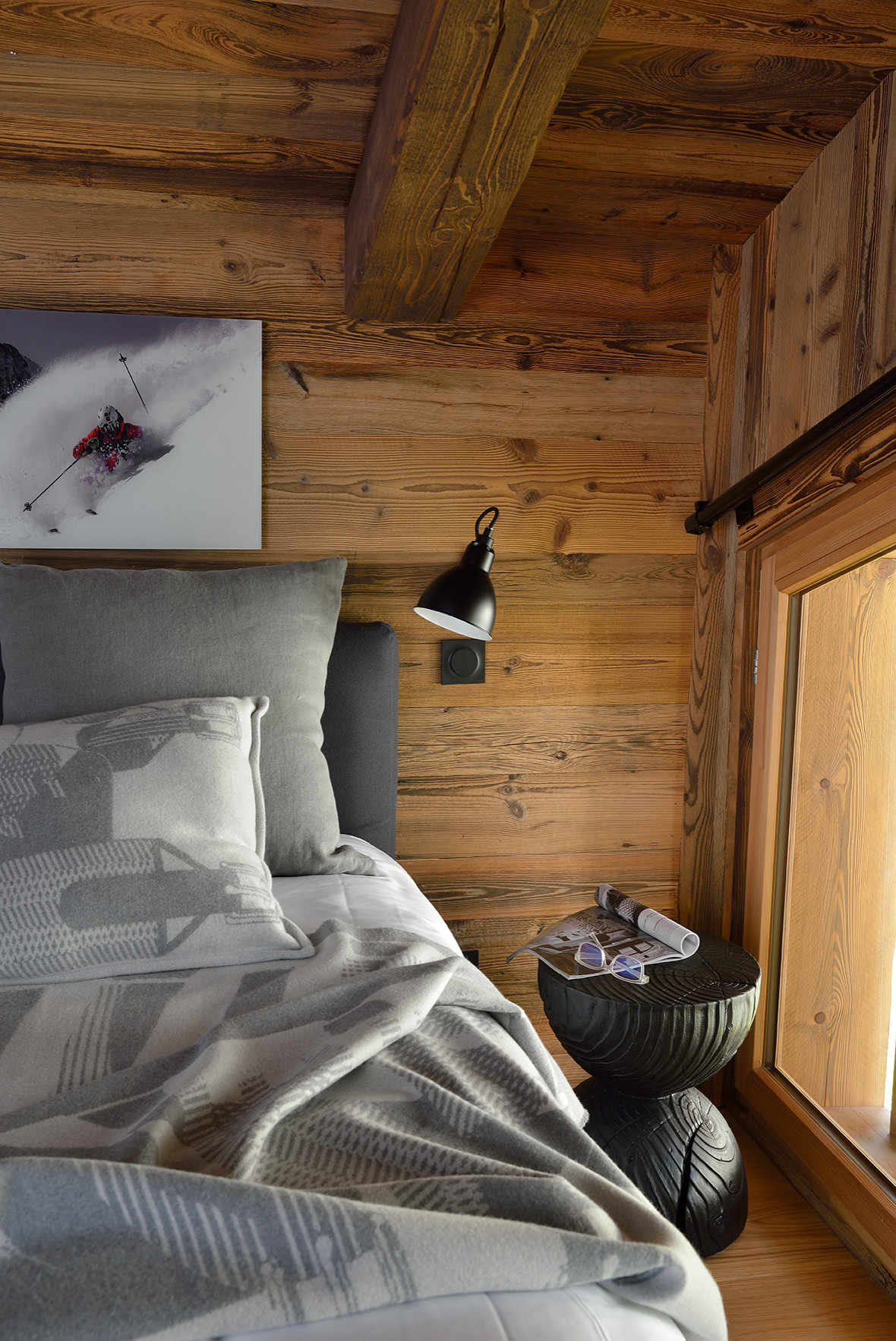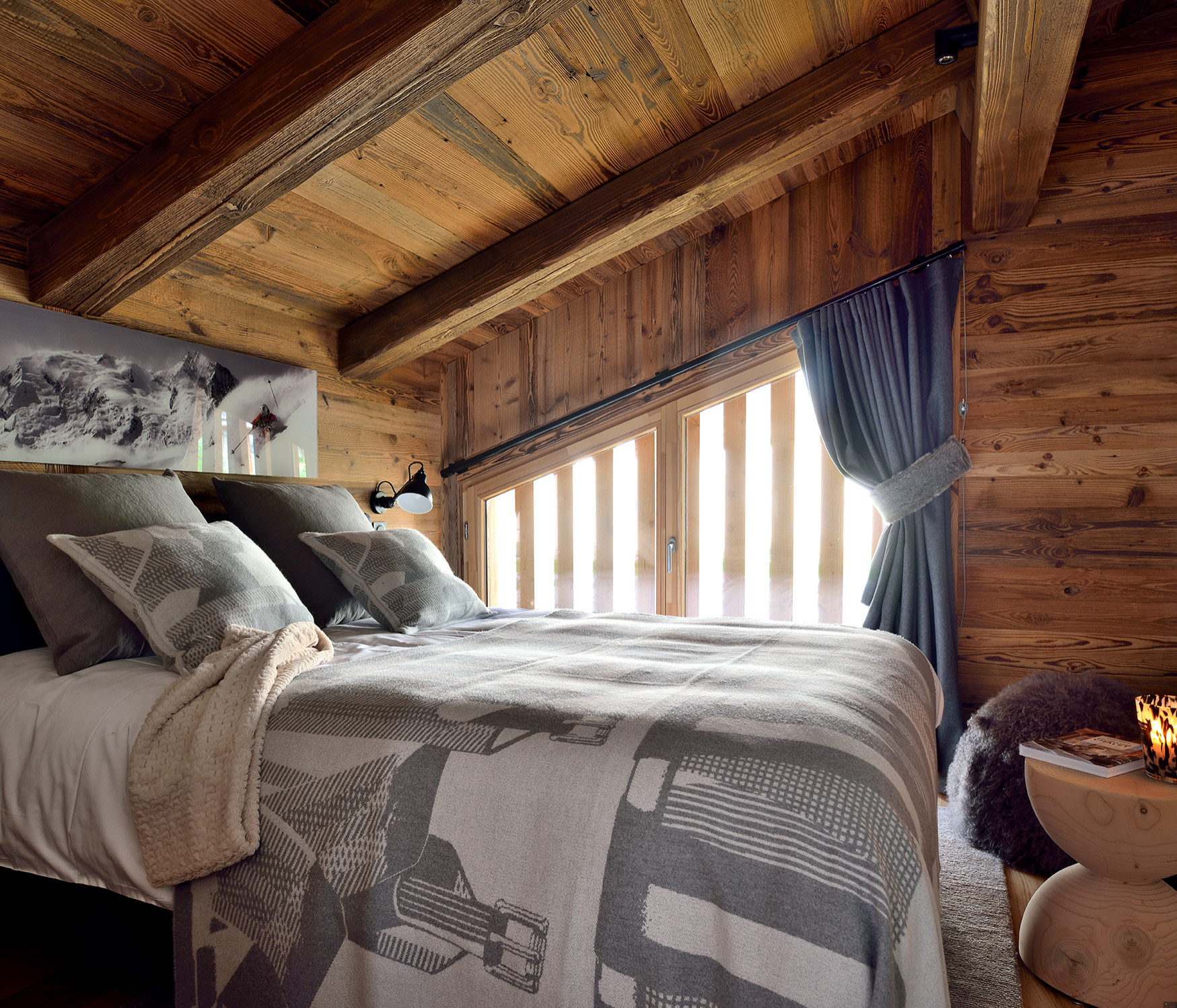 Pour confectionner des lits douillets, la pro a sélectionné des couvertures et coussins en laine de chez Hermès et Arpin 1817, une marque savoyarde qui file et tisse la laine d’alpage depuis 200 ans. L’étoile lumineuse et la guirlande sont venues ajouter une touche de féerie.