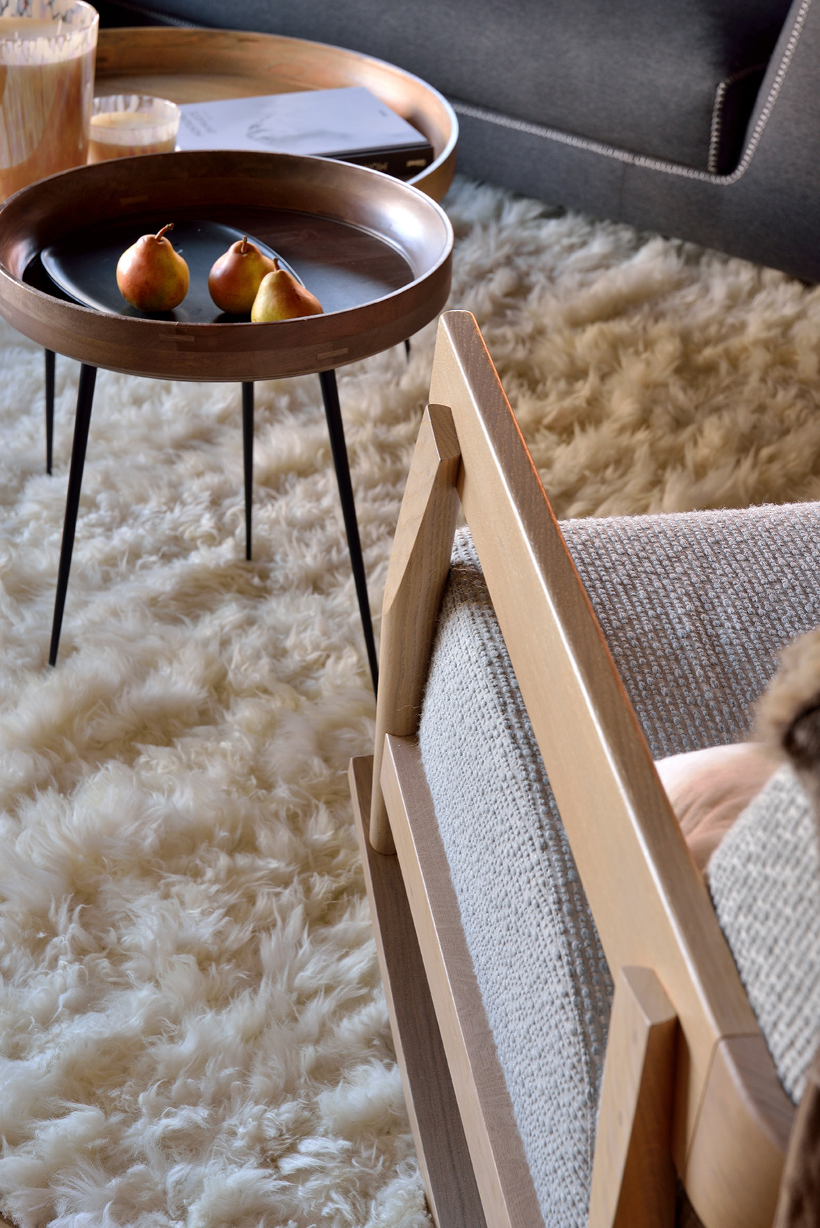 Les rideaux ont été réalisés sur mesure en tissu de Laine Nobilis et un pouf en fourrure parfait le décor.