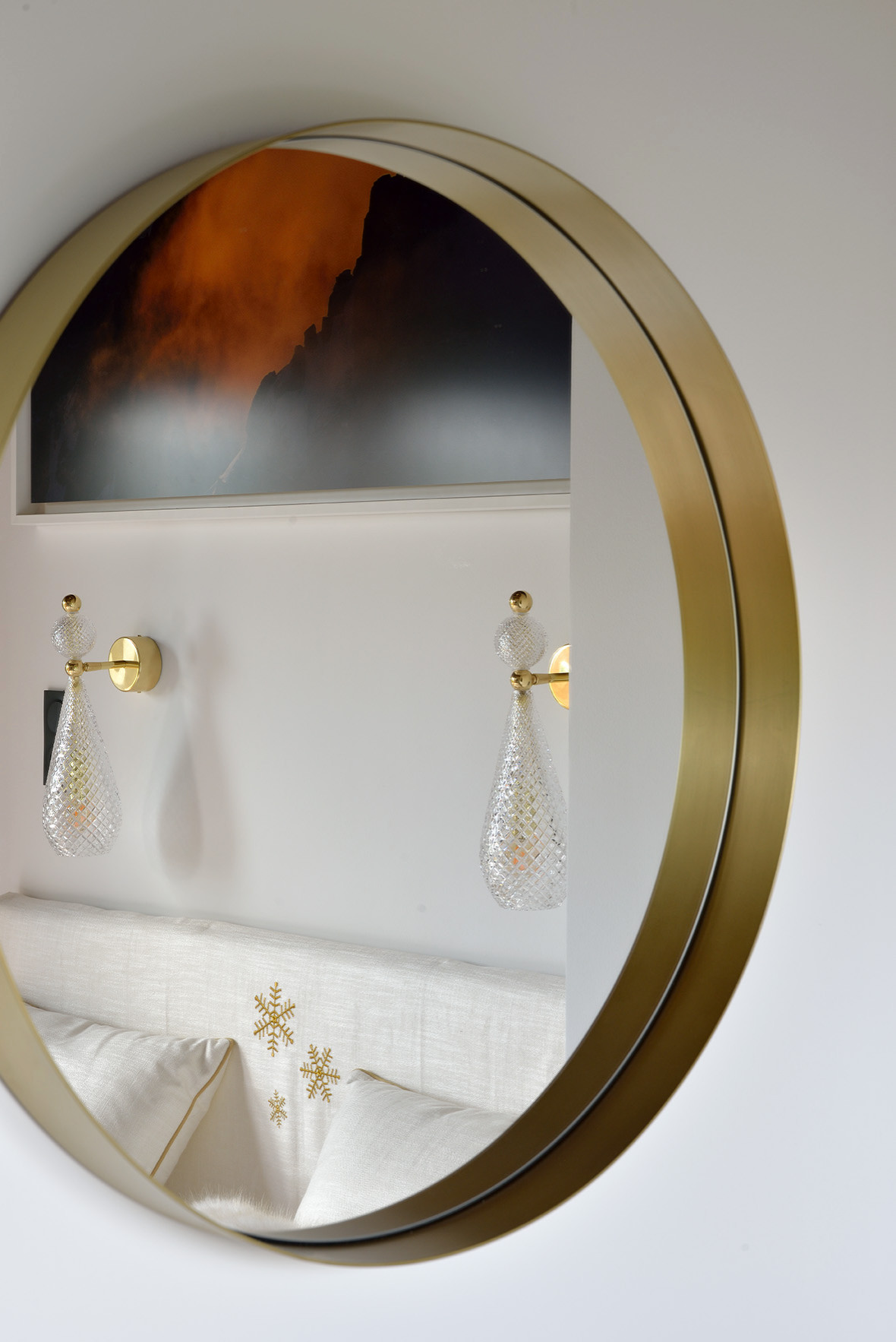 La tête de lit en lin a été réalisée sur mesure par une tapissière et sa housse brodée à la main de trois flocons, la signature de l’agence d’Anne-Valérie Ollien. Les appliques en cristal apportent une note féerique lorsque la nuit tombe.