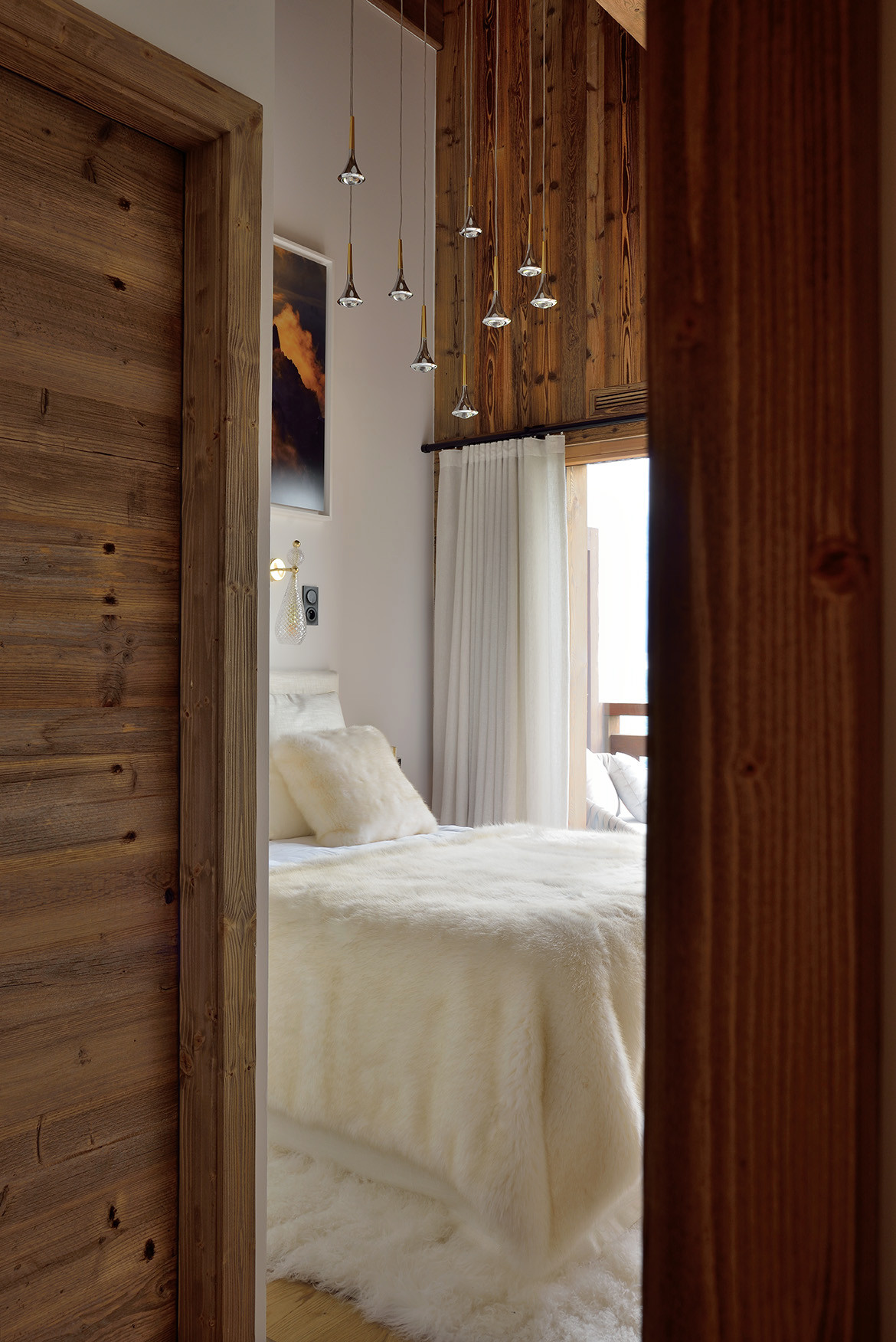 Dans la suite parentale le blanc domine, ponctué par la seule touche de couleur d’un tableau en tête de lit. « Il représente la montagne au coucher du soleil et ses couleurs chaudes s’assortissent au bois », décrit la pro. Cette note de couleur a été souhaitée car, avec 9 m² au sol et 4,5 m sous plafond, cette chambre était un challenge à aménager. « J’ai cherché à appeler le regard vers le haut avec ce tableau et la suspension en formes de gouttes pour faire oublier la taille exiguë de la pièce », justifie l’architecte d’intérieur.