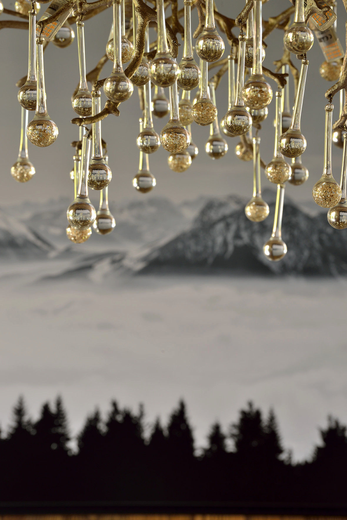 L’architecte d’intérieur a fait mouche avec ce lustre dont les clients sont tombés amoureux. Il est entièrement customisable en taille et couleur. Elle a retenu ici une option particulière où certaines pampilles en cristal ont des feuilles d’or incrustées à l’intérieur. « Le scintillement est féerique ! », assure la pro.