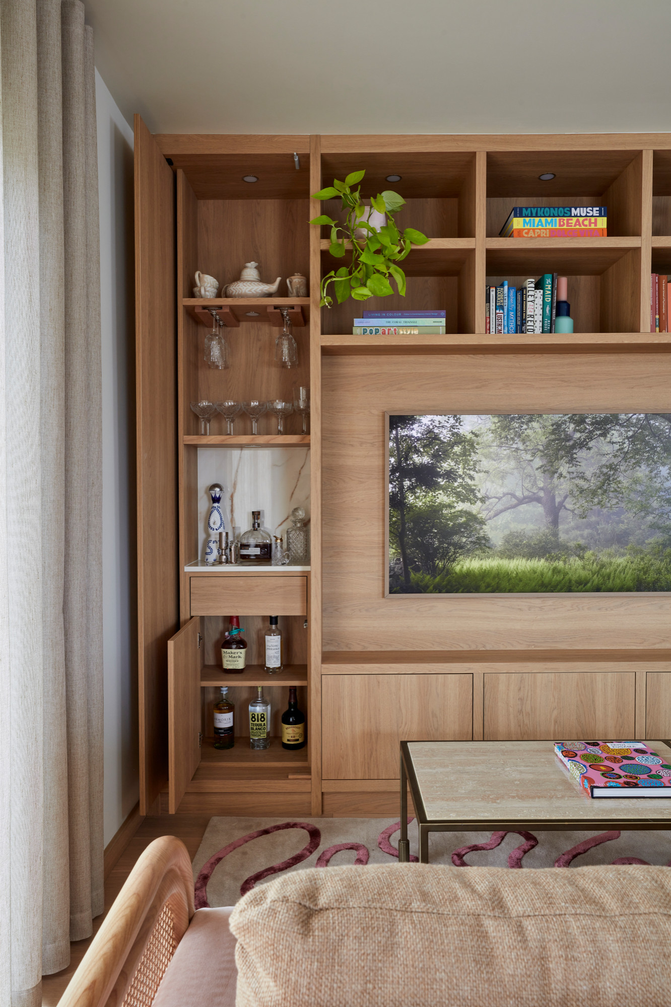Il contient un mélange de placards et d’étagères ouvertes, ainsi qu’un bar dissimulé.