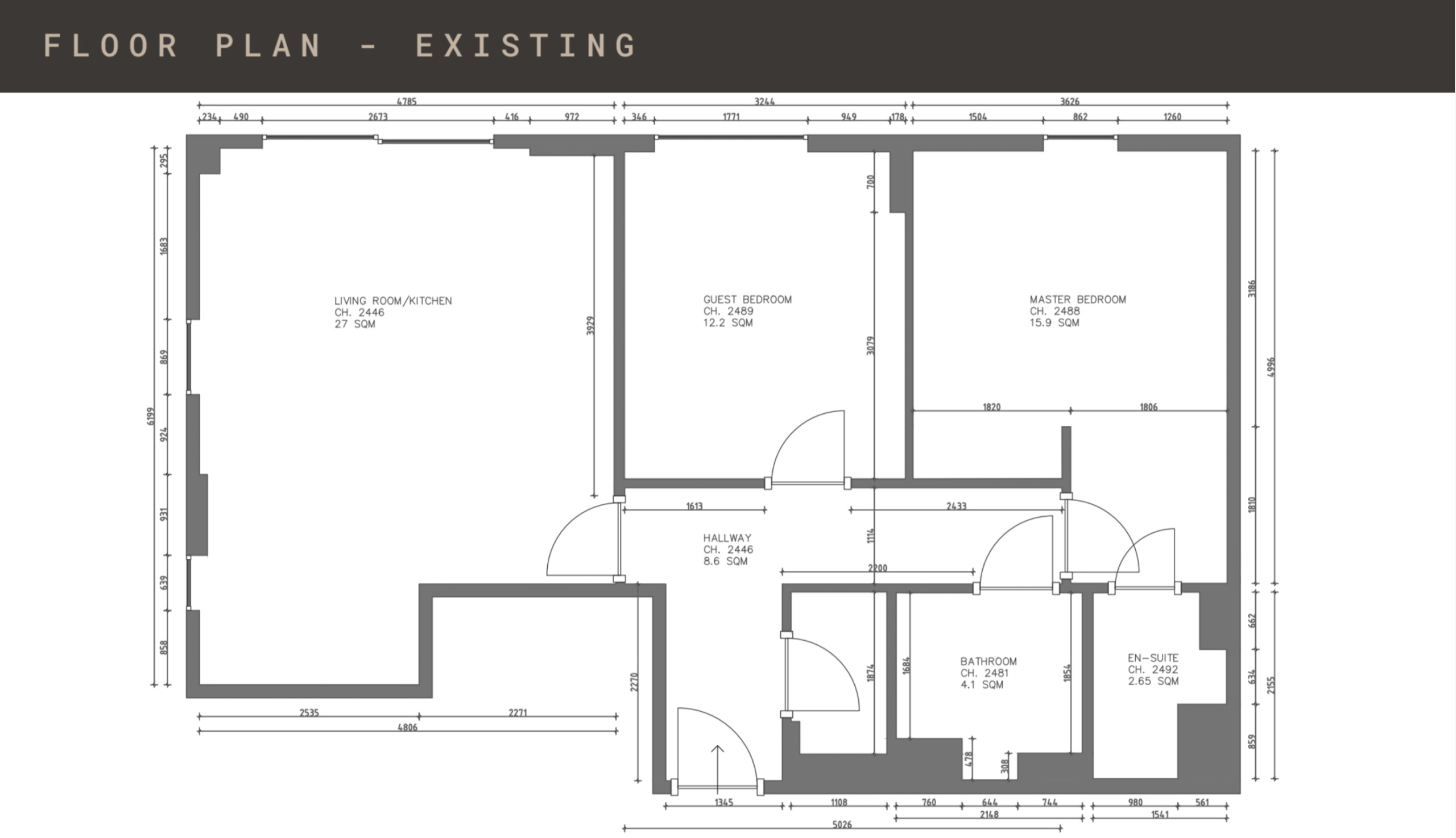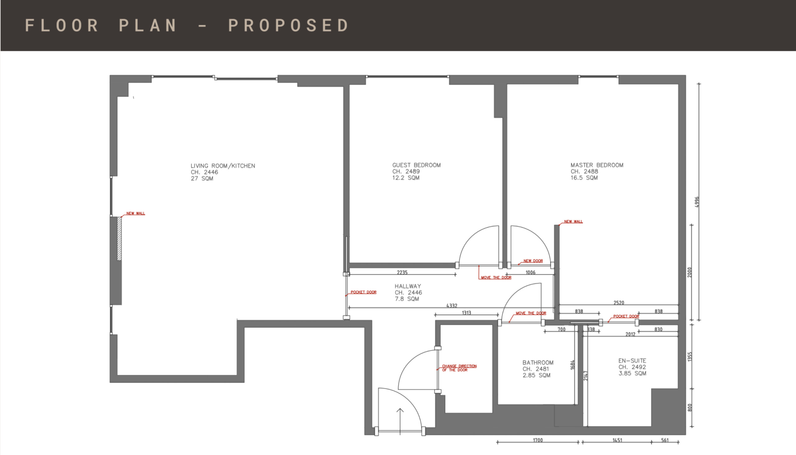Les propriétaires se sont d’abord demandé s’il était intéressant, d’un point de vue spatial, d’avoir une grande suite de chambres à coucher au lieu de deux chambres et salles de bains séparées. Vous pouvez voir comment cela aurait pu fonctionner sur ce plan « avant » – les espaces se seraient bien rejoints.