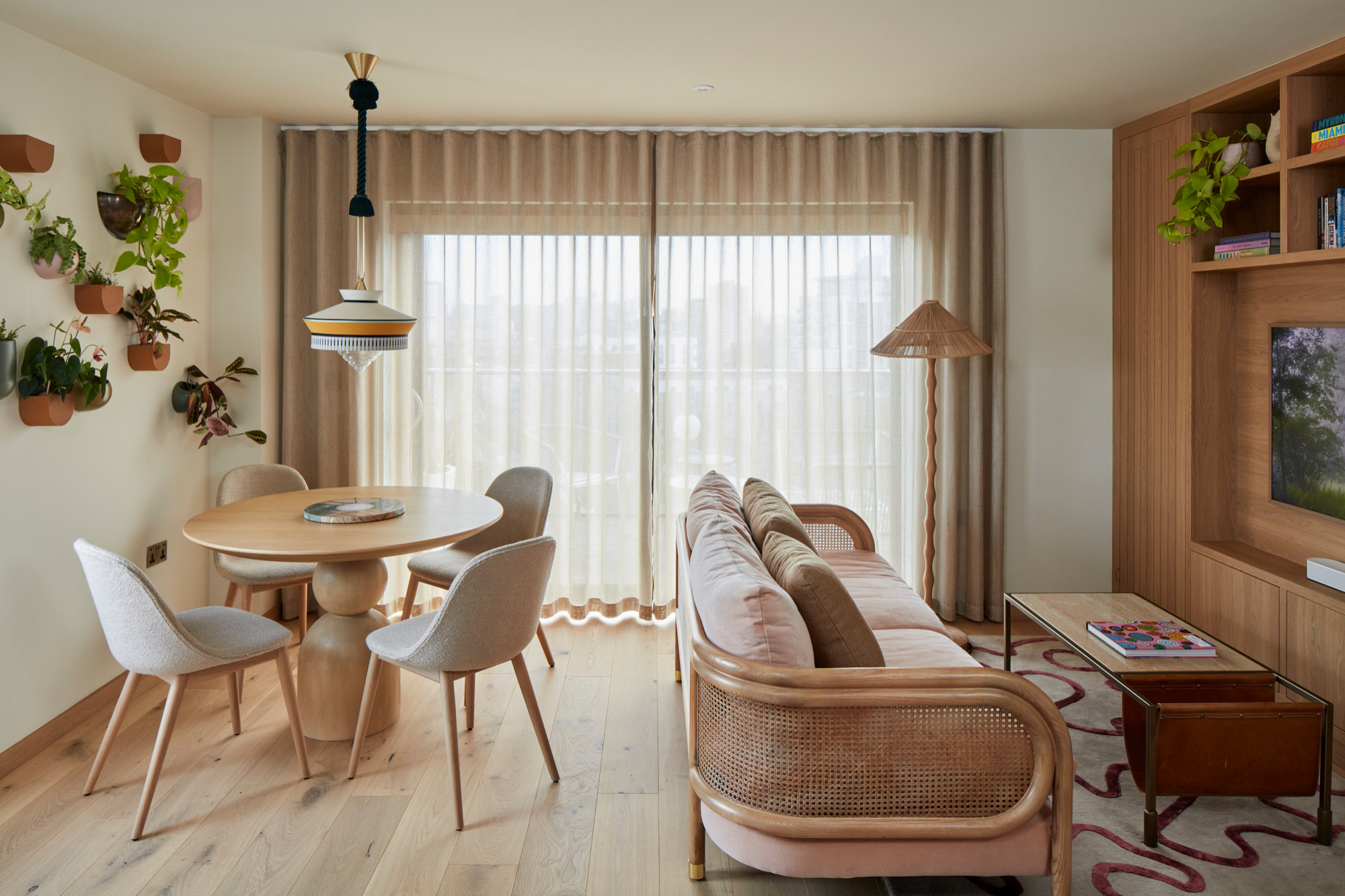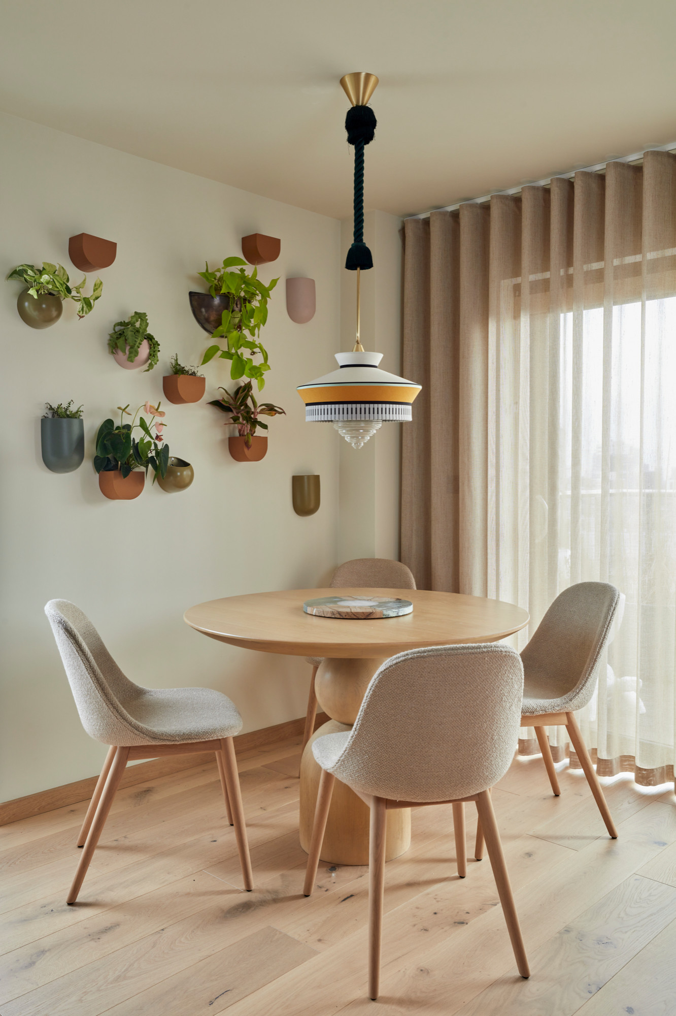 Le bar de petit déjeuner a été ingénieusement abaissé pour permettre l’utilisation de chaises de hauteur standard, ce qui réduit le nombre de meubles différents nécessaires dans ce petit espace, puisque ces chaises peuvent être rapprochées de la table à manger ou du canapé si des invités supplémentaires viennent à la maison. Ce design tout en courbes ajoute un détail doux et organique à l’espace.