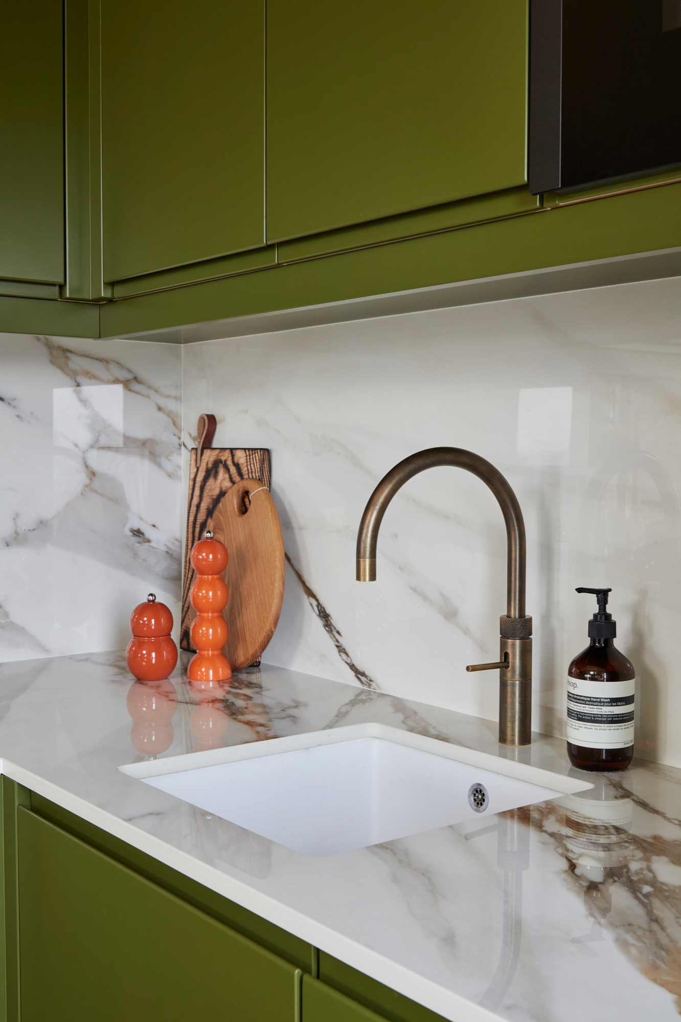 Le nouveau robinet finition bronze antique, avec distributeur d’eau bouillante, contribue également à rationaliser cette zone, laissant la machine à café des propriétaires comme seul appareil présent sur le plan de travail.