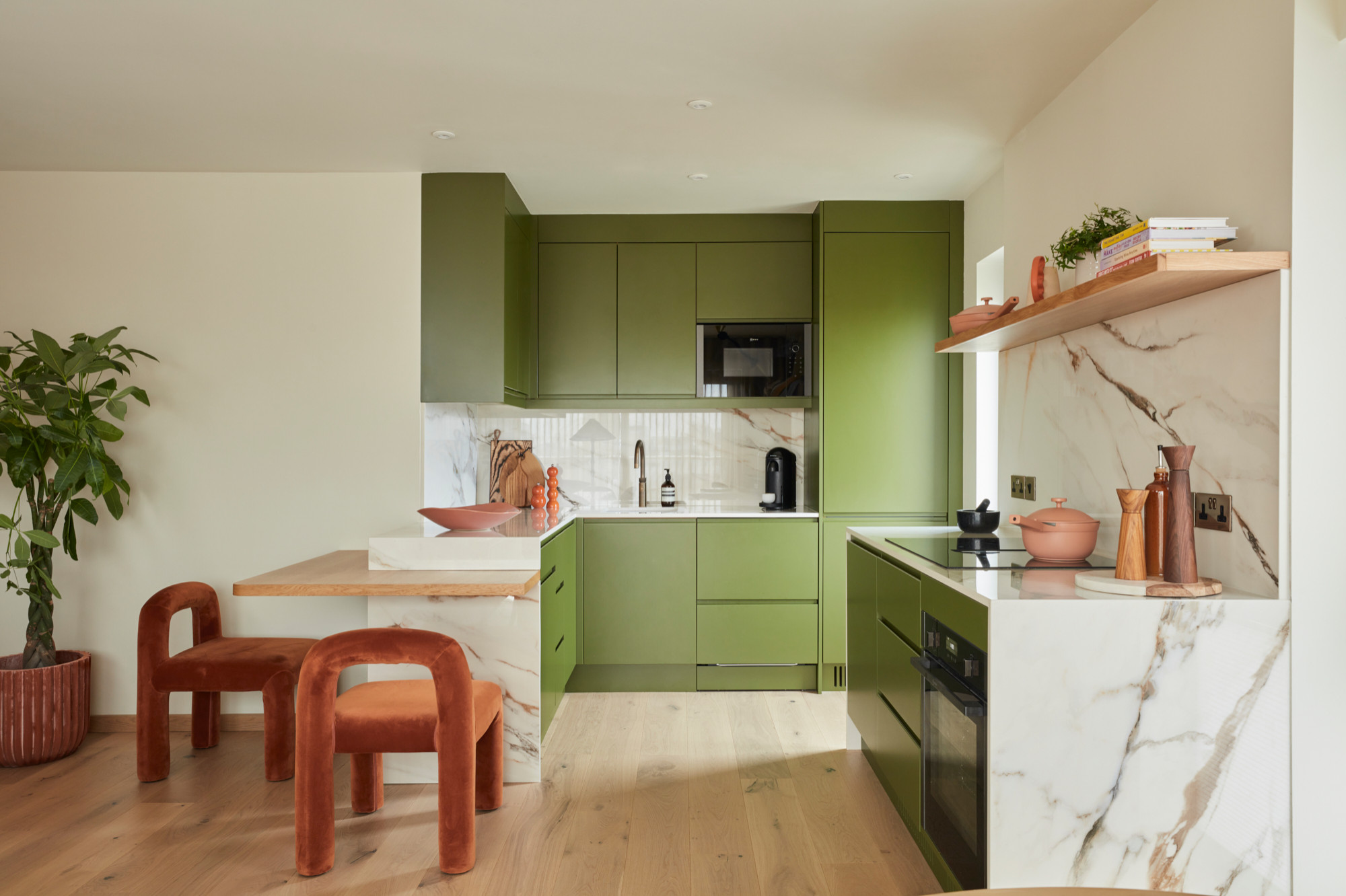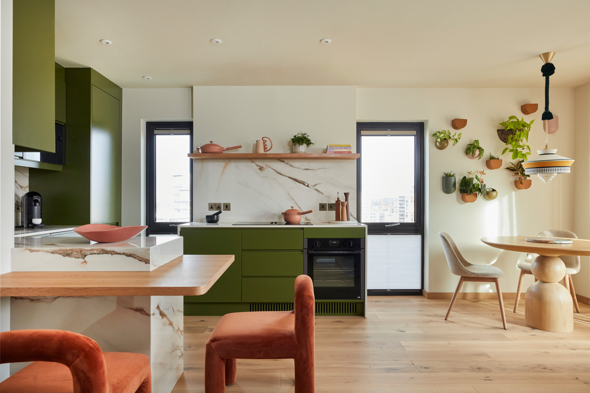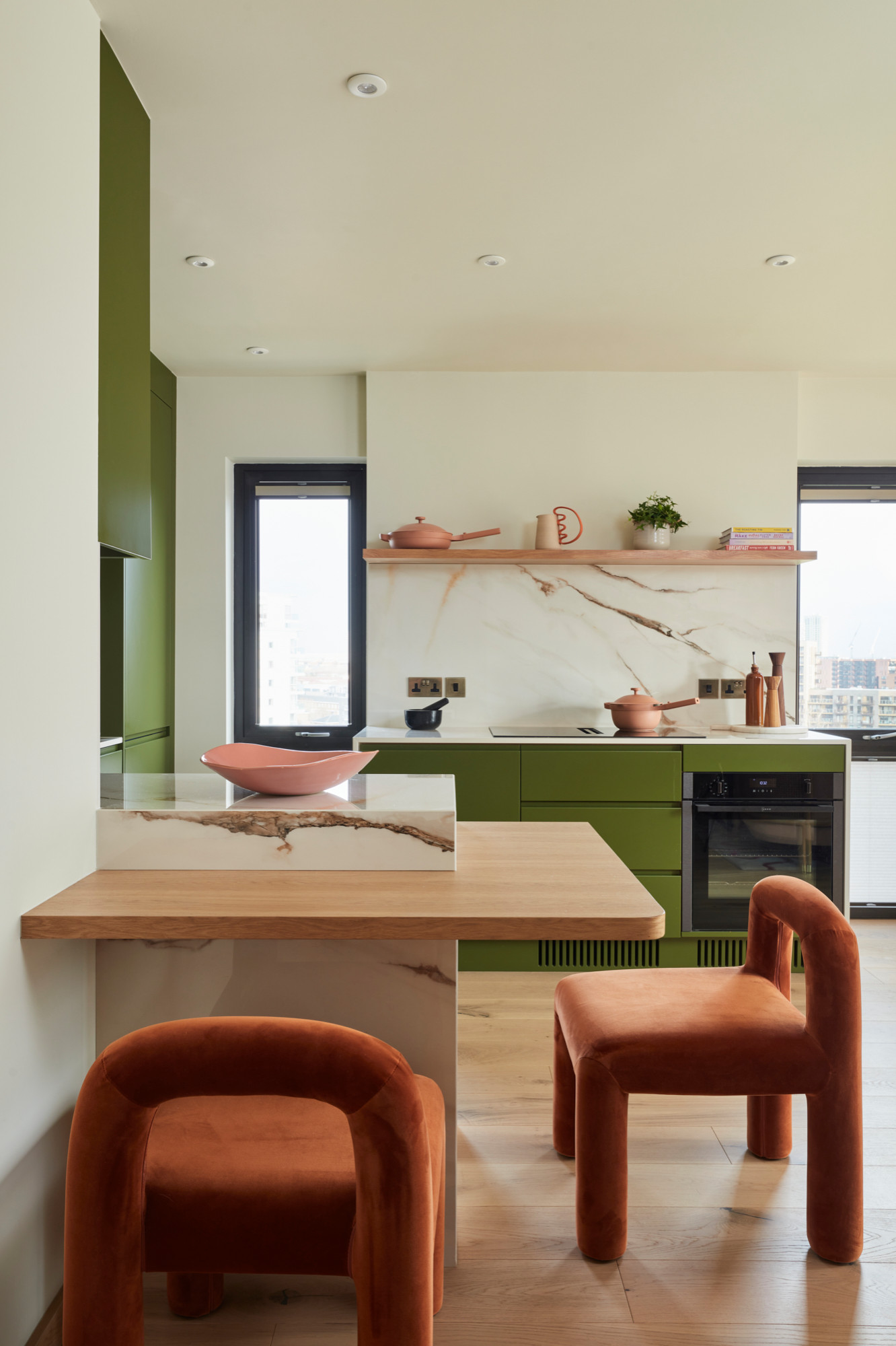 La couleur vert olive des armoires s’harmonise parfaitement avec les chaises en velours de couleur rouille et les tons de bois pâle. Omar a choisi le vert pour évoquer la nature.