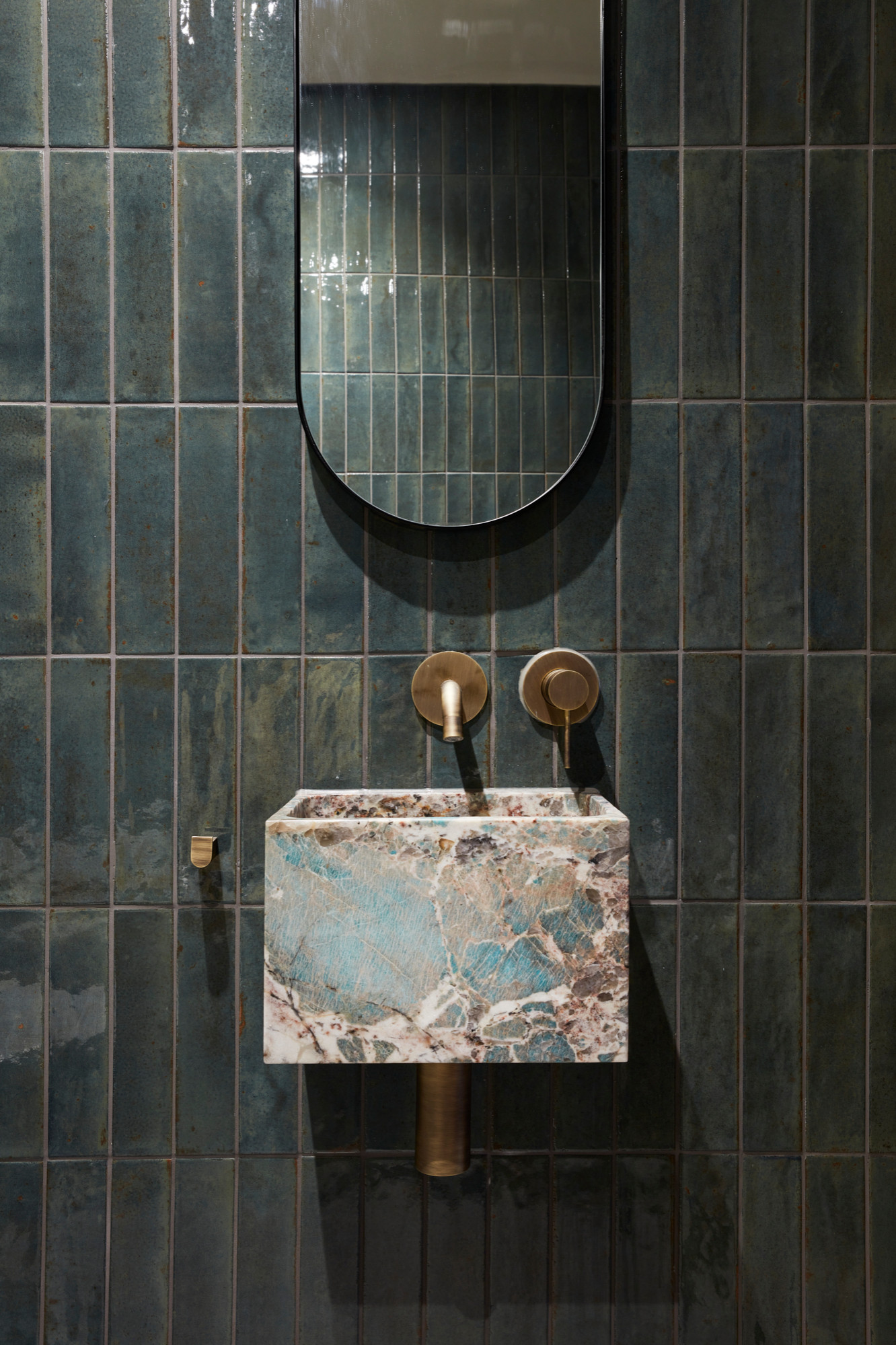 Carreaux Raku Verde Oliva, New Image Tiles. Vasque, Lusso Stone.