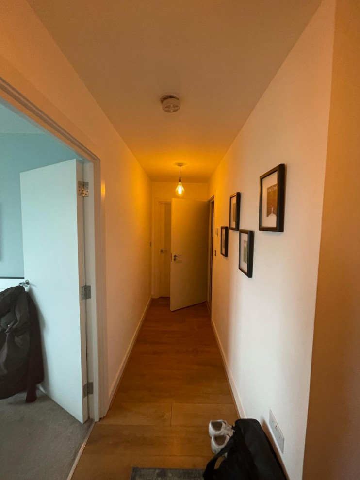 Après. La porte de l’espace de vie principal donne sur ce couloir, avec la porte d’entrée hors champ sur la gauche, derrière le banc que vous pouvez apercevoir.