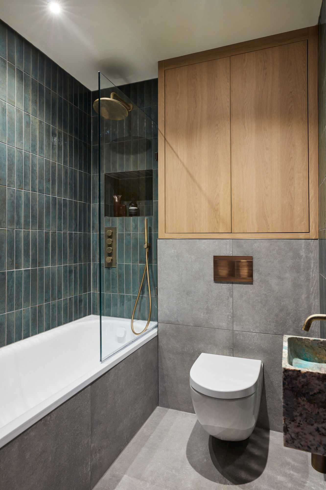 Carreaux muraux en porcelaine gris moyen District (au-dessus de la salle de bains) : Mandarin Stone ; armoires en chêne, conçues par Space Shack et fabriquées par Priest Furniture.
