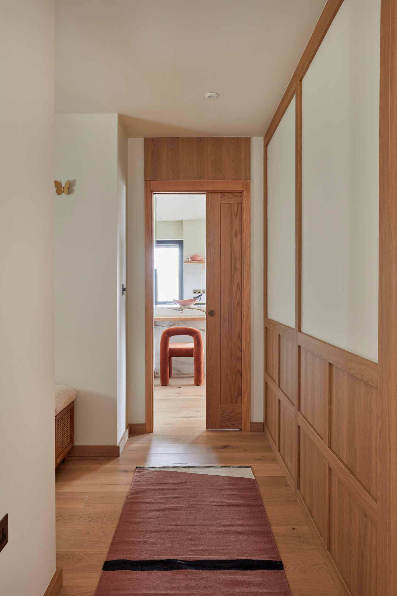 D’autres lambris en chêne ont été posés sur la partie inférieure des murs. « Les gens négligent souvent les couloirs et n’y consacrent pas de budget », poursuit-il, « mais les couloirs sont si importants. Qu’il s’agisse de meubles, d’un choix de peinture ou de lambris, le fait d’avoir un détail qui facilite la transition [vers d’autres pièces] permet de relier le tout sur le plan esthétique – surtout dans un appartement. »