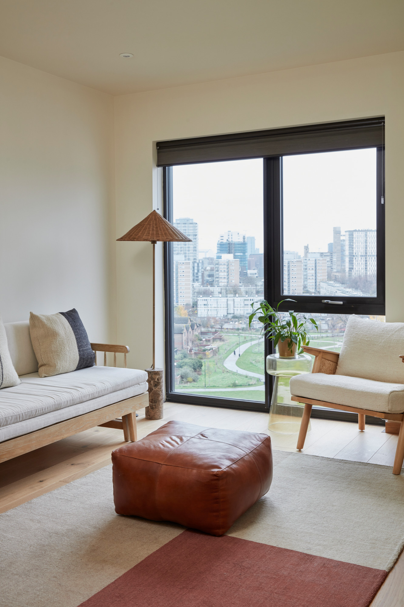 Canapé-lit : Loaf ; coussin : The Conran Shop ; fauteuil : Anthropologie ; lampadaire : Studio Sunneva ; pouf : Pacific Lifestyle ; tapis : Olivia’s.