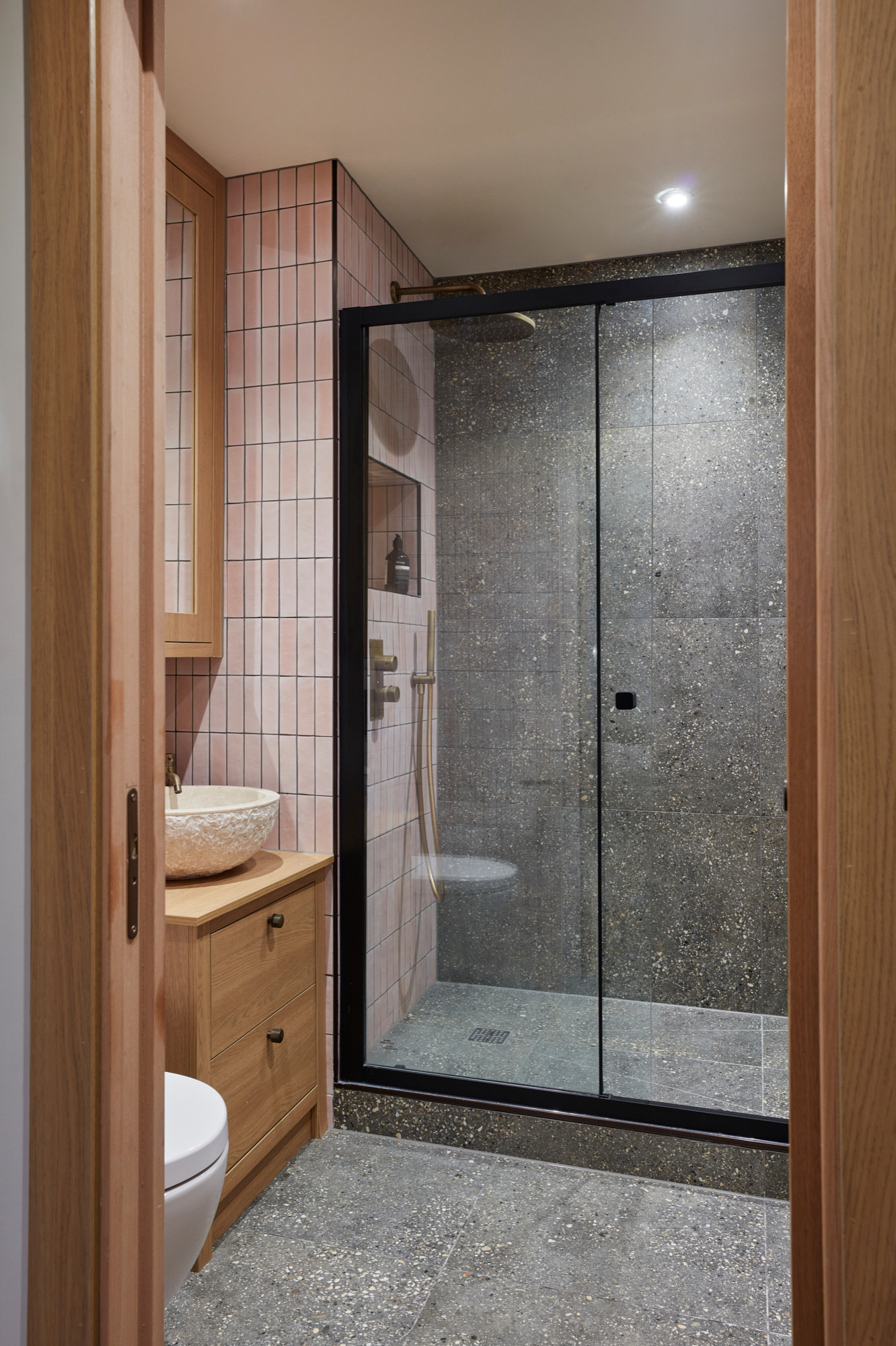 Poignées : Plank Hardware ; carreaux Hendrix Moss Terrazzo Effect, Mandarin Stone ; carreaux roses : South Cliff, Fired Earth ; bac à douche : Victorian Plumbing ; Vasque : Tikamoon.