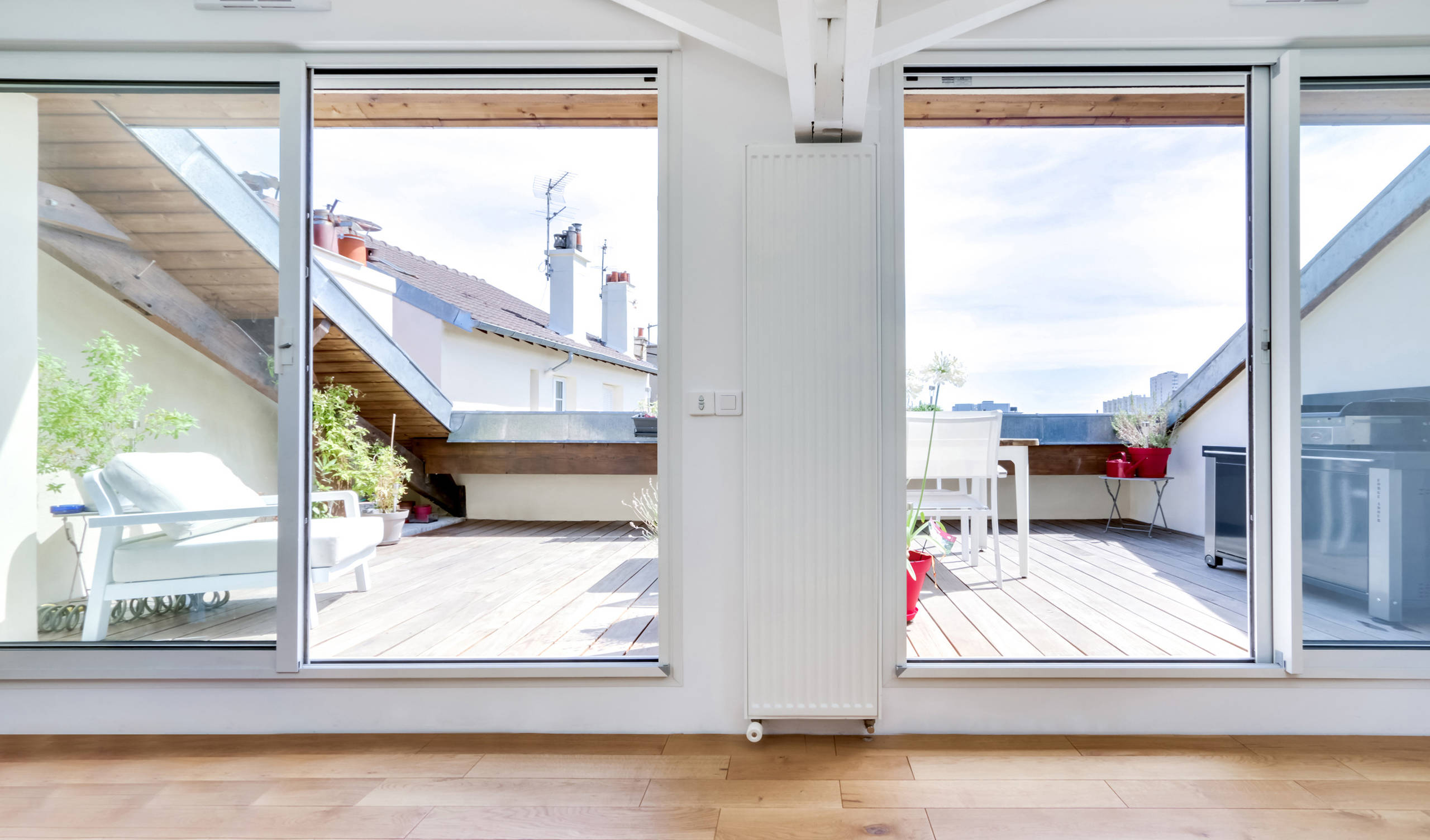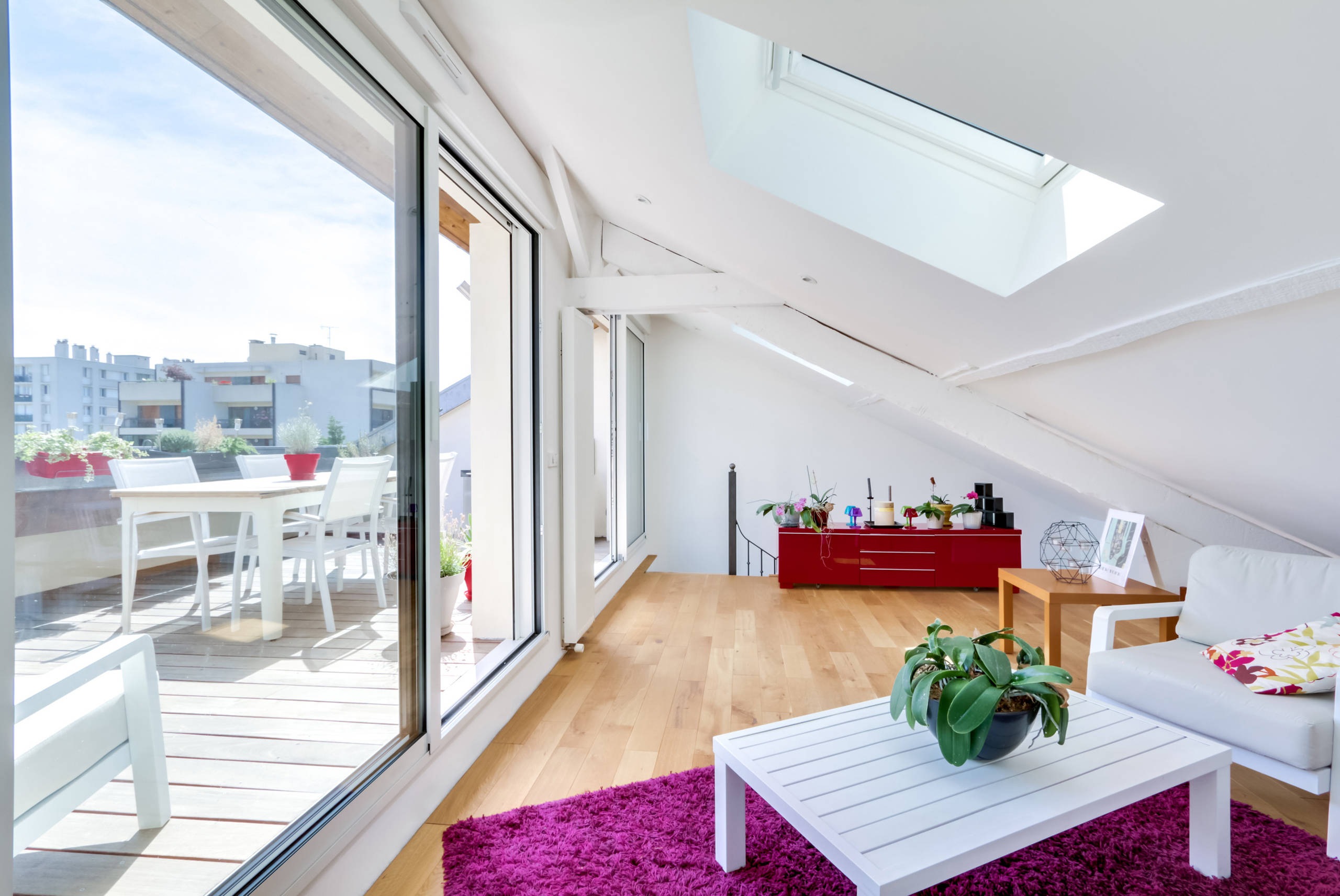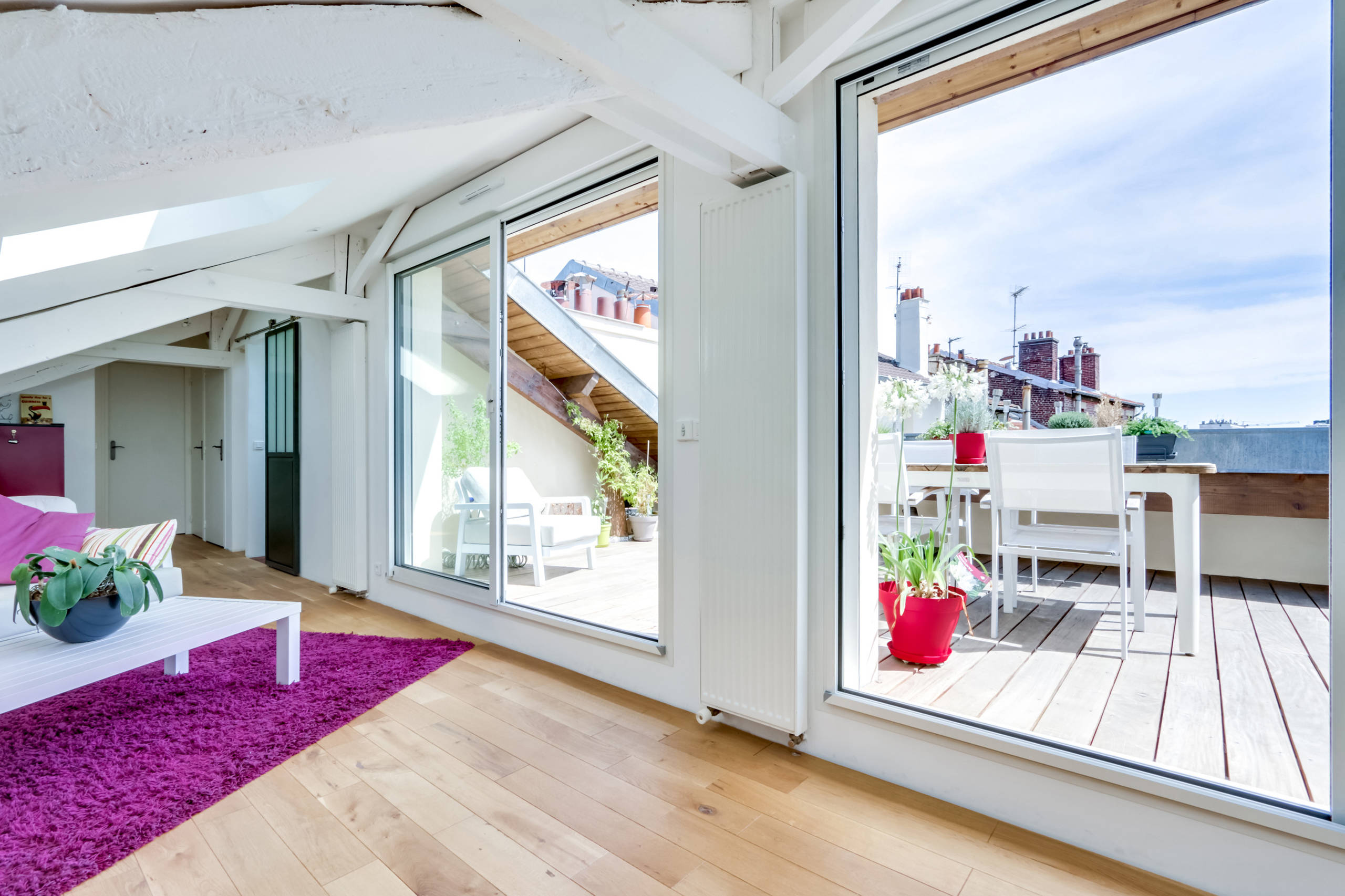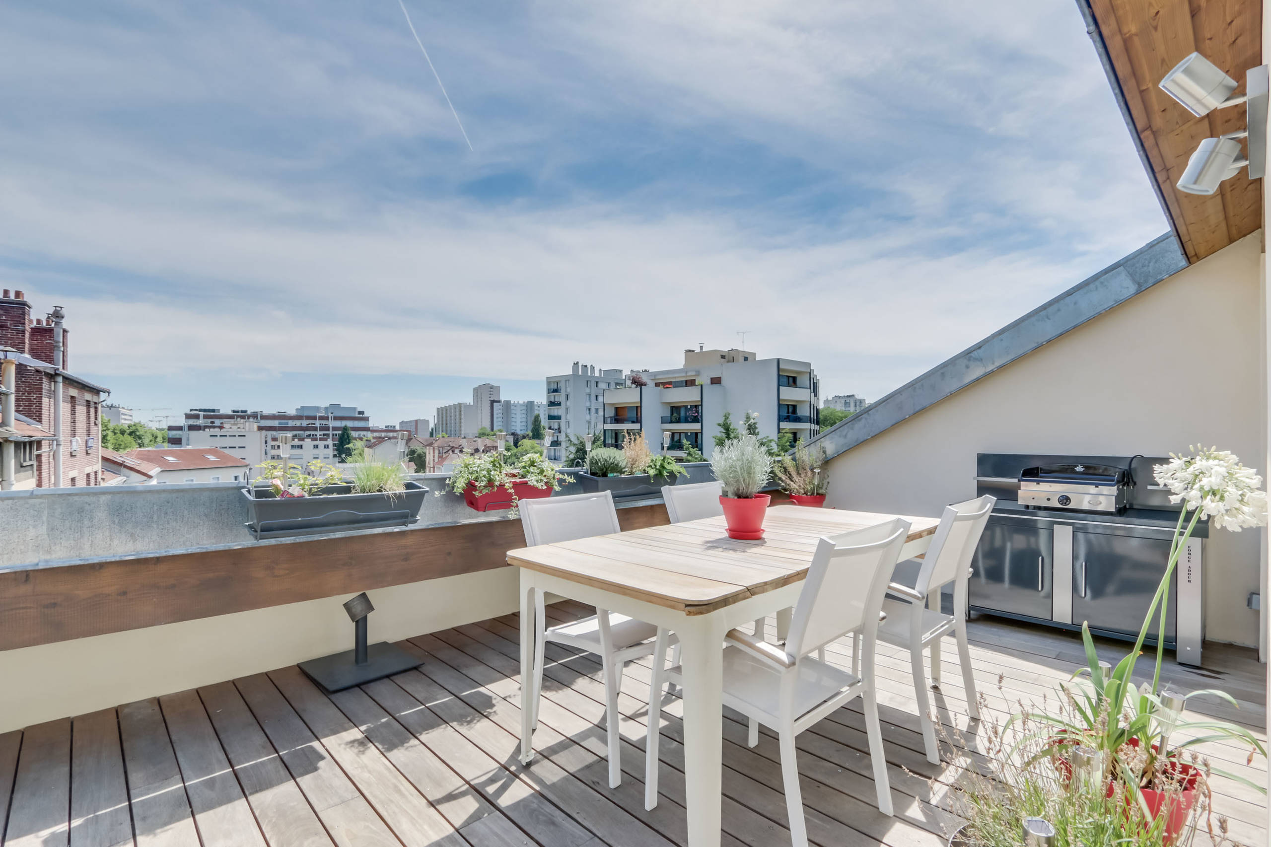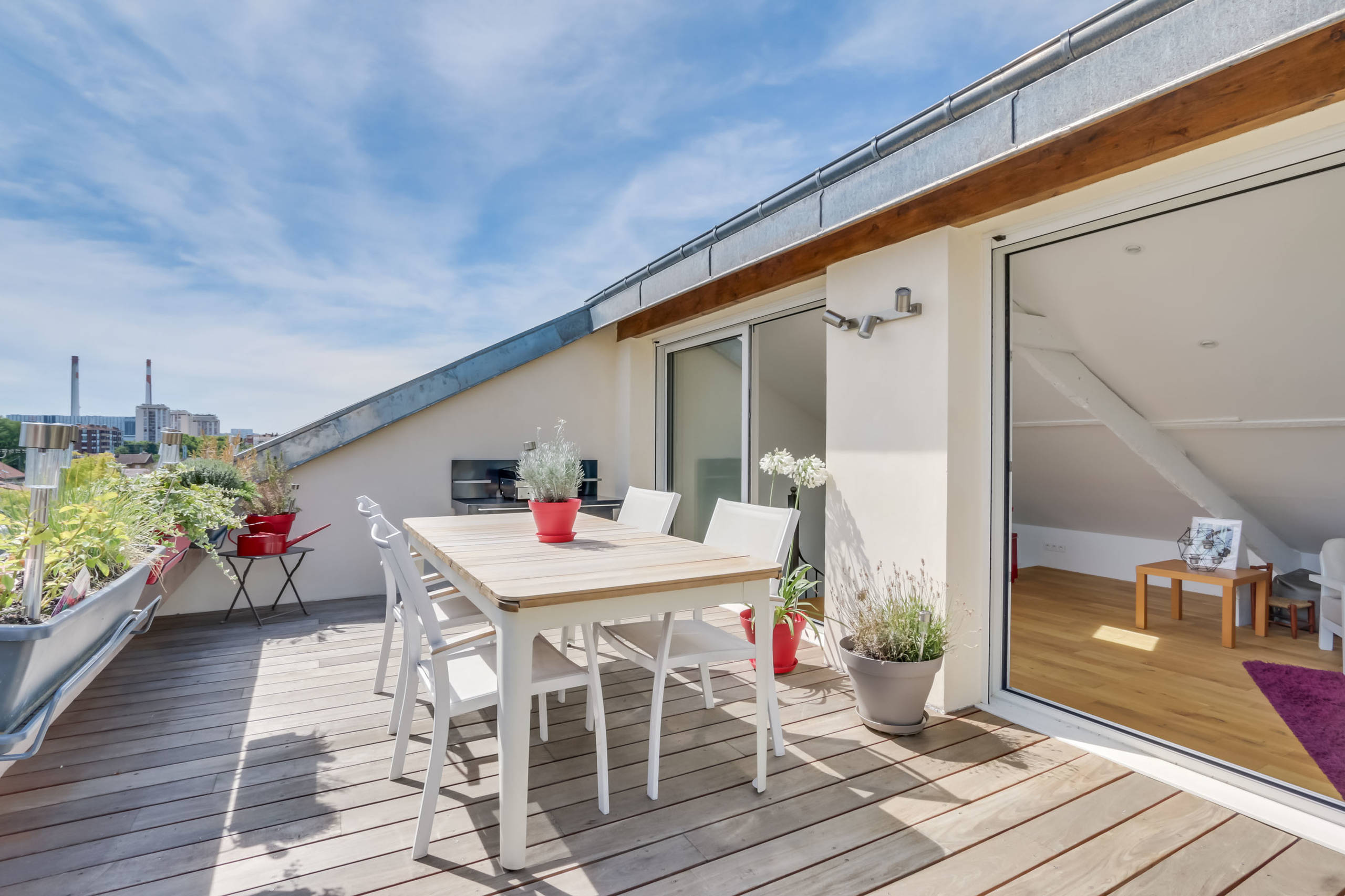 La terrasse de 16 m² est aménagée de ce côté de l’appartement pour bénéficier d’une exposition plein sud. Nichée sur le toit de l’immeuble, elle offre une très belle vue sur les cheminées de la ville et les arbres du grand boulevard situé en dessous.
