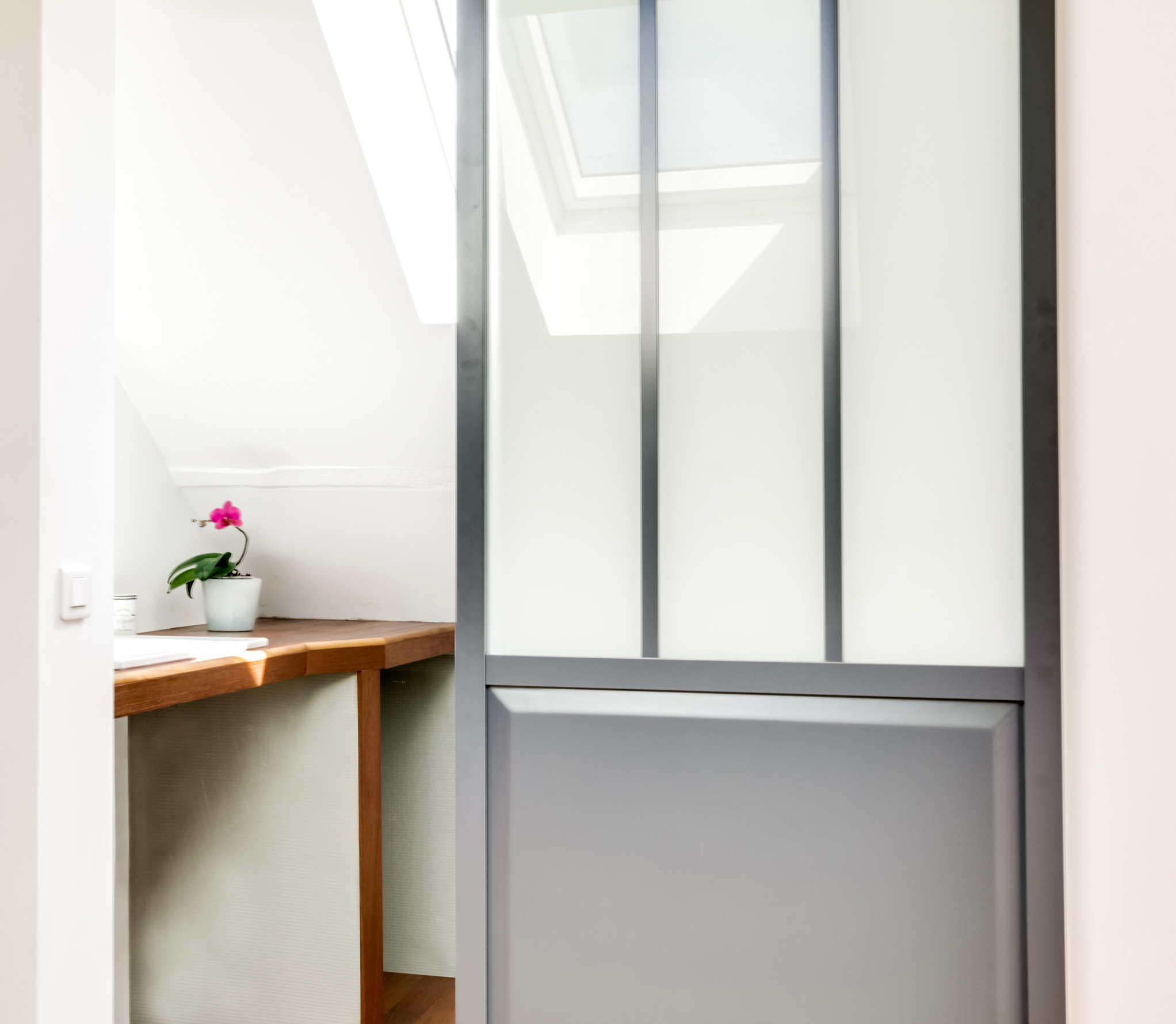 La pièce est fermée par une porte coulissante pour gagner de la place. Vitrée, elle laisse circuler la lumière entre les espaces et son style industriel répond à celui de l’escalier.