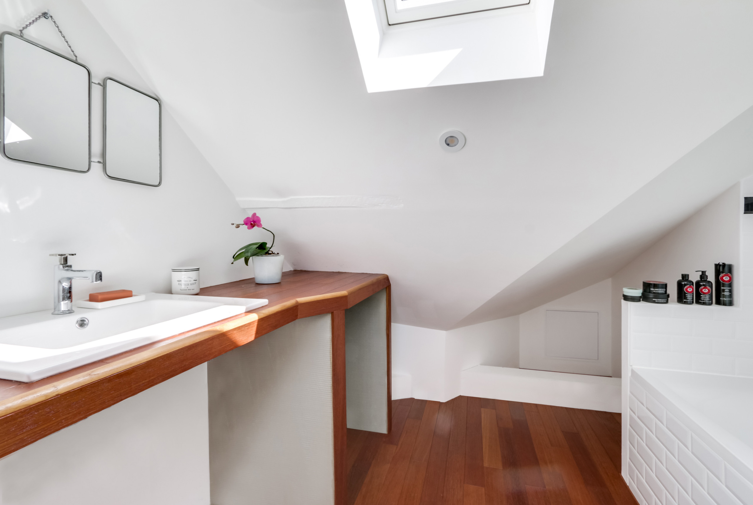 Le sol et le plan vasque sont en teck et un carrelage métro habille la baignoire. Une niche a été créée en prévision du futur lave-linge, à l’origine du décroché dans le plan de travail, et le petit local technique du fond sera fermé avec un rangement.