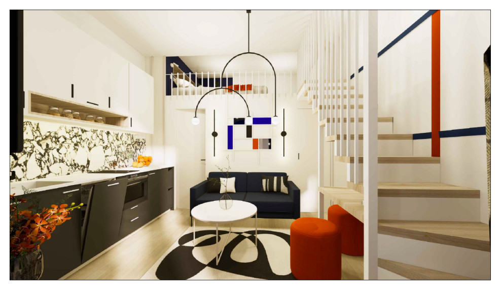 Après. Une fois mise à la location, la studette a toutefois rencontré plusieurs critiques. Les visiteurs ont souligné le peu de rangements disponibles et un autre problème plus gênant encore, à savoir le manque de hauteur d’échappée de l’escalier qui faisait que les locataires se cognaient régulièrement en montant sur la mezzanine. Pour couronner l’état des lieux, le décor noir et blanc, choisi à l’origine pour sa consensualité, était sombre et avait du mal à tirer son épingle du jeu face à la concurrence.