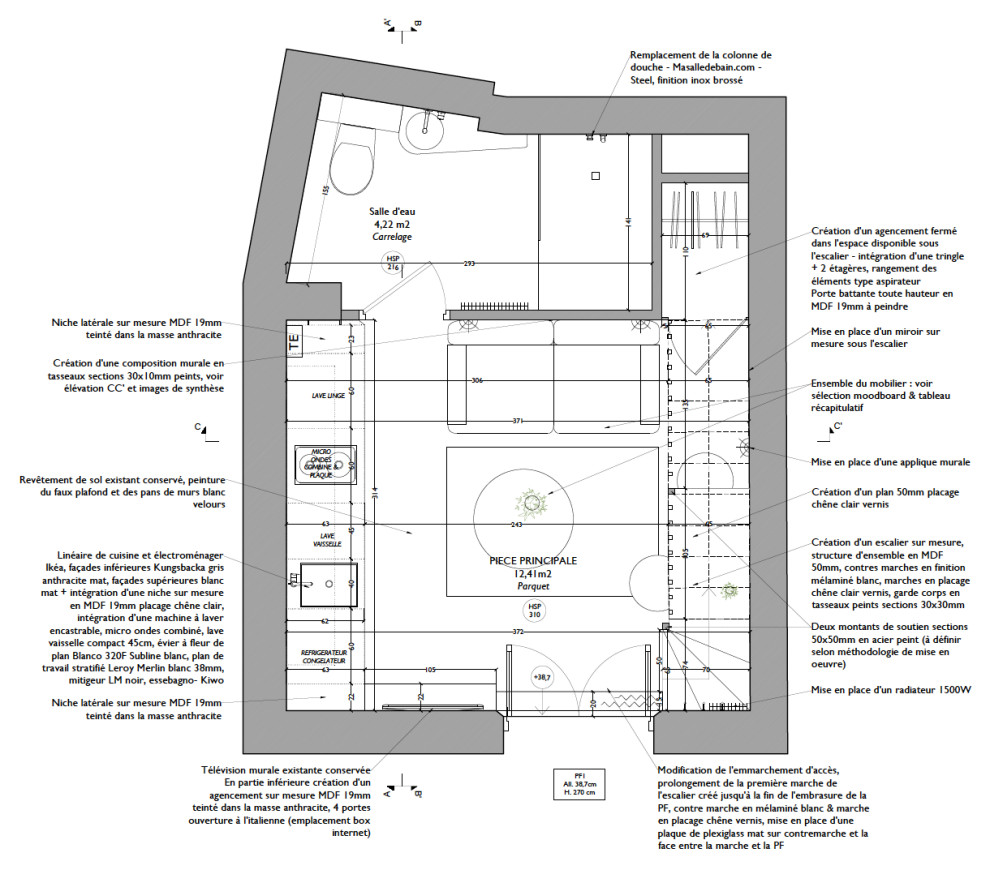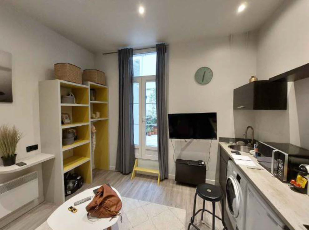 Au rez-de-chaussée sur cour d’un immeuble parisien du 3ᵉ arrondissement, ce micro-appartement d’exactement 16,6 m² se destine à la location meublée. Le propriétaire le possède depuis quelques années et l’a déjà rénové une première fois intégralement, mais les retours de ses visiteurs pointent deux défauts majeurs qu’il est nécessaire de corriger. Plus qu’une simple refonte ergonomique, le propriétaire est également en attente d’un décor qui fera repérer la studette face à la rude concurrence. Dans ce but, il fait appel à Alicia Oustry d’Ameo Concept, une architecte d’intérieur dont il a découvert sur Houzz les talents en la matière.