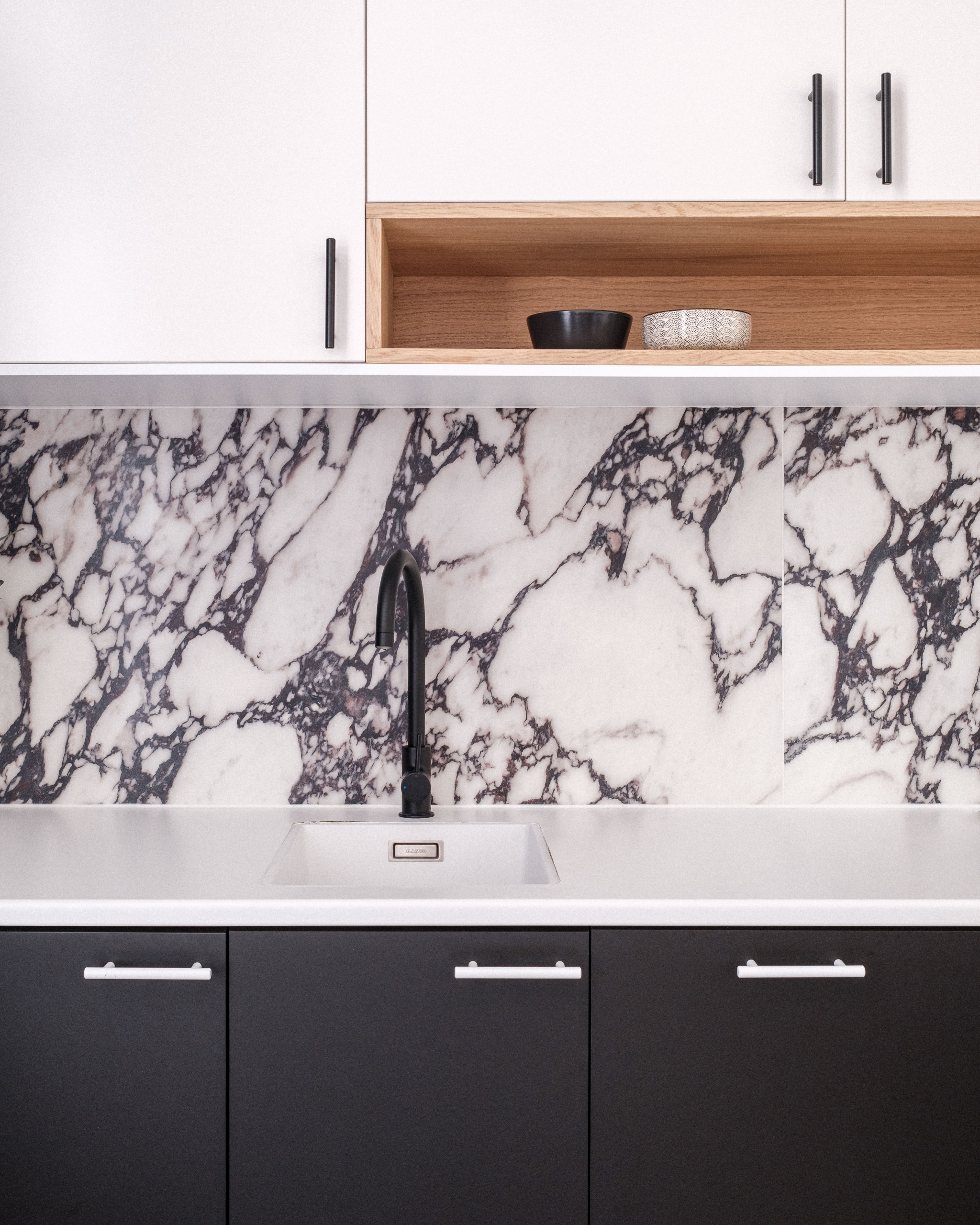 On note comment l’architecte d’intérieur est partie du décor noir et blanc que le propriétaire appréciait pour le sublimer. Le mobilier noir ancre la cuisine dans le sol avec élégance tandis que le mobilier blanc l’épure et l’allège vers le haut.
