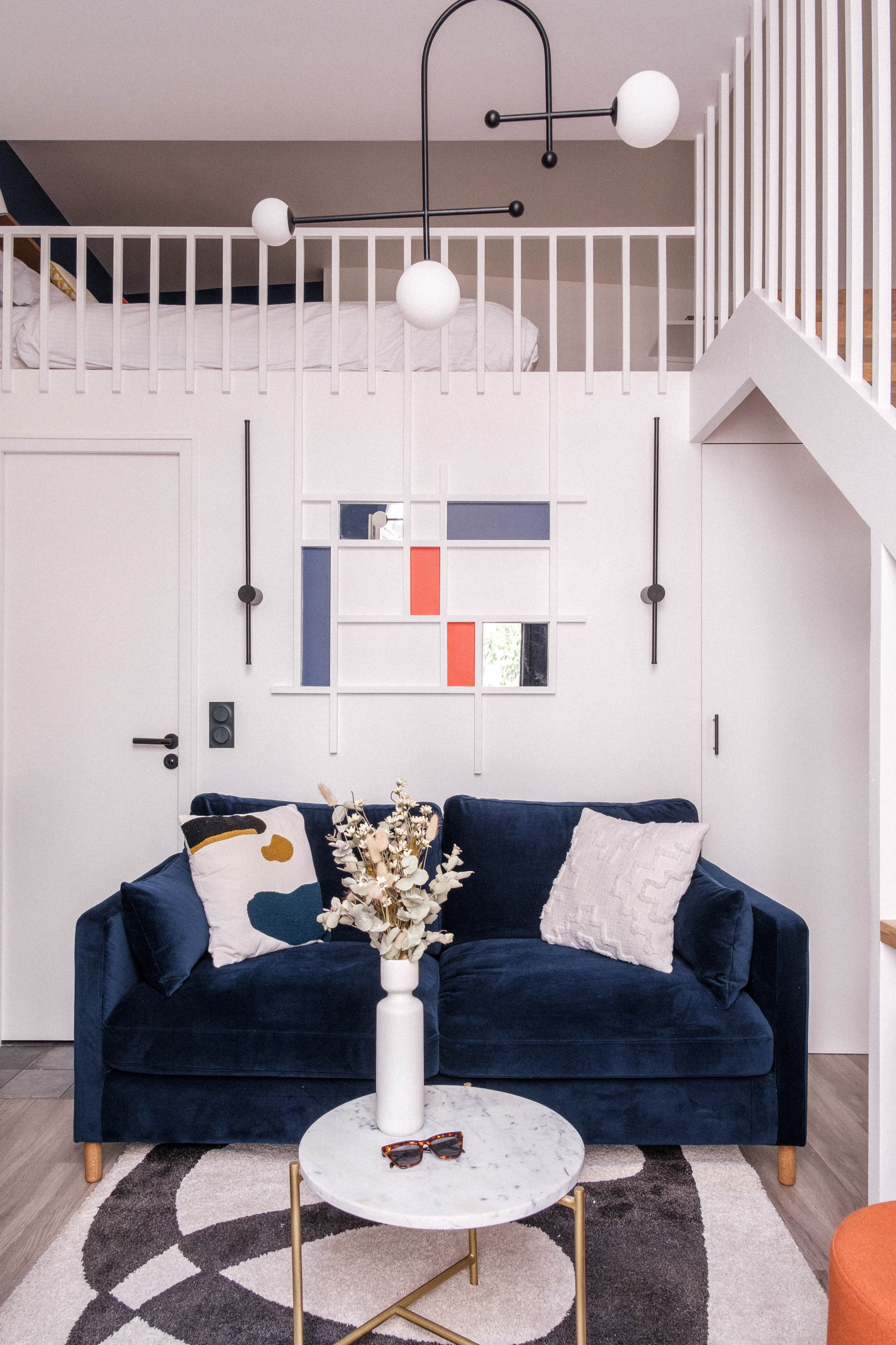 Alicia a réalisé elle-même l’œuvre graphique en se fondant sur les célèbres Composition de Mondrian, l’un des pères de l’art abstrait au début du XXᵉ siècle. Encadrée de deux appliques minimalistes de chez The Masie, elle l’a conçue avec des tasseaux, quelques notes bleues et terracotta et des miroirs pour ajouter de l’éclat et de la profondeur. « Une bonne astuce budget », glisse-t-elle.
