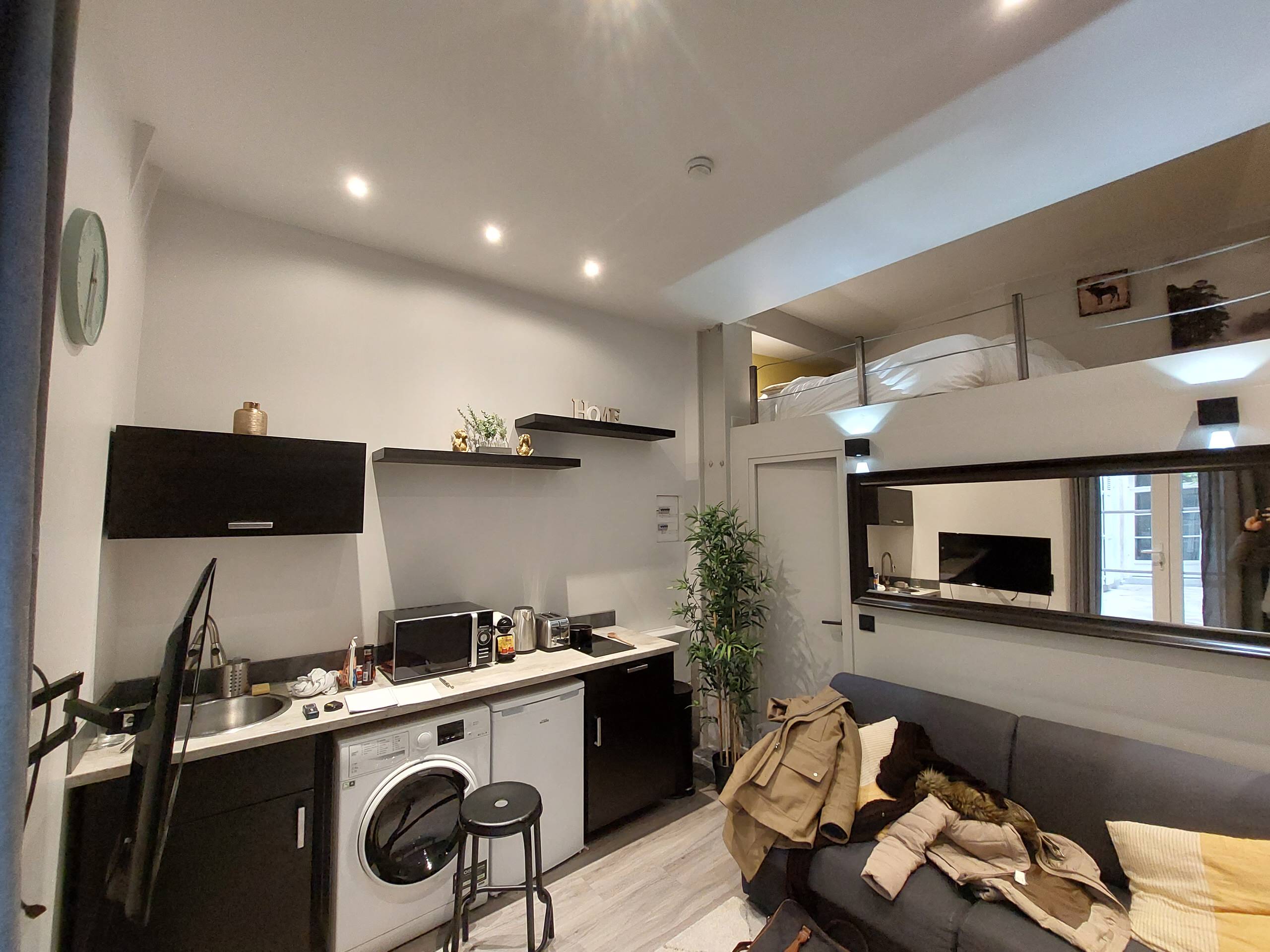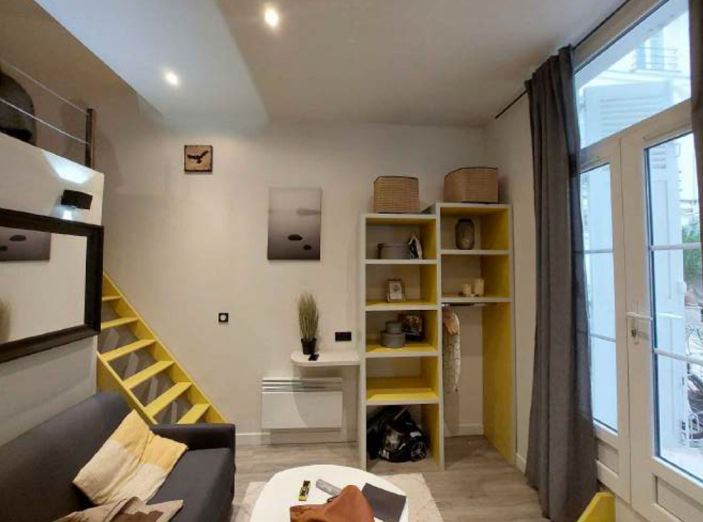 Avant. Proposer à la location pour un couple une studette de moins de 17 m² est un défi car il est nécessaire de faire oublier le peu de superficie habitable en offrant de jolies contreparties. En plein cœur du Marais, cette mini-surface avait pour elle sa belle situation et cet autre atout qui avait séduit son propriétaire lorsqu’il l’avait achetée : son atypique hauteur sous plafond de 3,10 mètres. Celle-ci lui a permis de placer le lit double au-dessus de la salle d’eau sur une mezzanine et de dégager à l’avant une pièce de vie carrée de 12 m², éclairée par la seule porte-fenêtre d’entrée.