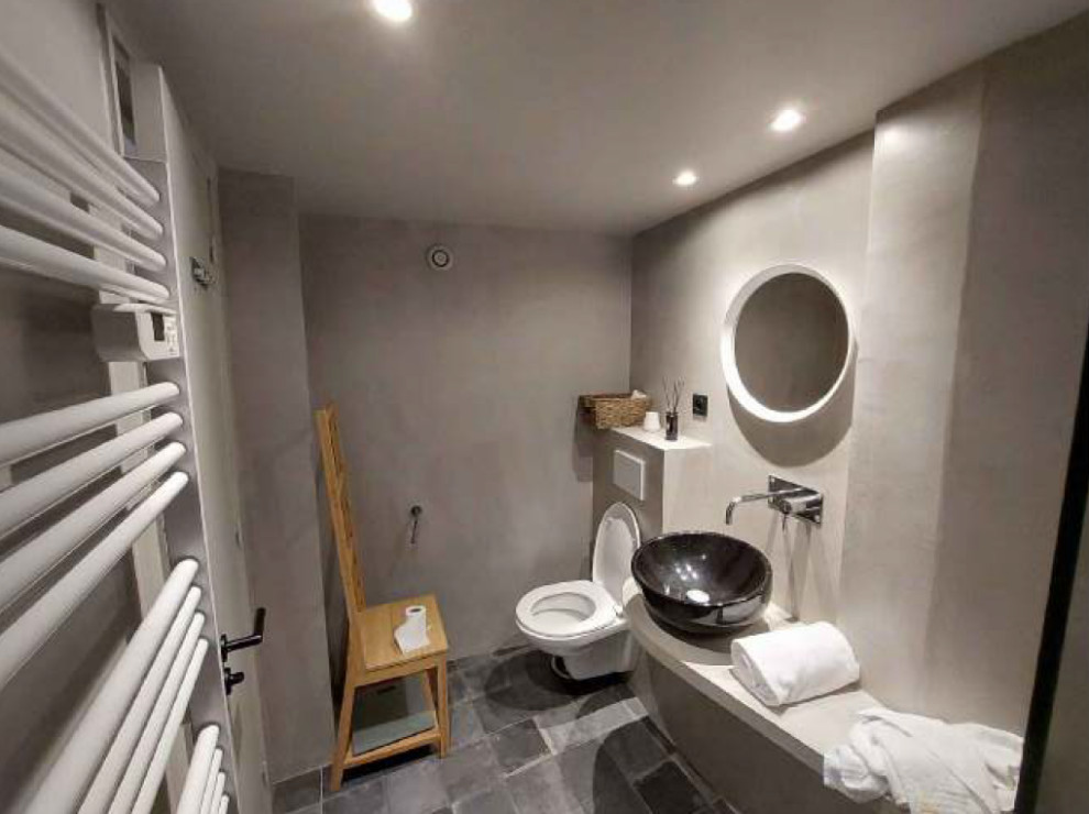 À gauche du canapé se trouve la porte vers la salle de bains existante. Pour une raison de budget autant que dans le souci éthique de ne pas déposer une zone récente et fonctionnelle, cette salle de bains à la généreuse douche de 140 centimètres de long n’a pas été modifiée.