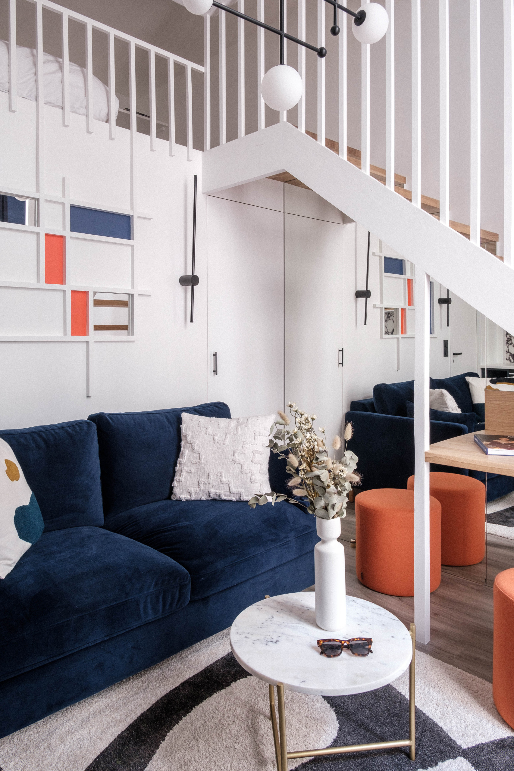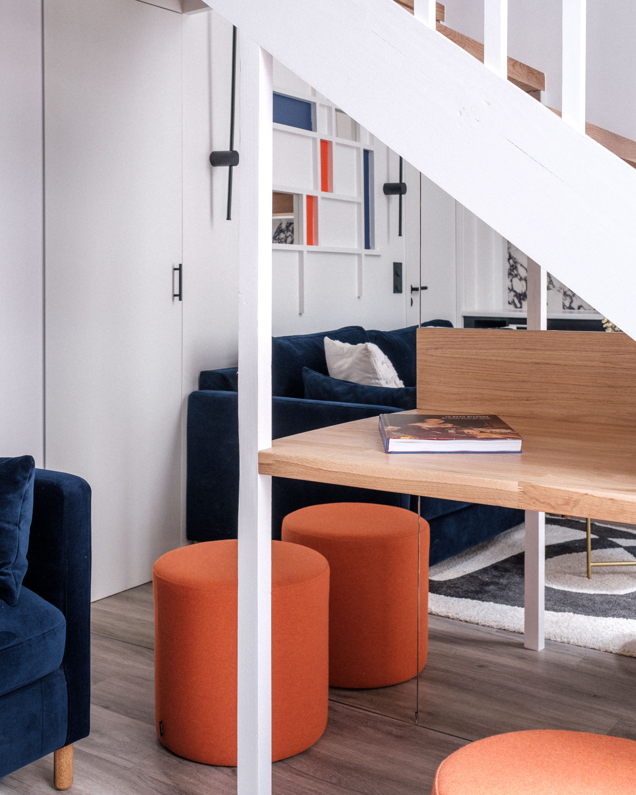 « La clé du nouvel aménagement repose sur l’escalier magistral, conçu comme un meuble sculpture », dévoile Alicia, qui a d’abord posé cet élément dans ses plans avant de construire autour un gracieux univers graphique en se basant sur une « inspiration Mondrian libre ». L’escalier a été à la fois agrandi et avancé dans la surface, de sorte à commencer dès l’entrée de la pièce, sur la droite.