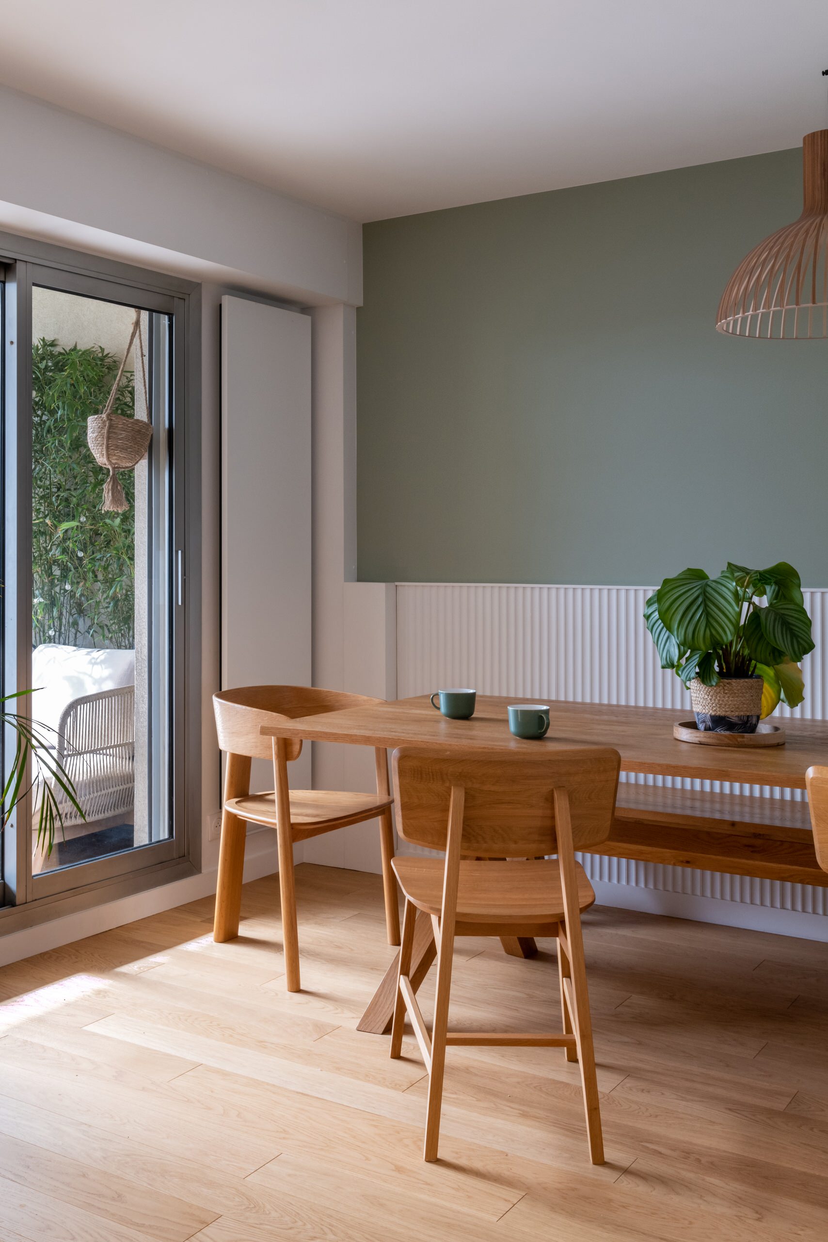 Après. Très lumineuse, la salle à manger s’ouvre sur un balcon plein sud dont la vue s’étend jusqu’à Paris. La famille disposait déjà du mobilier en chêne : un élément qui a d’ailleurs aidé l’architecte à trouver l’harmonie qui les a emballés.