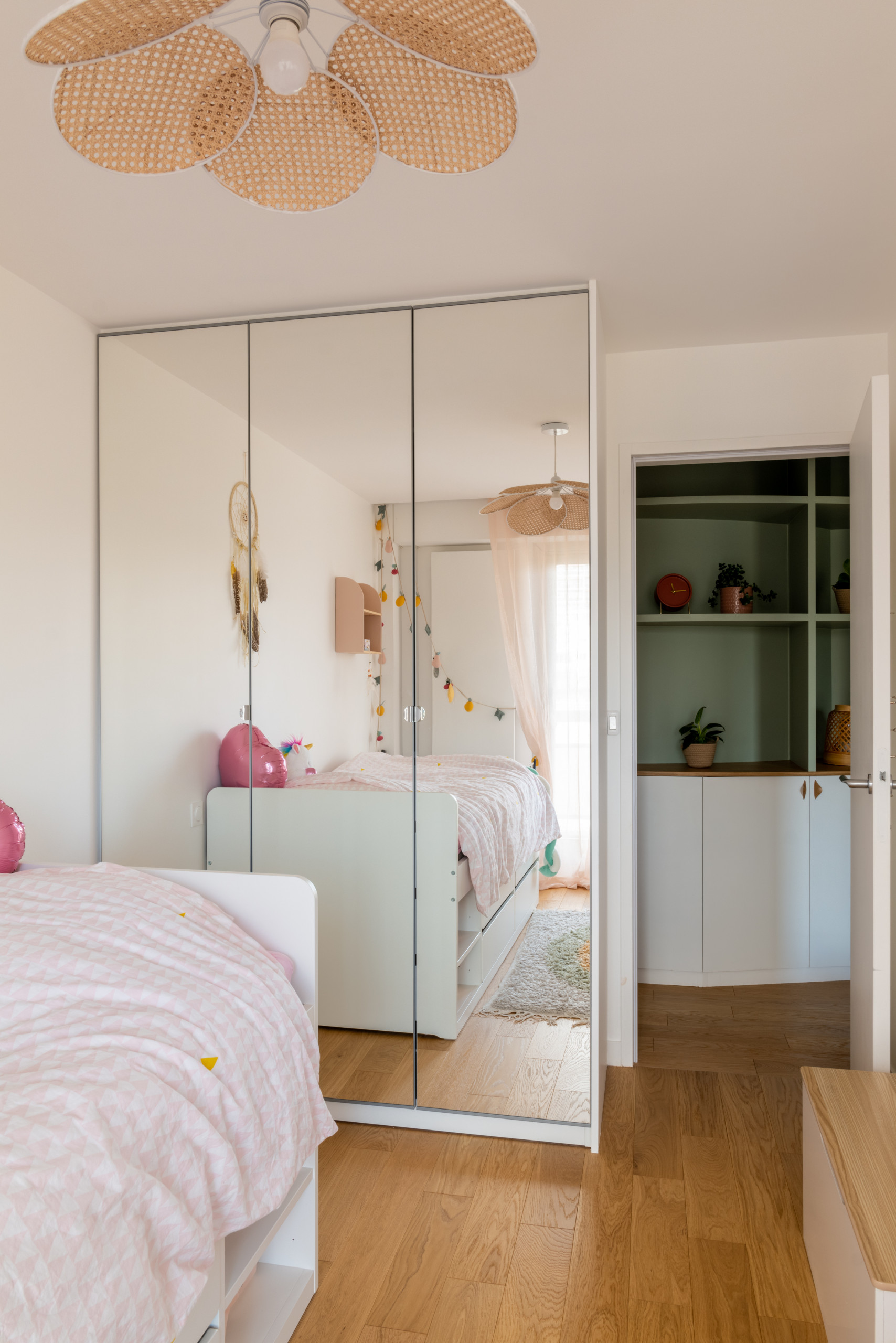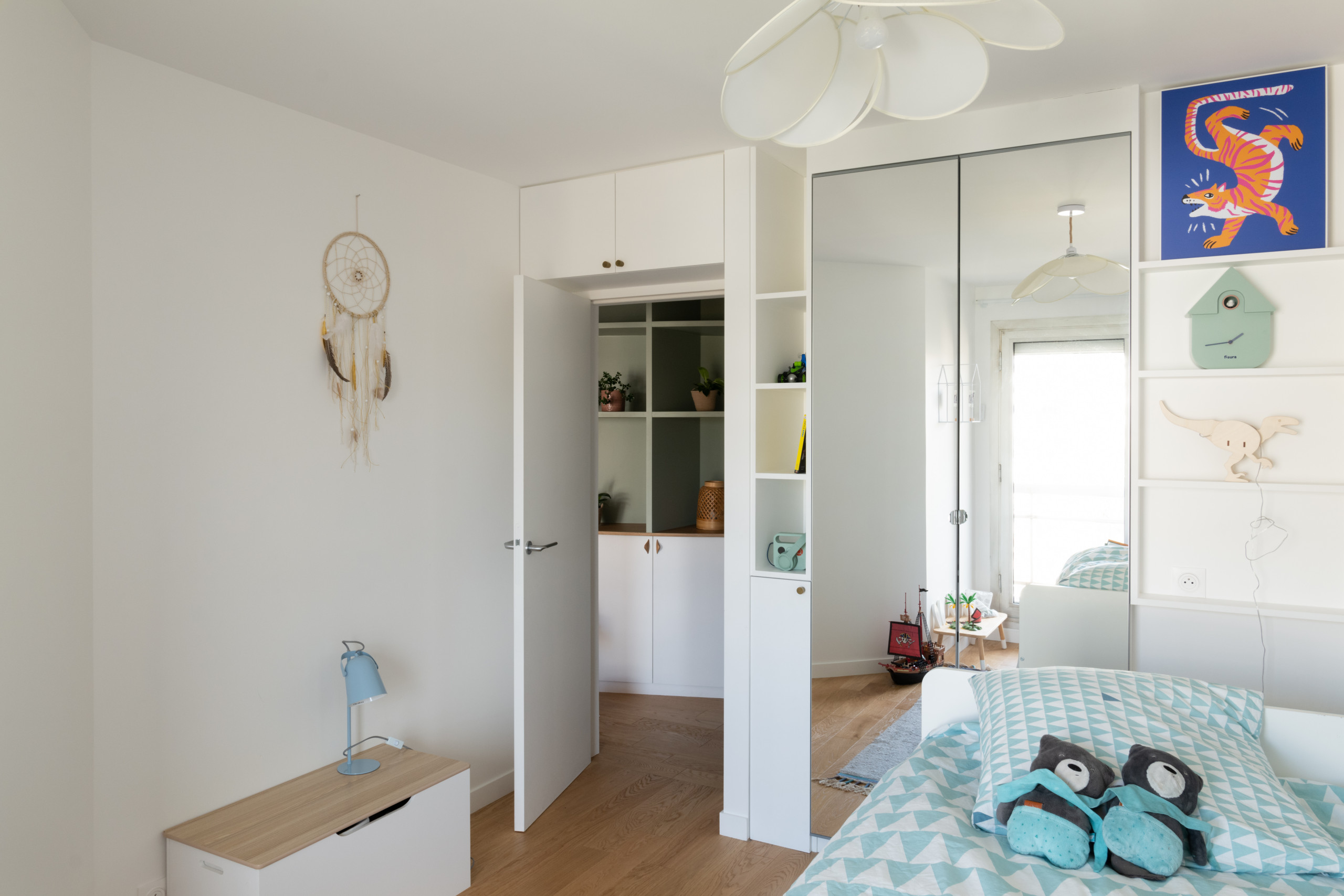 Cette chambre, dédiée à l’un des jeunes garçons de la famille, a fait l’objet d’une lourde rénovation car elle résulte de la métamorphose de la cuisine d’antan. « Nous avons aménagé chaque chambre sur le même modèle avec une superficie supérieure à 9 m² et un linéaire de 1,50 mètre de rangements paré d’une façade miroir. Un bureau a également été intégré dans chaque chambre » partage la pro.