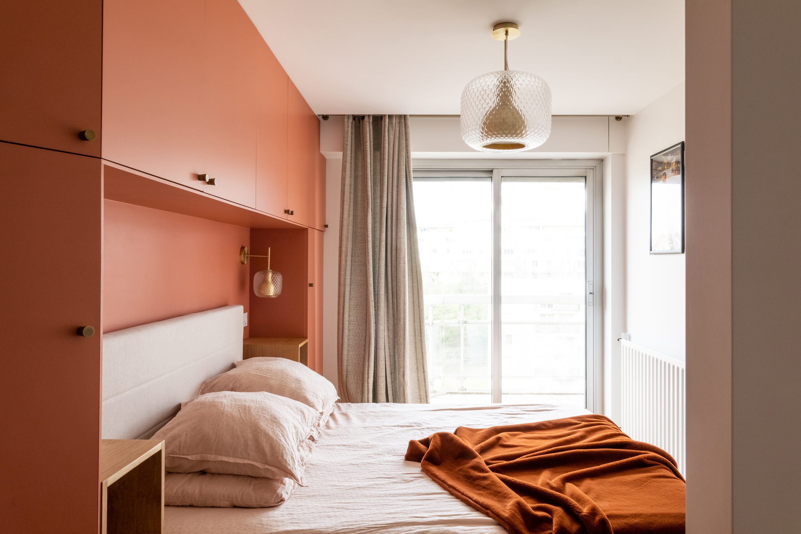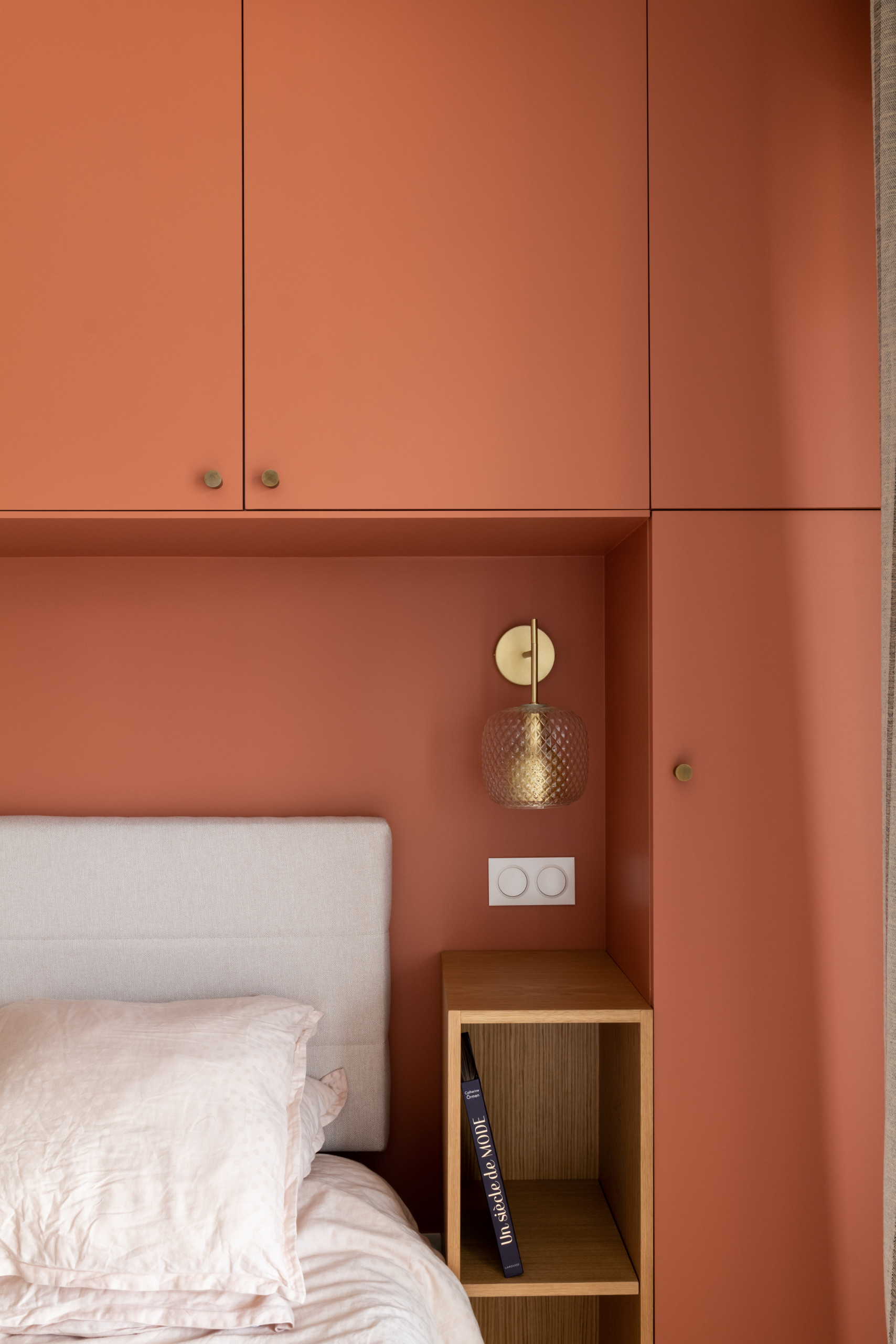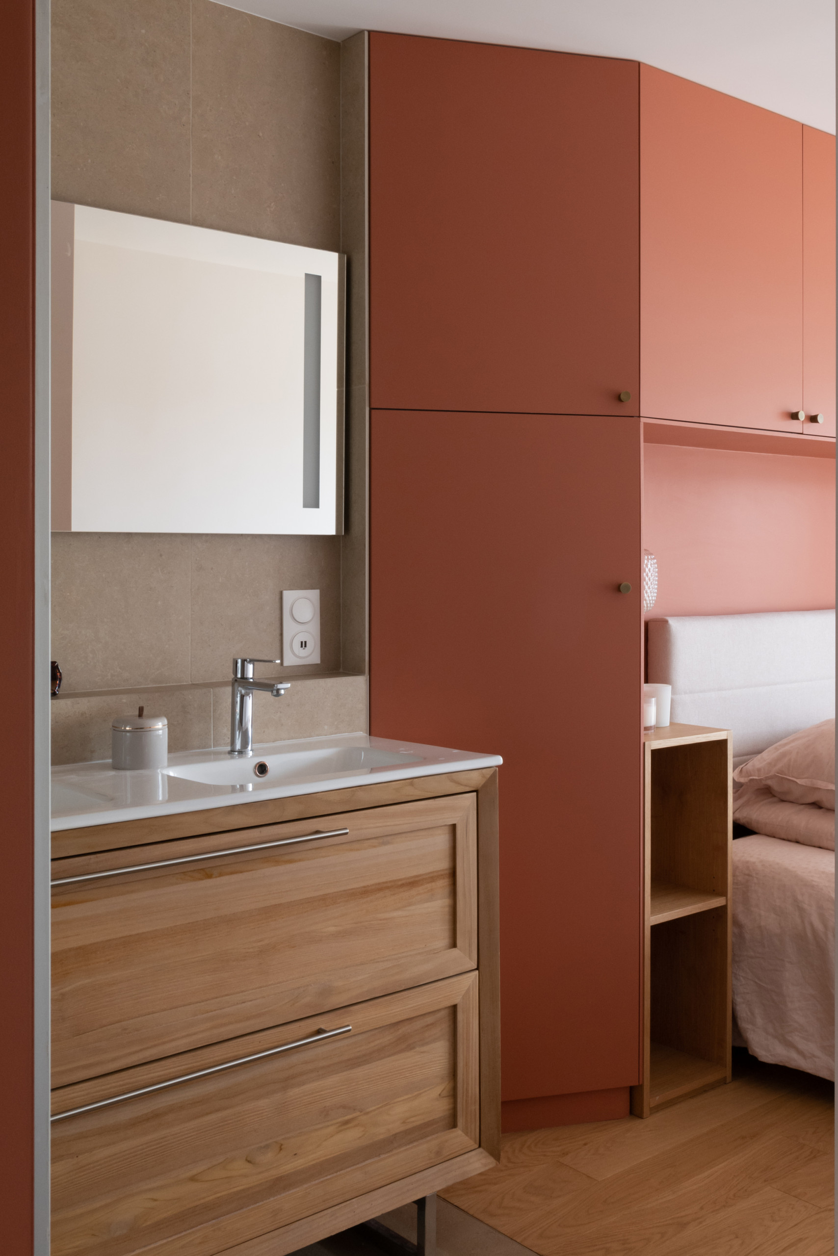 Après. La suite parentale a été stratégiquement positionnée à l’extrémité du couloir pour minimiser les nuisances sonores provenant du reste de l’appartement. Sa palette de couleurs est dominée par des tons chauds et naturels évoquant l’ocre rouge, en contraste avec le vert amande des pièces de vie.