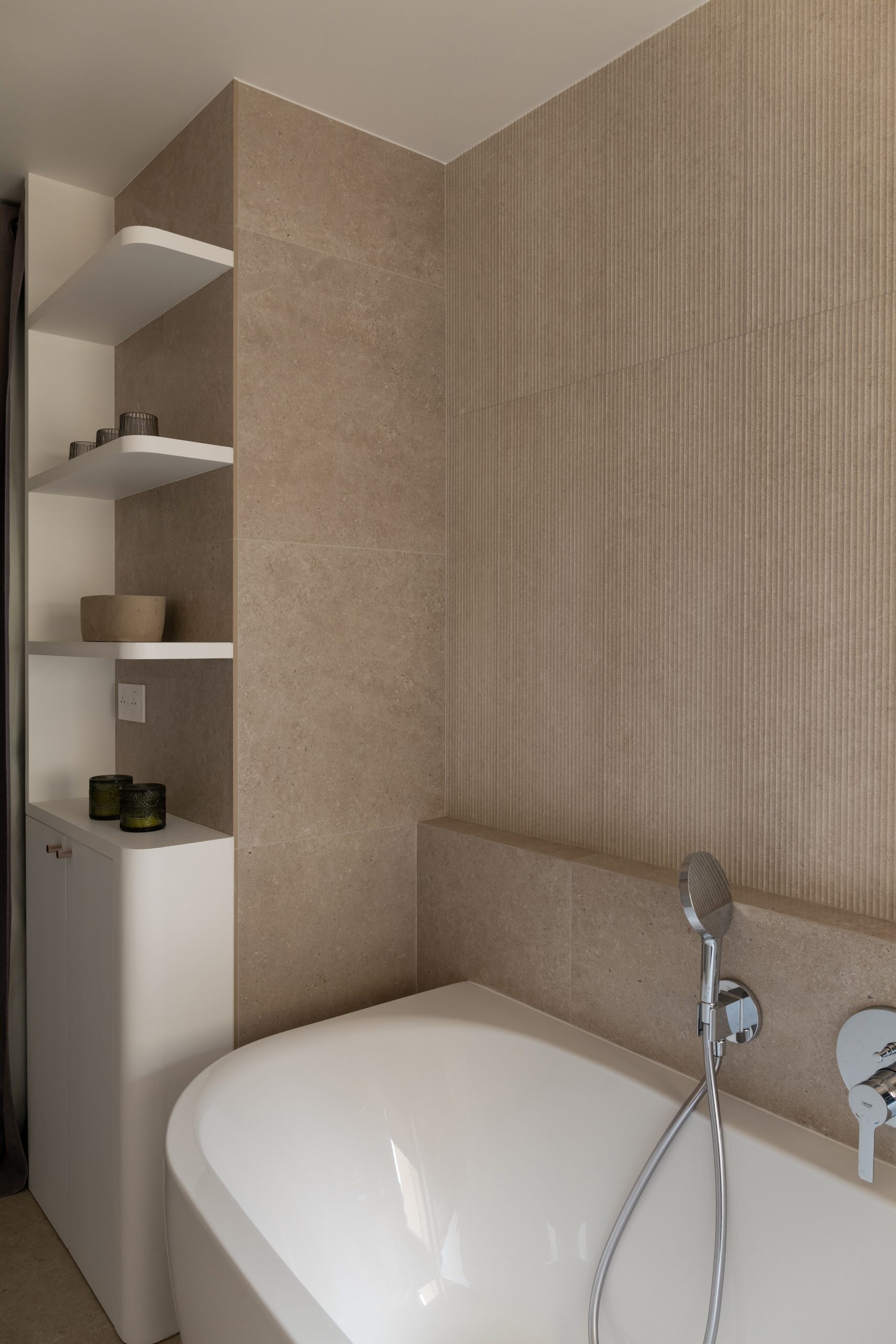 L’architecte a travaillé avec une attention graphique évidente, en mettant l’accent sur l’utilisation de matériaux de qualité, durables dans le temps. « Nous avons opté pour des changements de revêtements de sol, en utilisant du parquet en chêne et du grès cérame pour les espaces humides », explique-t-elle par exemple. De subtiles touches de fantaisie ont en outre été distillées, telles que des suspensions pour plantes intégrées dans le claustra, ainsi qu’un motif discret de stries. « L’idée était de créer une décoration intemporelle, tout en intégrant quelques éléments tendance », explique-t-elle.