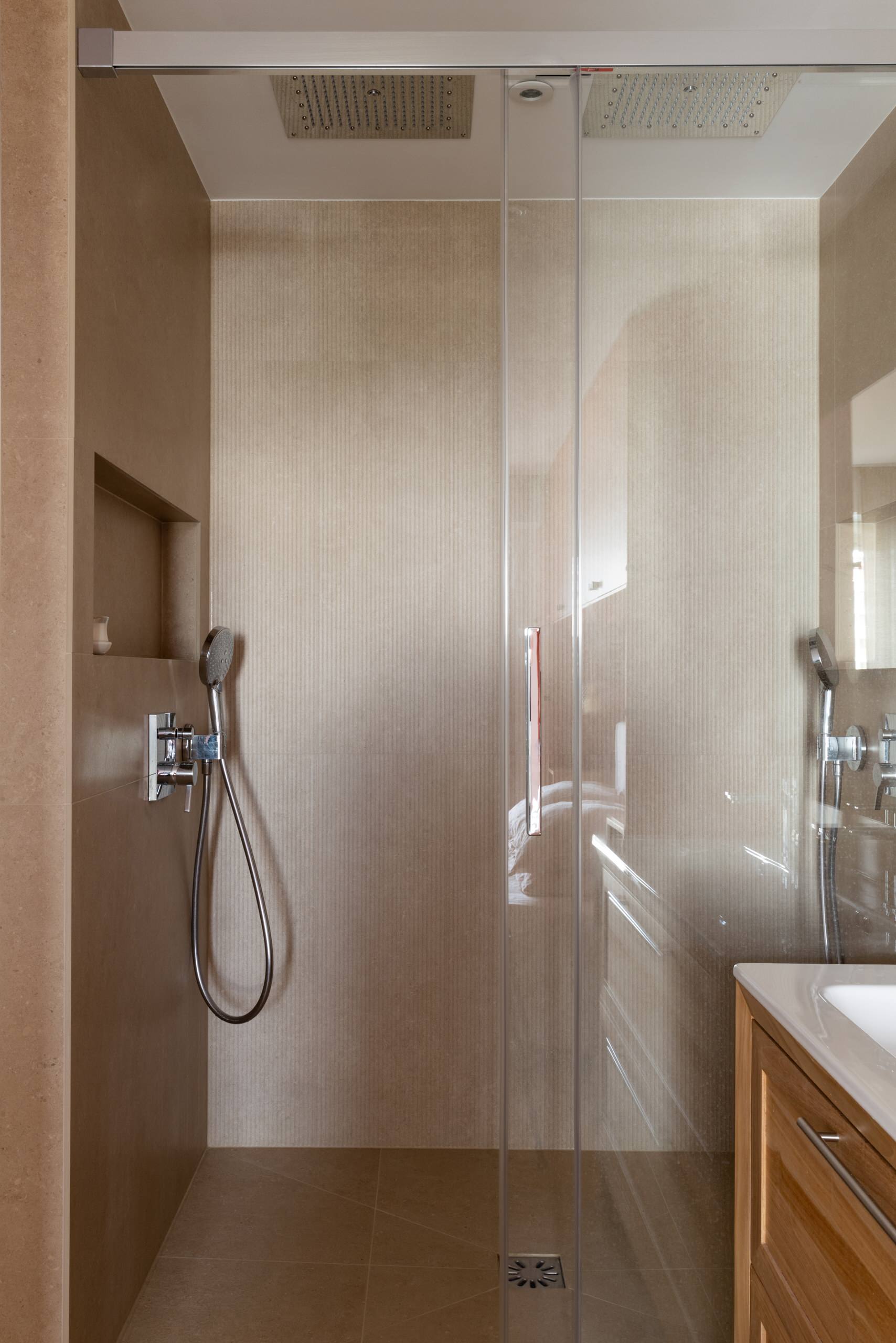 Après. Les maîtres de maison ont préféré profiter d’une douche, et même de deux ! « Ils avaient vu cette idée dans un hôtel et tenaient à disposer de deux pommeaux de douche côte à côte pour se laver à deux en même temps », révèle Stéphanie. Une idée de génie pour se préparer en express le matin, ce qui peut être très utile lorsque l’on a comme ici une grande famille.