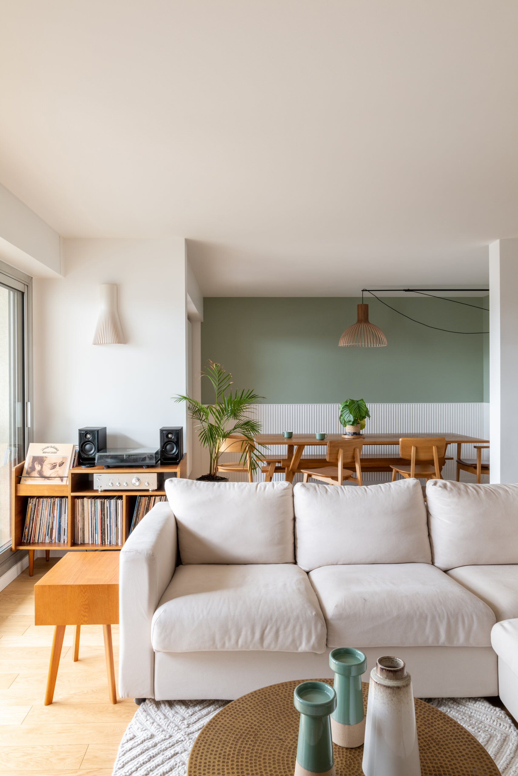 Cette famille francilienne, avec quatre enfants âgés de 2 à 8 ans, avait pour objectif de trouver un logement spacieux où chacun pourrait disposer de sa propre chambre. Un lieu pourrait cocher toutes les cases. Il s’agit de deux appartements côte à côte situés à Courbevoie, au 8ᵉ étage d’une résidence des années 1970 qui surplombe la Seine. Cependant, cette surface totale de 140 m² est en très mauvais état et comporte des doublons comme deux cuisines et deux séjours. Par des connaissances, ils rencontrent l’architecte Stéphanie Bertina Minel, à laquelle ils confient la tâche de réinventer leur appartement familial de rêve.