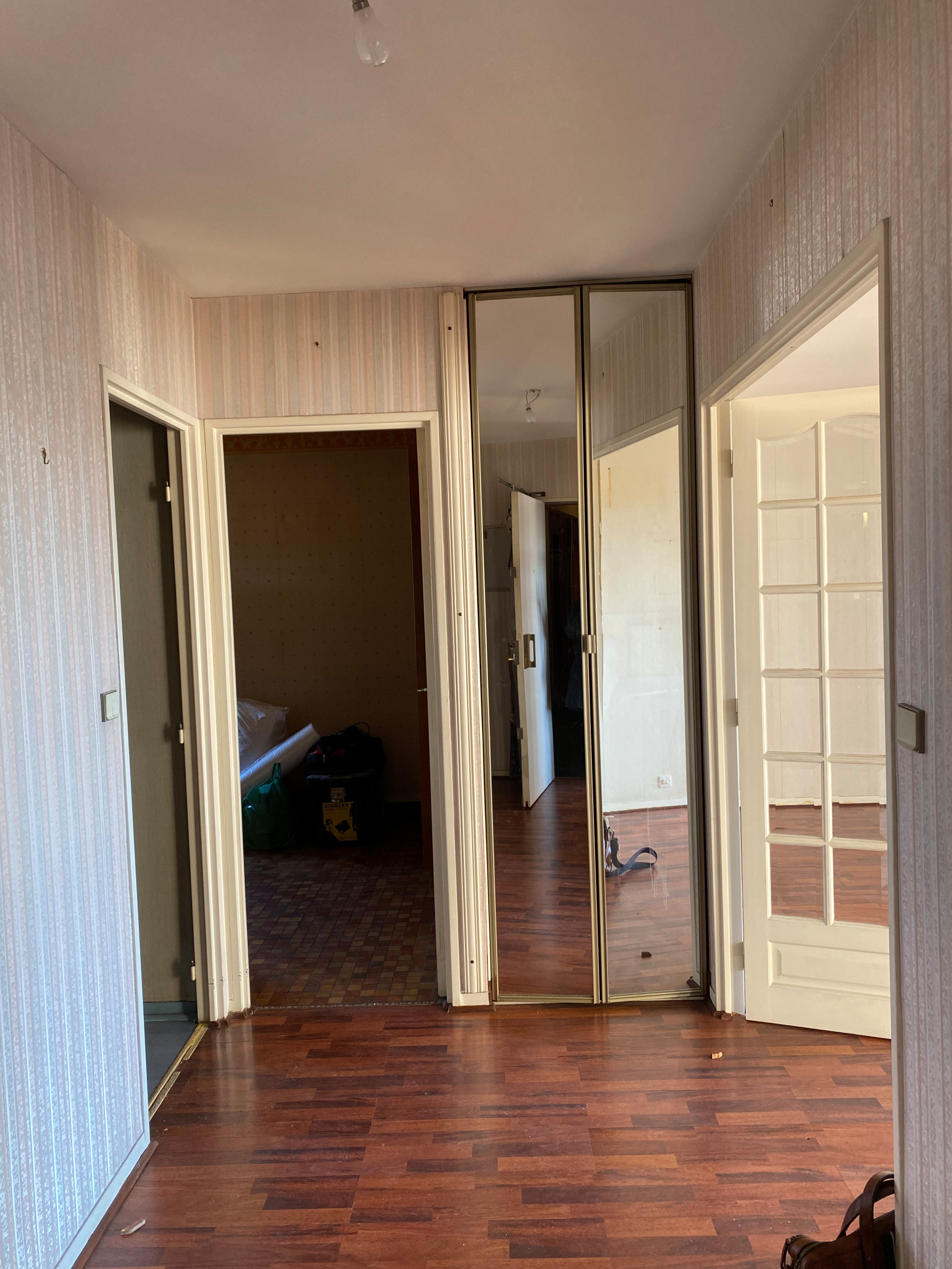 Avant. Mis en vente dans le cadre d’une succession, les deux appartements, d’une surface totale de 140 m², étaient adjacents et reliés par une porte. Leur utilisation antérieure ne nous a pas été révélée, mais il était évident qu’ils n’avaient jamais été rénovés depuis leur construction dans les années 1970. Le premier logement était composé d’un vaste séjour double et de deux chambres, tandis que le second se présentait comme un grand deux-pièces. Tous deux disposaient de petites cuisines séparées et de salles de bains vétustes.