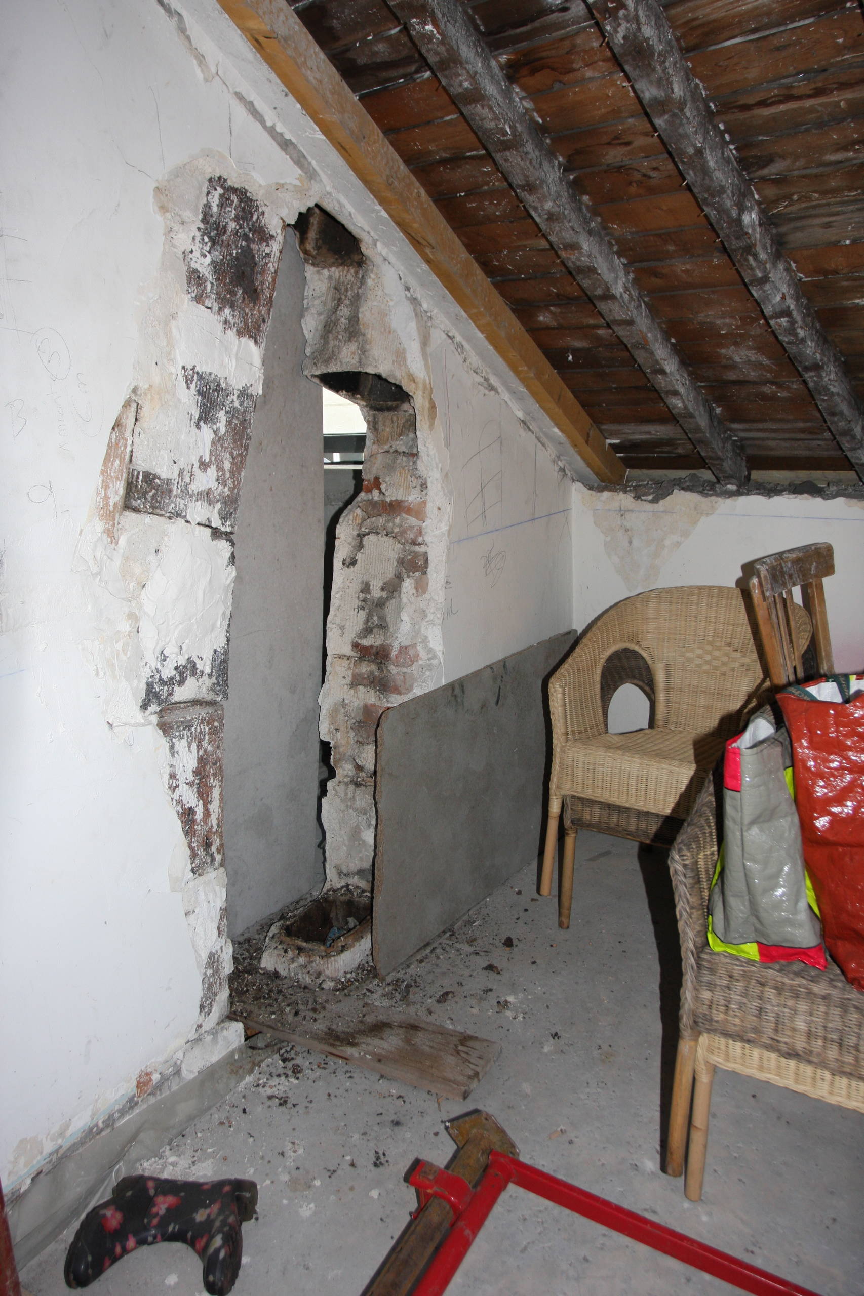 Avant. Au fond du salon, une cheminée avait été enlevée, laissant ainsi une ouverture.