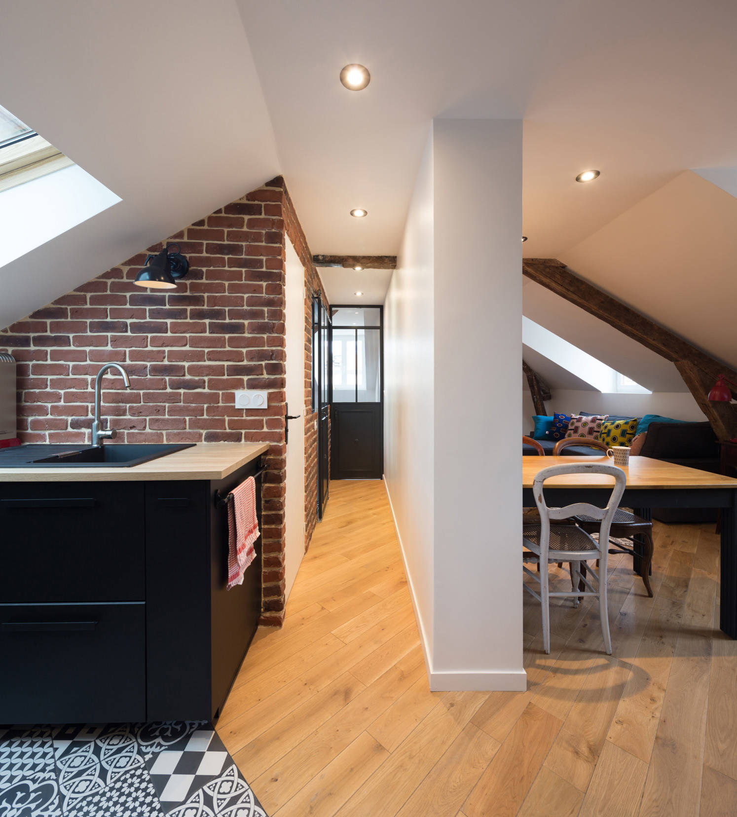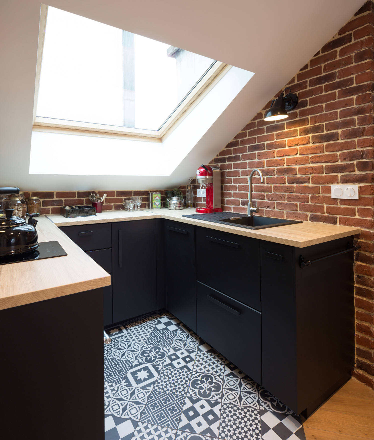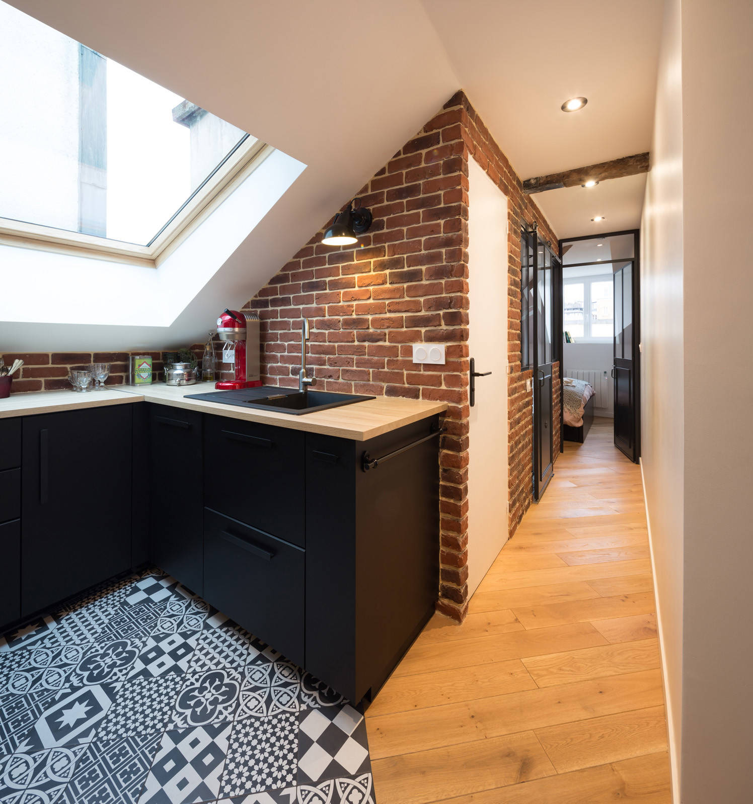 La brique présente sur certains murs ajoute en effet du caractère à l’endroit, et se marie joliment avec tous les éléments de l’appartement, dont la cuisine. Cette dernière, fonctionnelle et très lumineuse avec sa grande fenêtre de toit en bois et ses appliques noires de type industriel, a été voulue noir mat avec un plan de travail en mélaminé et un évier en résine noire. Partout, Prisca a inséré des spots dans les plafonds.