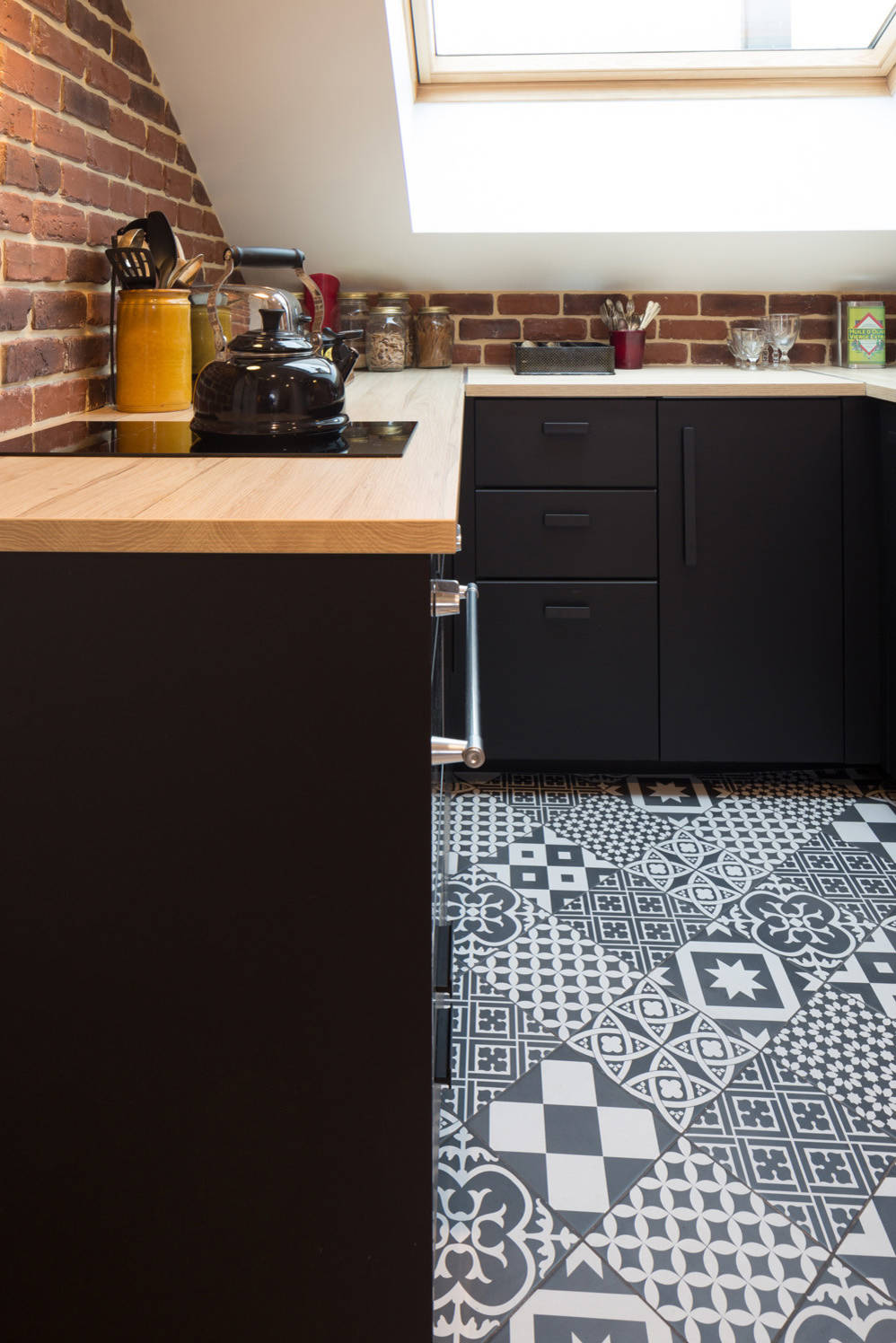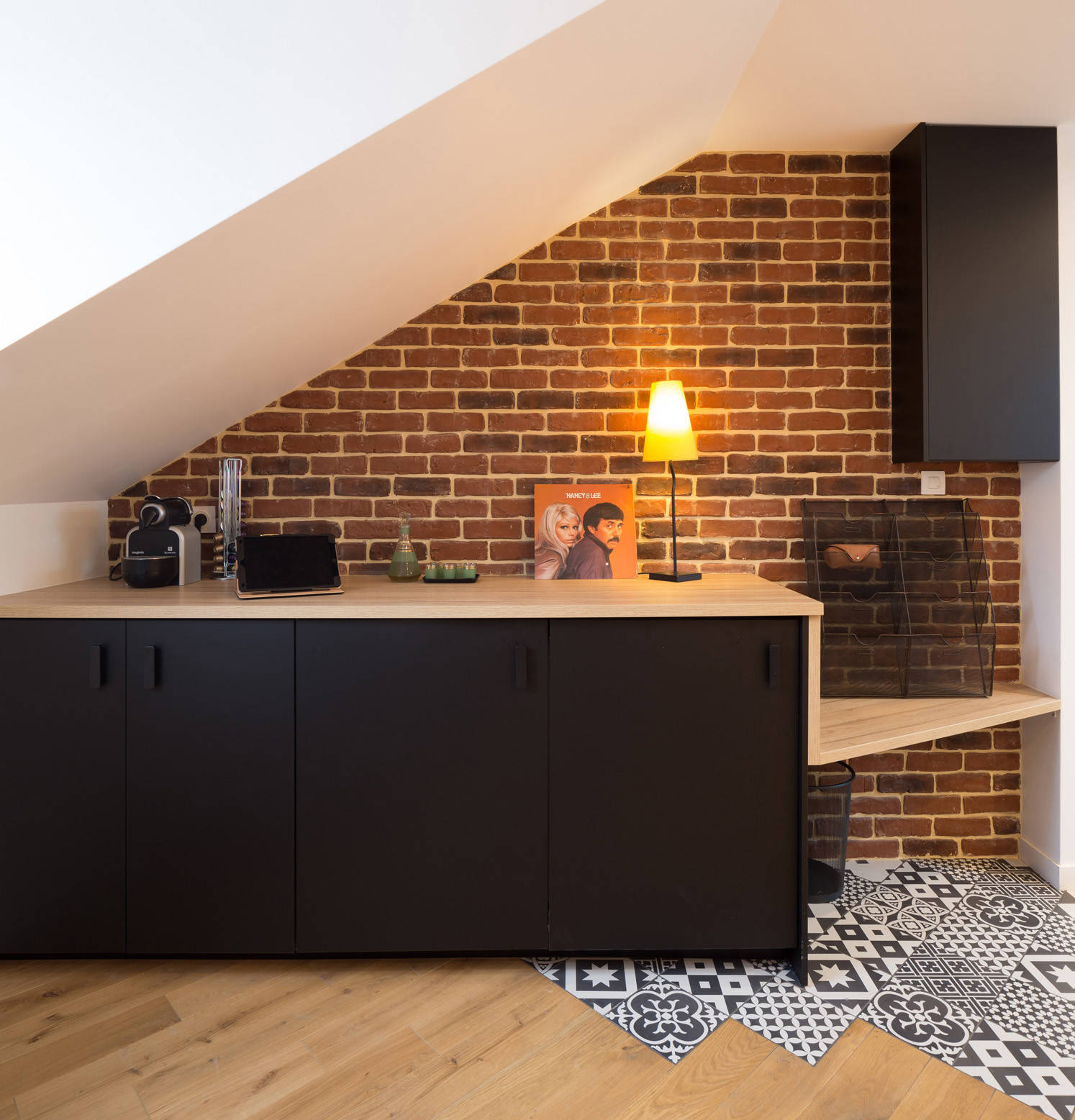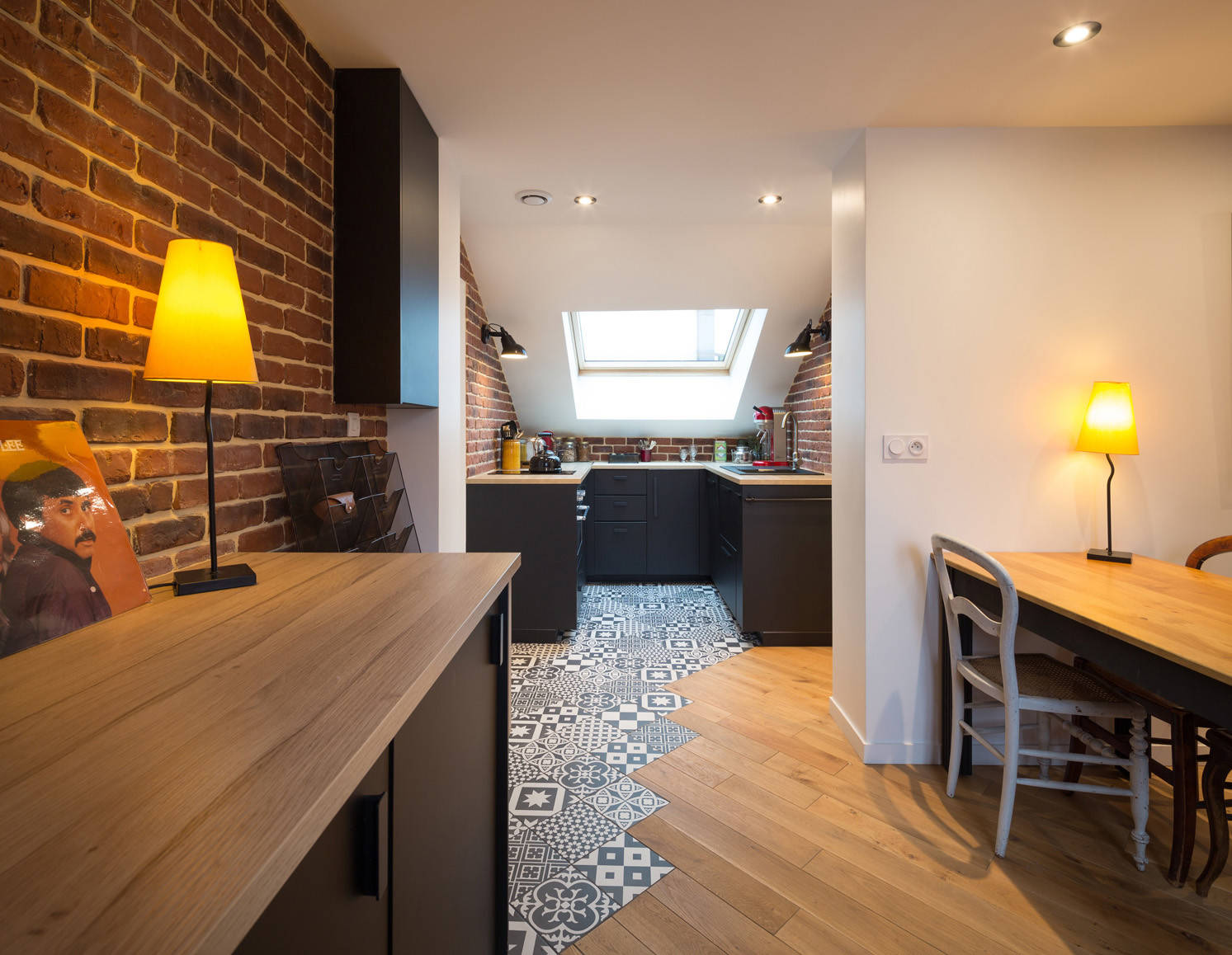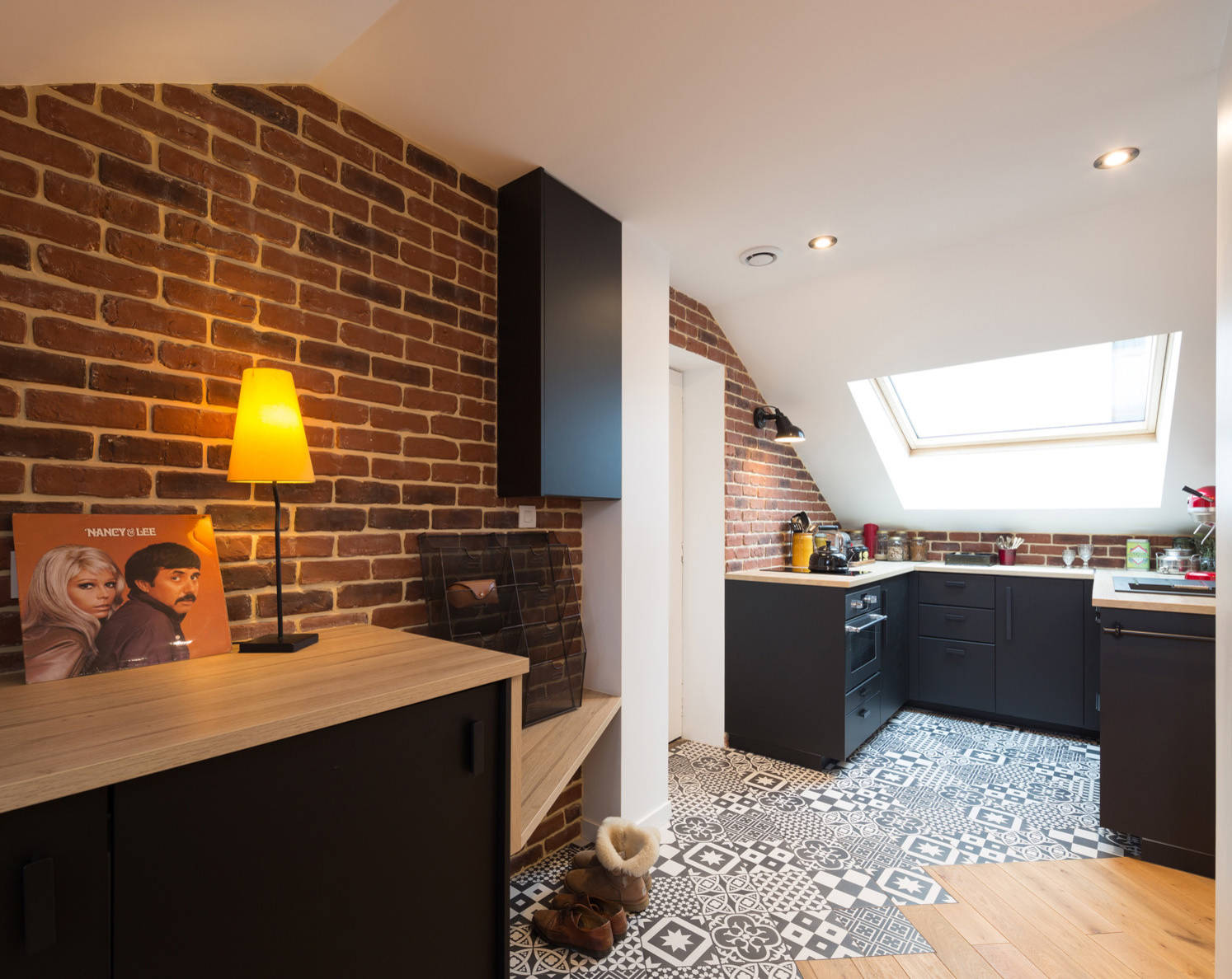 La brique présente sur certains murs ajoute en effet du caractère à l’endroit, et se marie joliment avec tous les éléments de l’appartement, dont la cuisine. Cette dernière, fonctionnelle et très lumineuse avec sa grande fenêtre de toit en bois et ses appliques noires de type industriel, a été voulue noir mat avec un plan de travail en mélaminé et un évier en résine noire. Partout, Prisca a inséré des spots dans les plafonds.