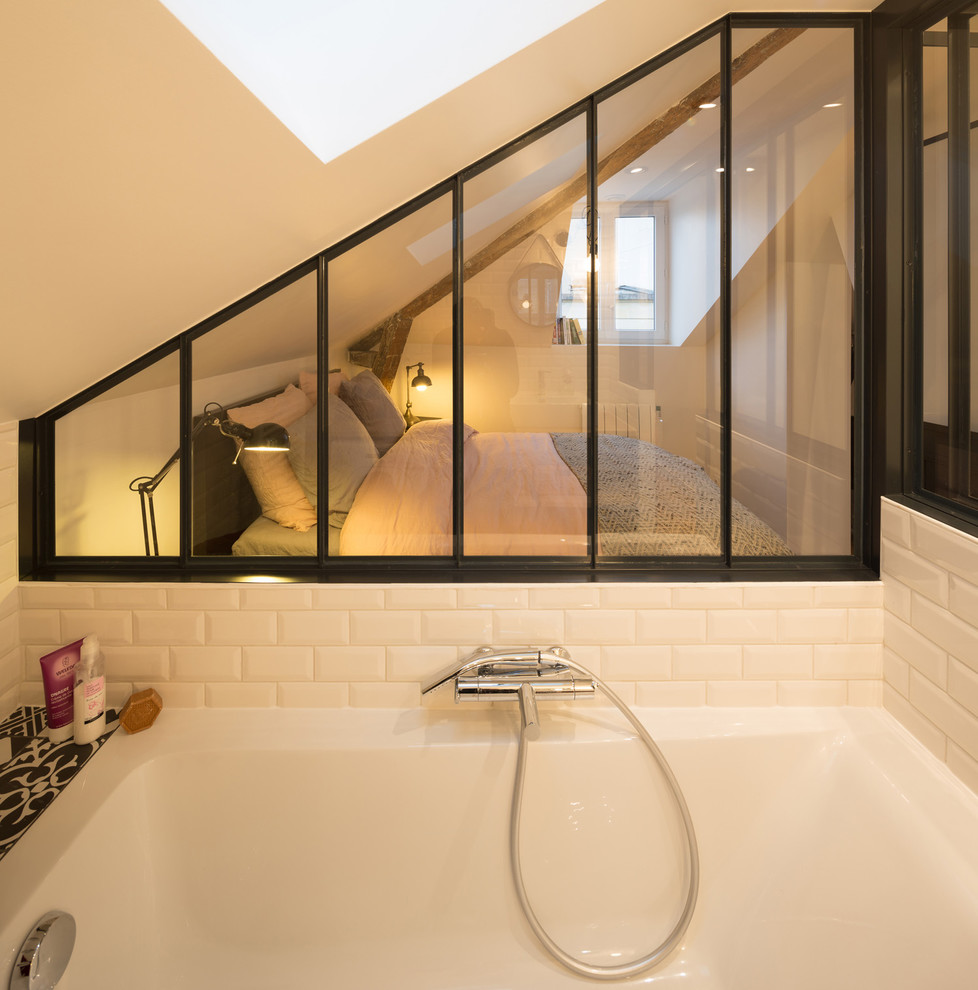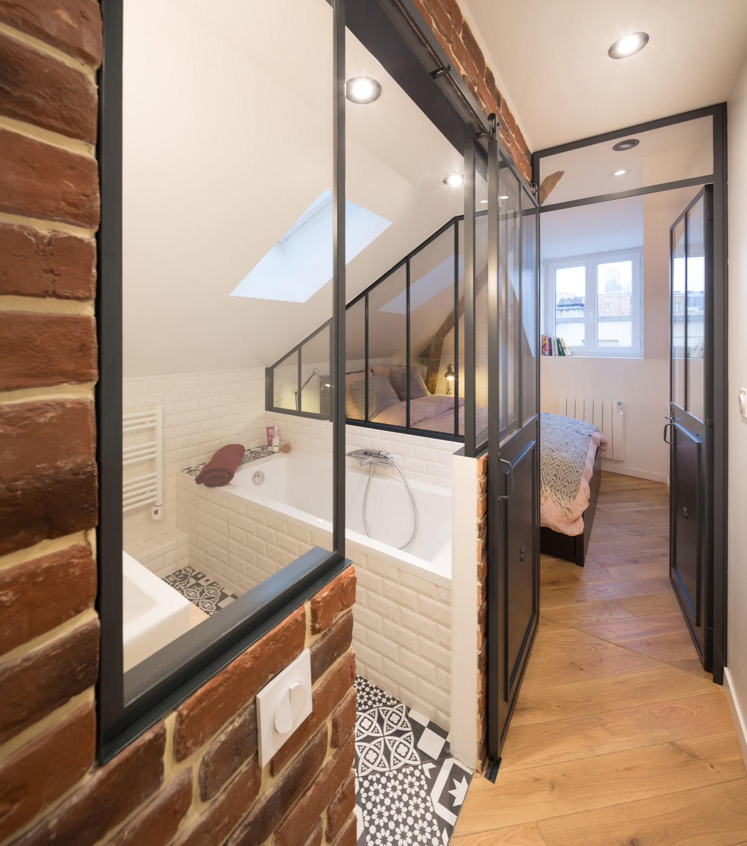 La hauteur de la verrière a été aussi calculée de manière à pouvoir dissimuler la baignoire en acrylique depuis la chambre, ainsi que les produits de bains ayant pris place sur une tablette carrelée prolongeant la baignoire.