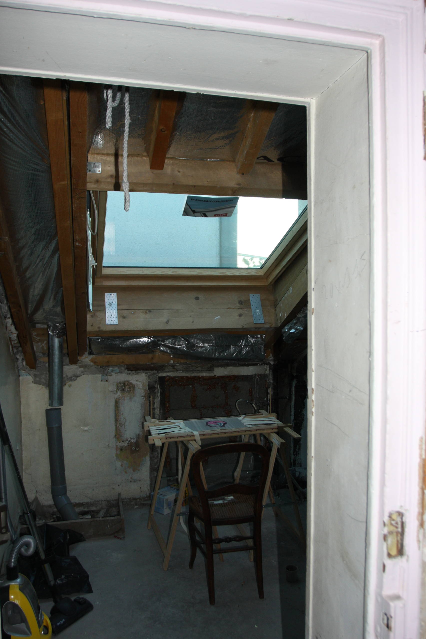 Après. Dans cette petite quarantaine de mètres carrés, une chambre, qui possédait déjà une ouverture dont le rebord sert même de bibliothèque, a tout de même été conçue, et l’on y tient debout.