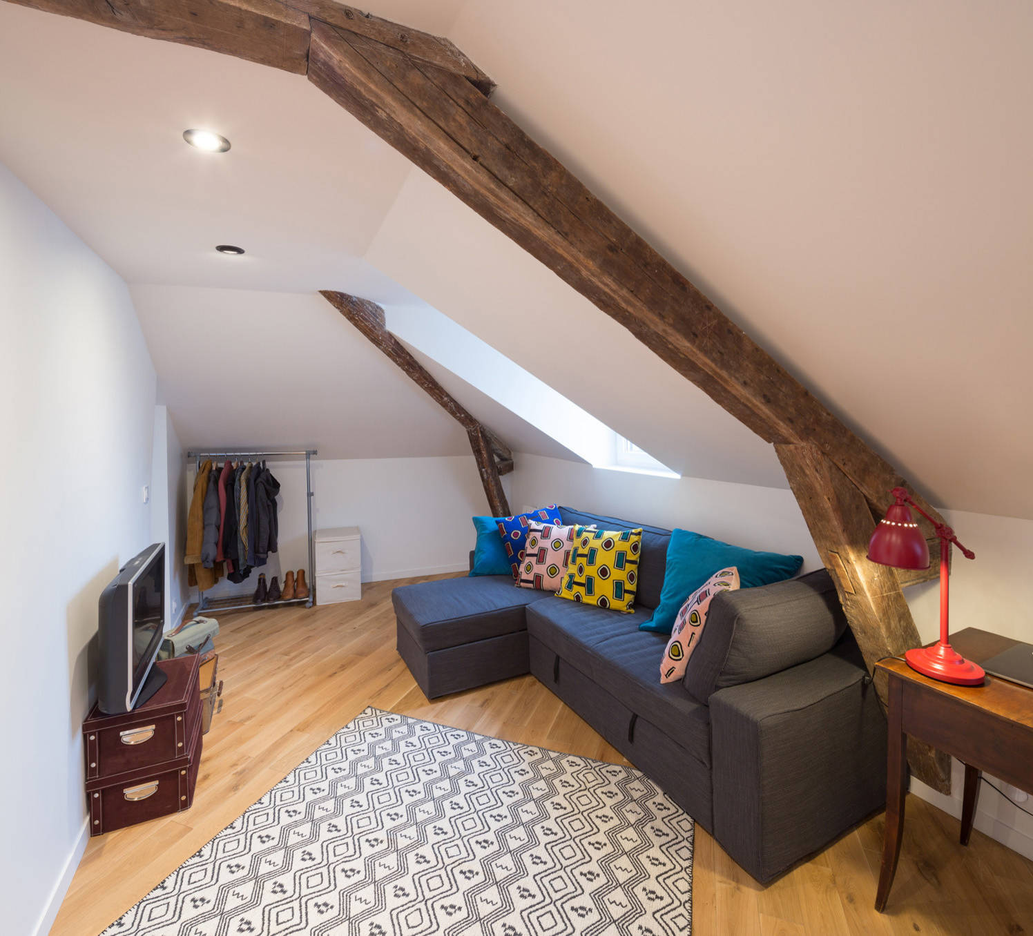 Comme dans le salon, certaines poutres existantes sont encore apparentes, et donnent du charme au lieu. Très sobre, l’espace salon et salle à manger est rehaussé par quelques coussins colorés aux motifs géométriques, et un tapis suivant le sens des lames du parquet. Si l’esprit loft demeure, un style « récup » s’impose également dans cet espace, au regard du choix de la table, de la chaise, du bureau et de la lampe de bureau.