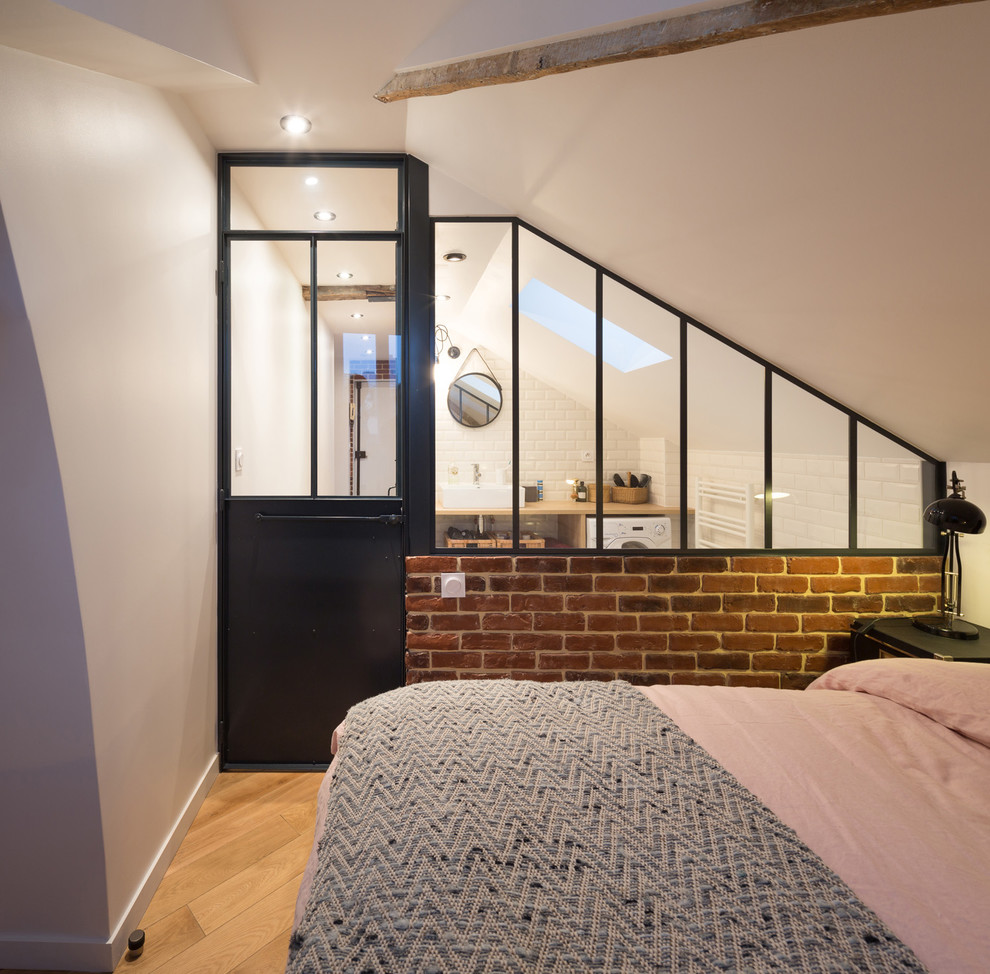 Au dernier étage d’un immeuble du début du XXᵉ siècle, situé à Neuilly-sur-Seine, se trouvait un grenier non habitable, presque insalubre… Les propriétaires imaginaient ici un appartement cosy dédié à la location. L’architecte et architecte d’intérieur Prisca Pellerin de l’agence Signature Architectes a relevé le défi avec brio, après avoir mené de lourds travaux… « Tout était apparent », se souvient-elle. « Il n’y avait rien dans ce grenier à part une évacuation sur laquelle nous nous sommes repiqués. Il a fallu isoler entièrement, remettre le sol d’aplomb avec un ragréage, refaire l’électricité, la plomberie, les sols, installer un chauffe-eau électrique, des convecteurs électriques, changer les ouvertures, créer une fenêtre de toit dans la salle de bains, etc. » Autant dire que la tâche était de taille. Prisca a réussi à optimiser chaque recoin en exploitant au mieux les sous pentes, en ouvrant les espaces, en réalisant même une chambre avec salle de bains, et en offrant à cette nouvelle habitation un visage contemporain mâtiné d’une ambiance loft, tout en limitant les dépenses. Détails.