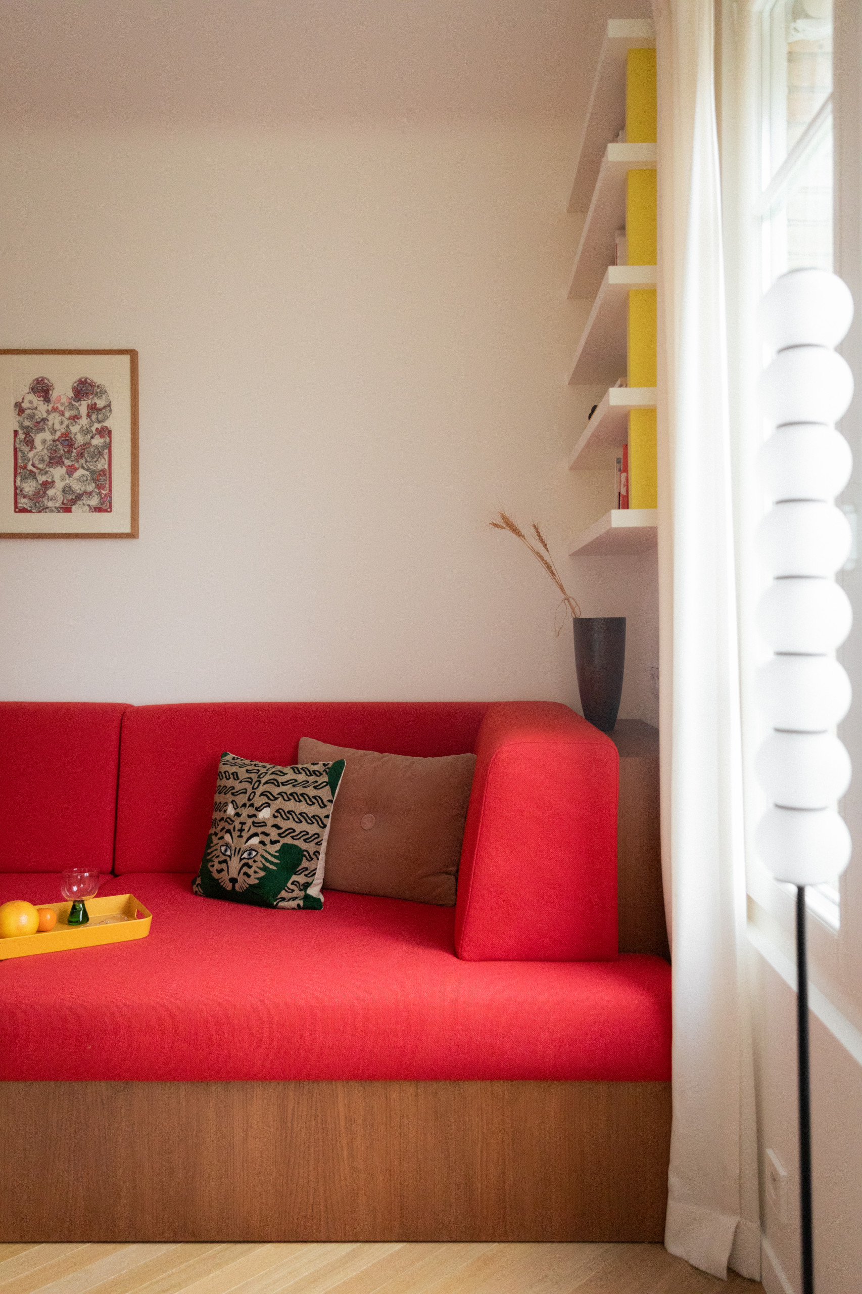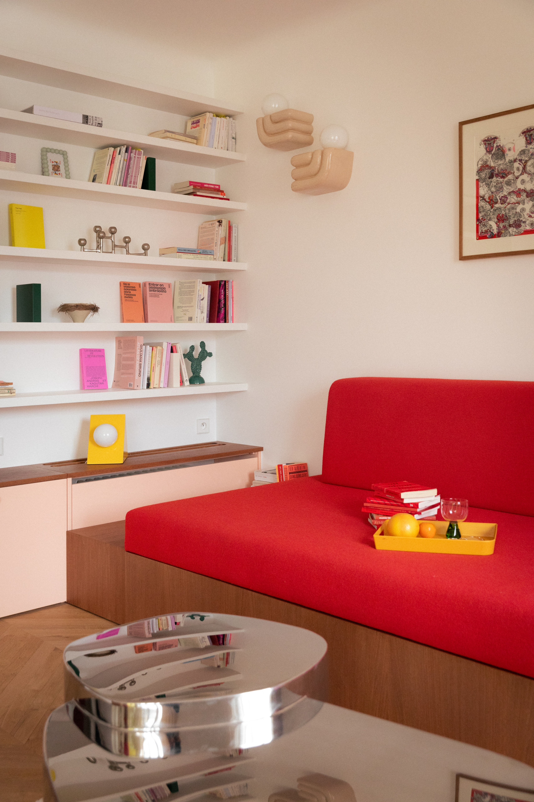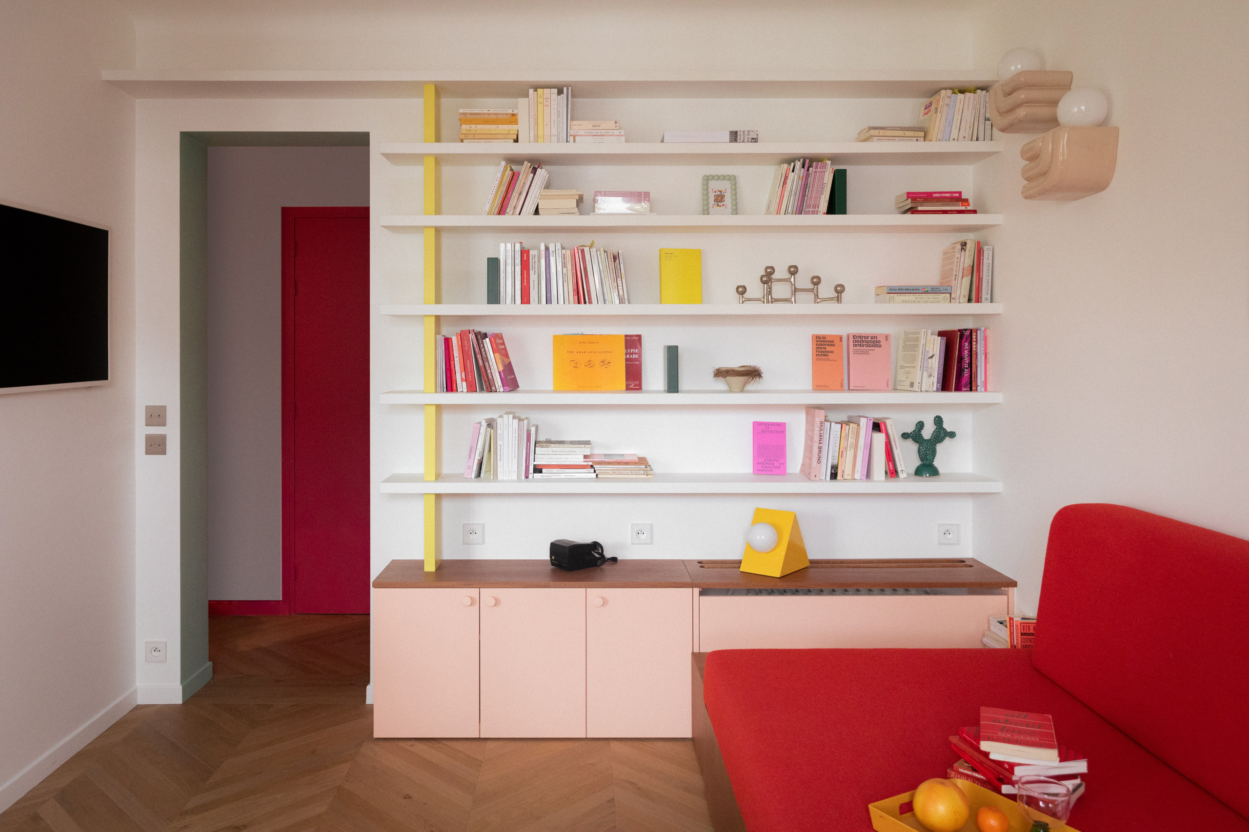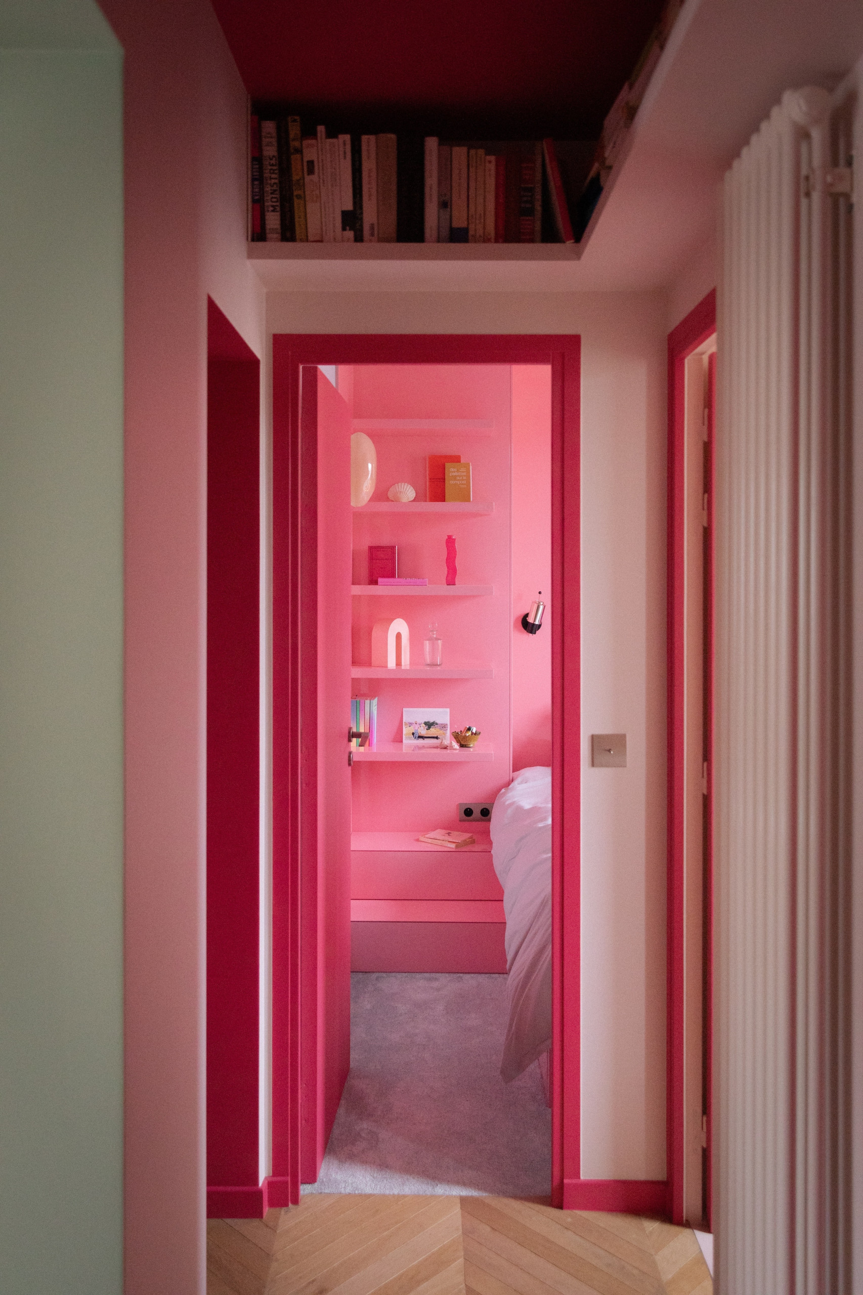 À l’arrière, le couloir d’entrée ne laisse pas indifférent. Porte rouge, encadrements de porte et plinthes fuchsia posent directement le ton audacieux de l’appartement, tandis qu’une étagère en hauteur suggère d’emblée le travail soigné d’optimisation spatiale.