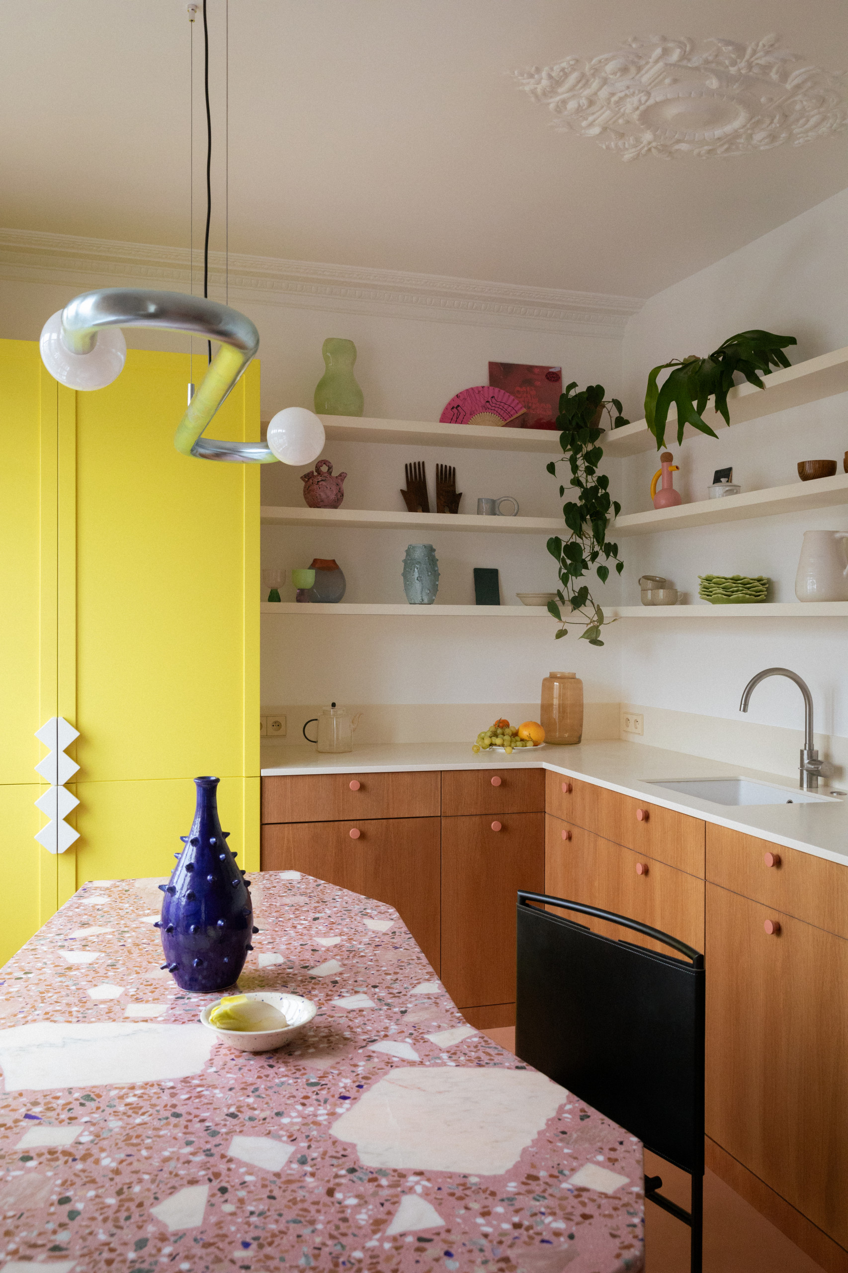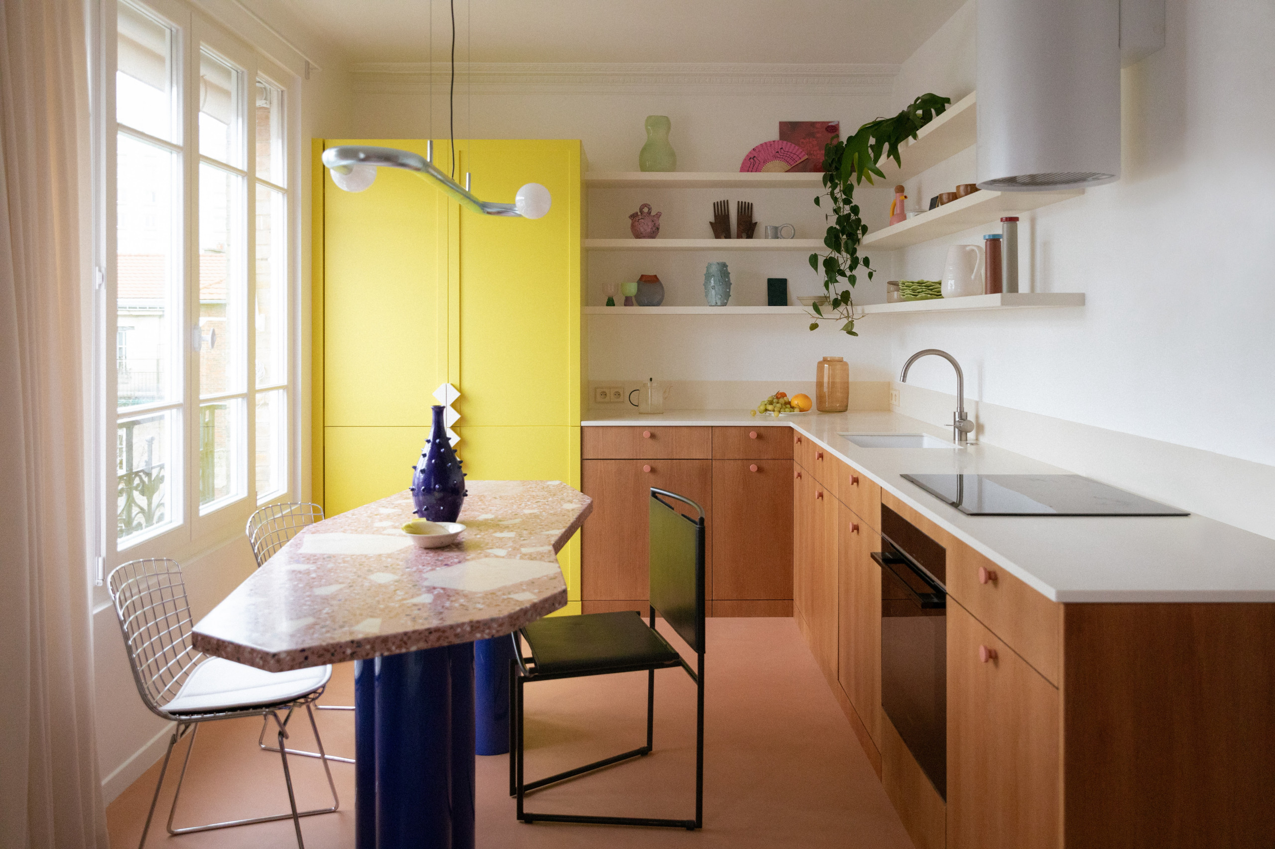 Après. Placée devant la baie vitrée, la table à manger dessinée par Épicène crée la surprise et incarne bien la confrontation entre classicisme et exubérance dans la cuisine. Son plateau en terrazzo a été réalisé sur mesure et la granulométrie des inserts de marbre et leur emplacement choisis finement par la professionnelle qui l’a également dotée de pieds bleus audacieux (Ressource R811 Le Chenapan). Les pans coupés de la table peuvent accueillir jusqu’à six convives entourés de de chaises design de Mario Botta et Harry Bertoia, « On a conçu cette cuisine visible du séjour comme un meuble, à la fois fonctionnelle et décorative, dans l’esprit Memphis », résume-t-elle.