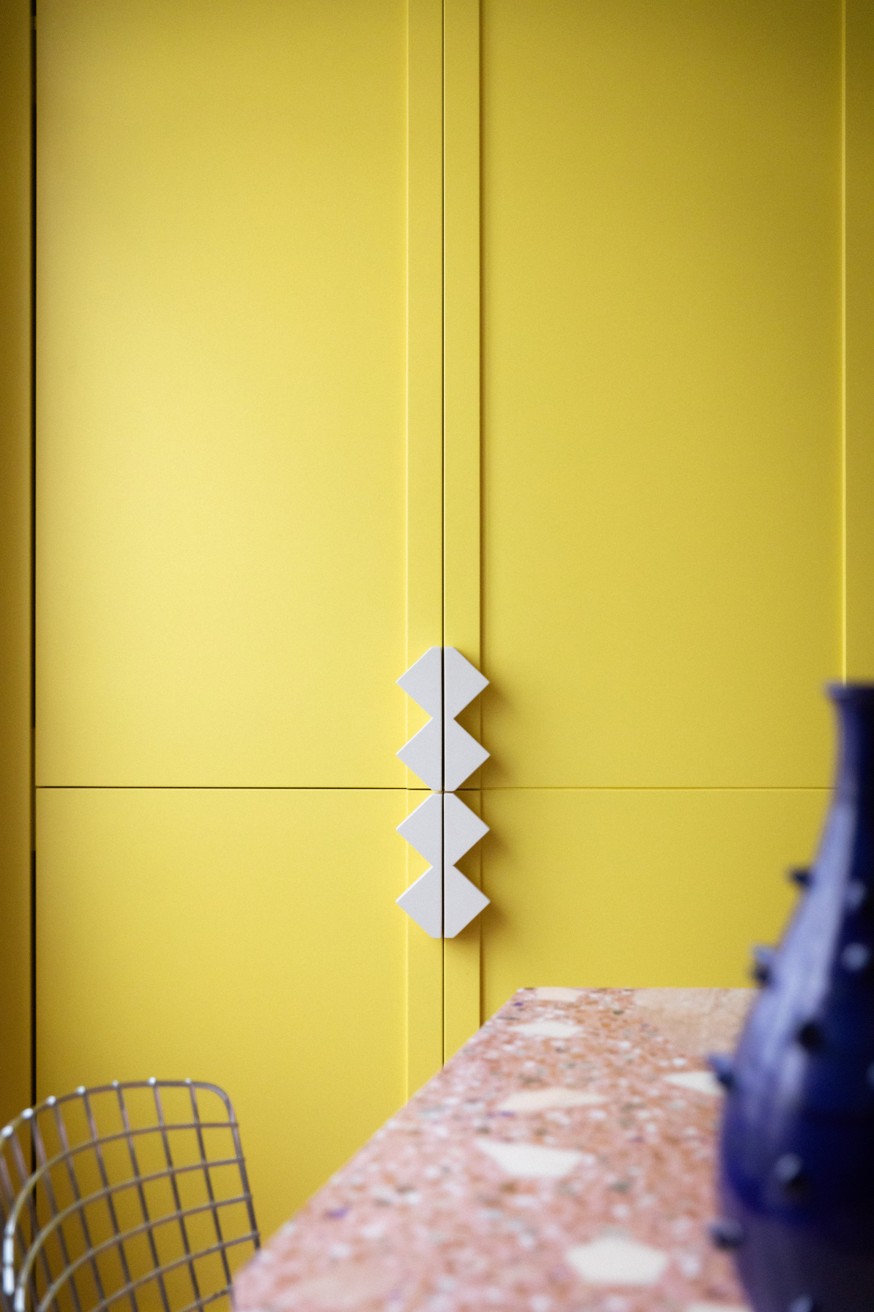 Preuve que chaque détail a été travaillé avec attention, Isabelle a même dessiné sur mesure les poignées de l’armoire jaune dans un motif crenelé que ne renierait pas Sottsass, père du miroir Diva ou encore de la célèbre bibliothèque Carlton.
