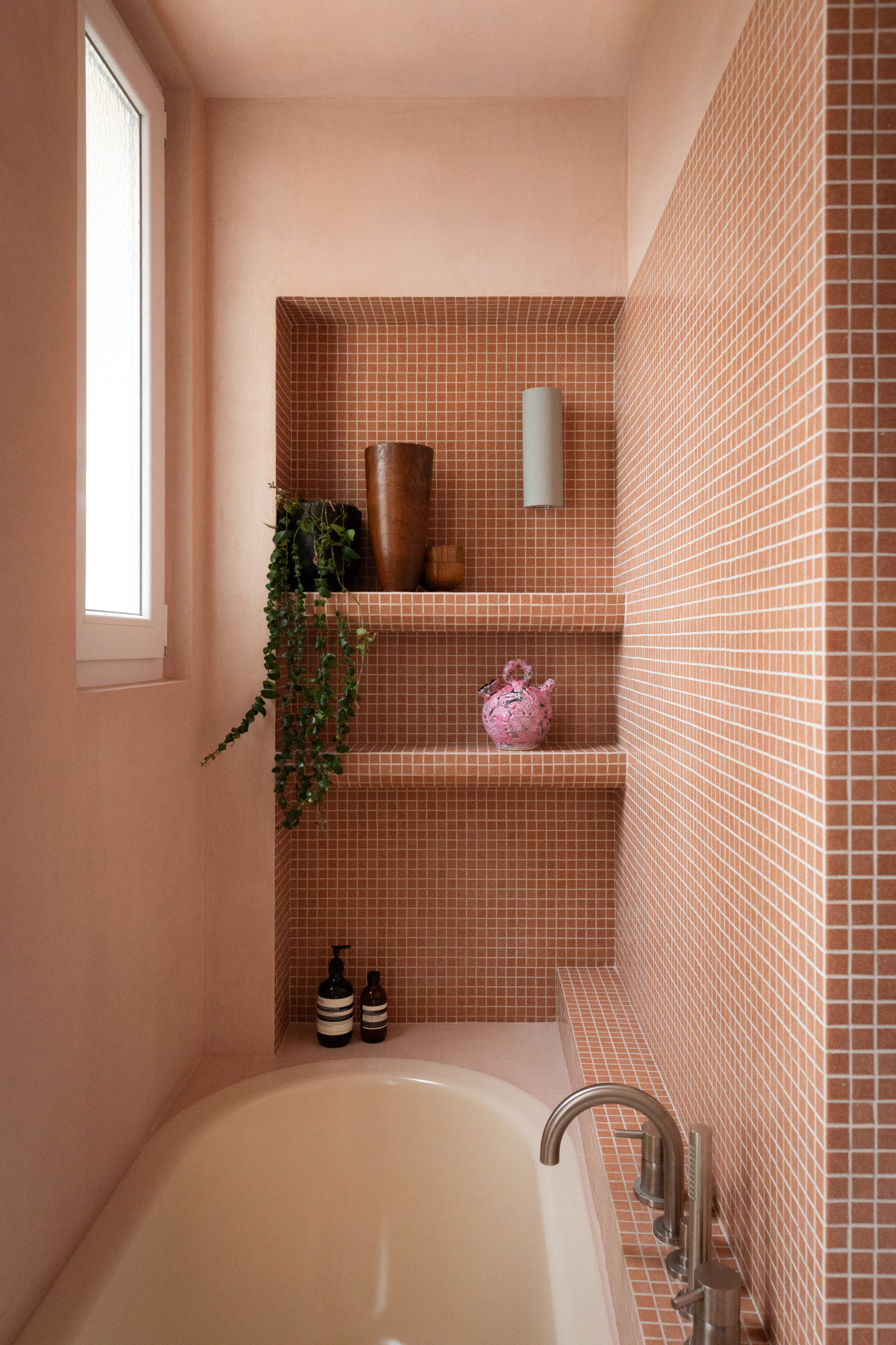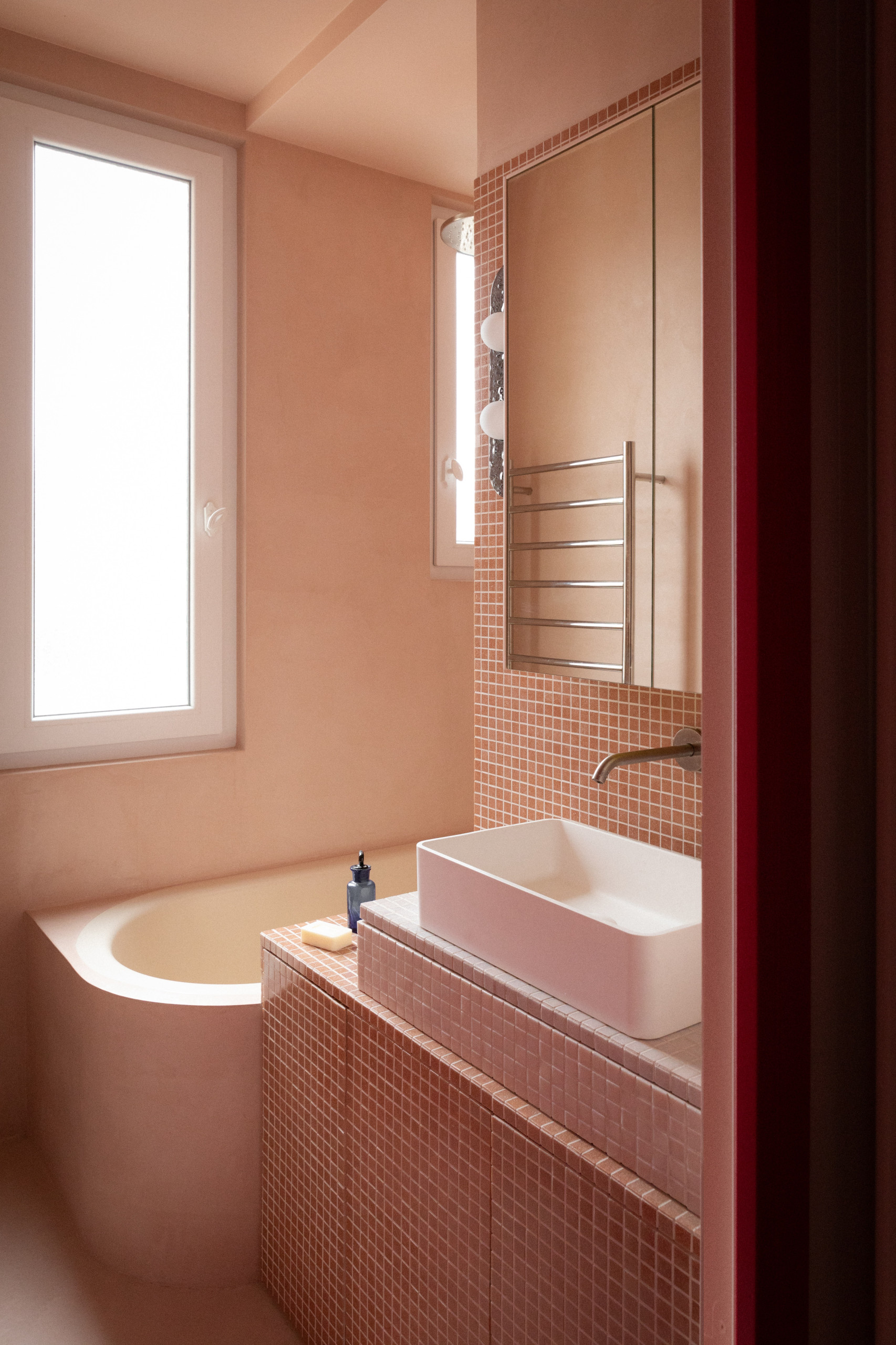 Après. La salle de bains a été réorientée pour annexer la fenêtre des toilettes. Une décision prise par rapport à un souhait fort de la propriétaire : « elle voulait une baignoire-douche, car elle a la passion des bains ». Isabelle Heilmann a donc installé un modèle de baignoire à fond plat dédié à ce double usage, dans une alcôve étanche en béton ciré abricot et mosaïque de la même teinte.