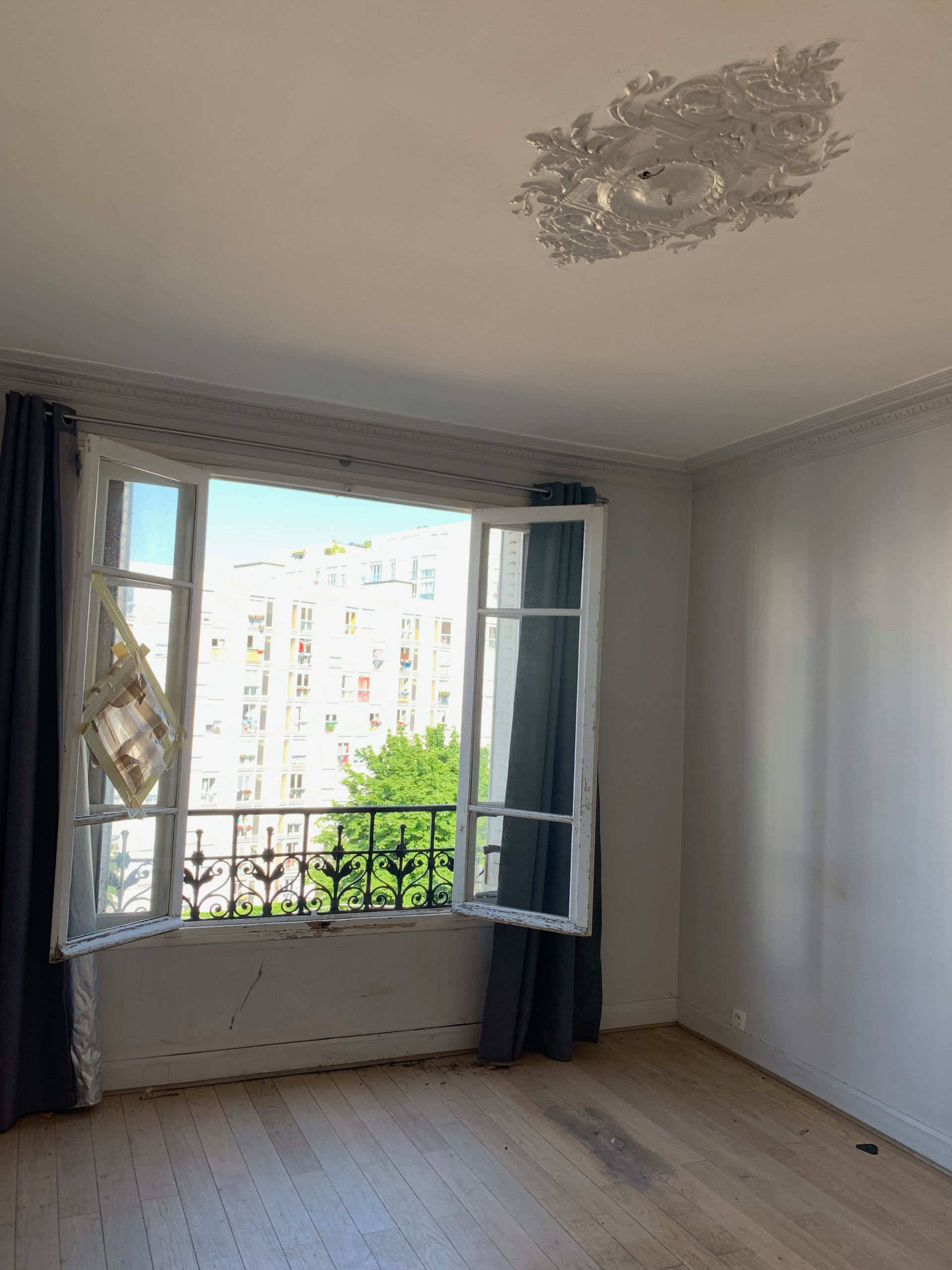 Avant. Pièce jumelle du séjour, la chambre sur rue présentait la même configuration, si ce n’est une belle fenêtre à quatre vantaux, une moulure au plafond et un pan coupé qui autrefois correspondait à une cheminée déjà déposée.
