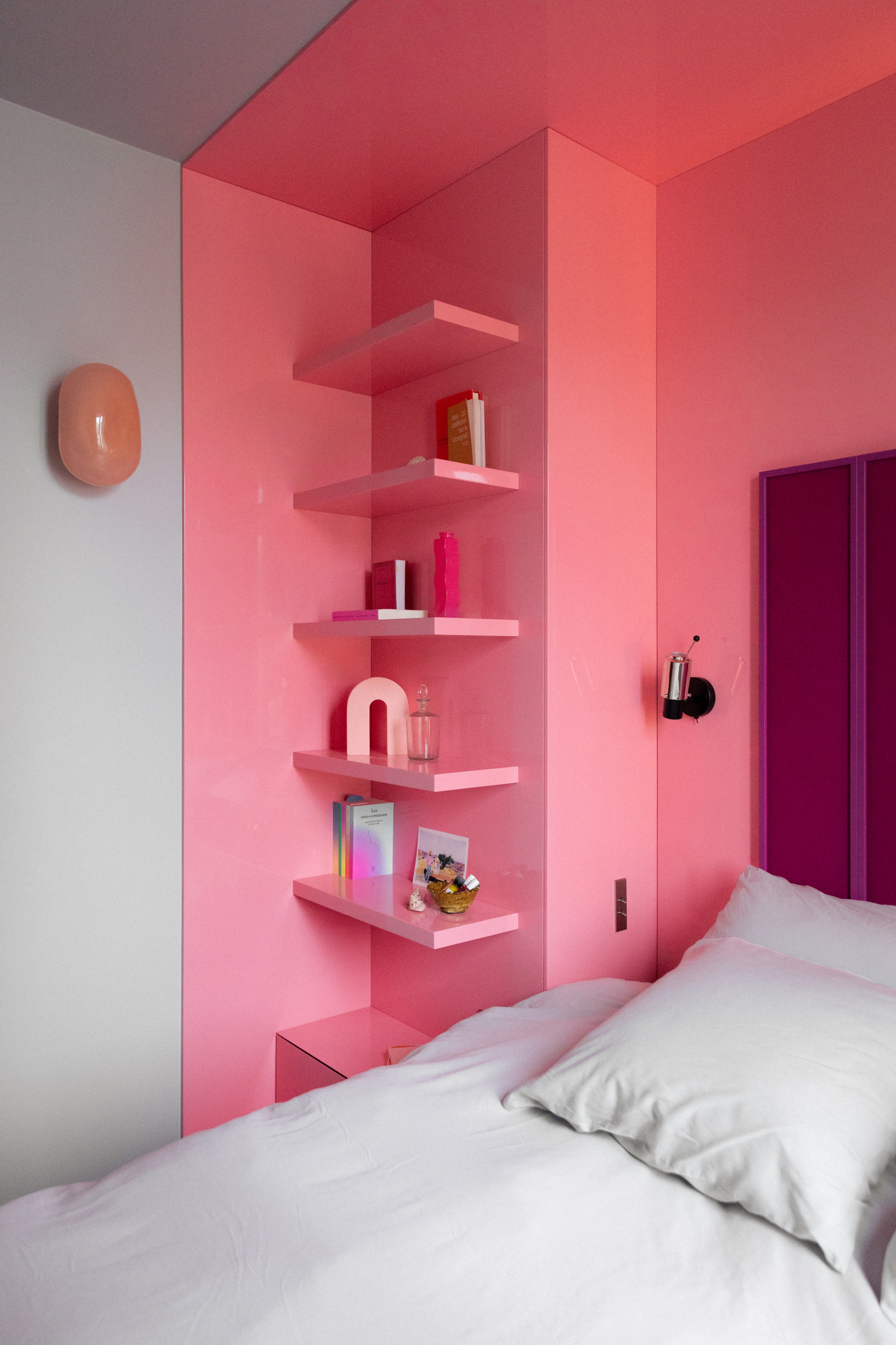 Sur cette niche menuisée s’appuie la tête de lit conçue comme un paravent asymétrique et hypnotique, dans le style Memphis. Des cadres laqués violets (Ressource – SL20 Lilas des Indes) accueillent des panneaux molletonnés fuchsia auxquels on peut s’adosser confortablement.