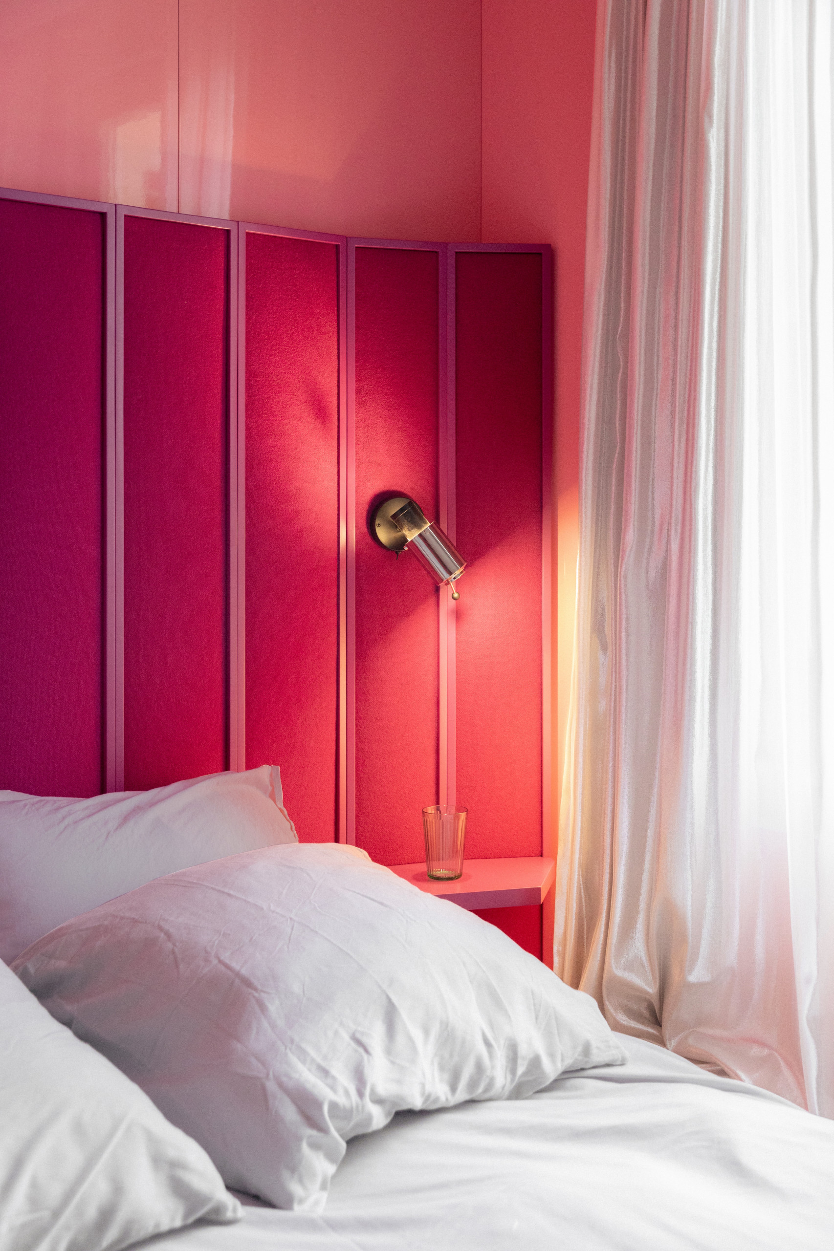 Pour contrebalancer les roses dont le contraste crée une vibrance entêtante, des rideaux argentés évoquent une boule à facettes, tandis qu’une moquette grise adoucit l’ensemble.