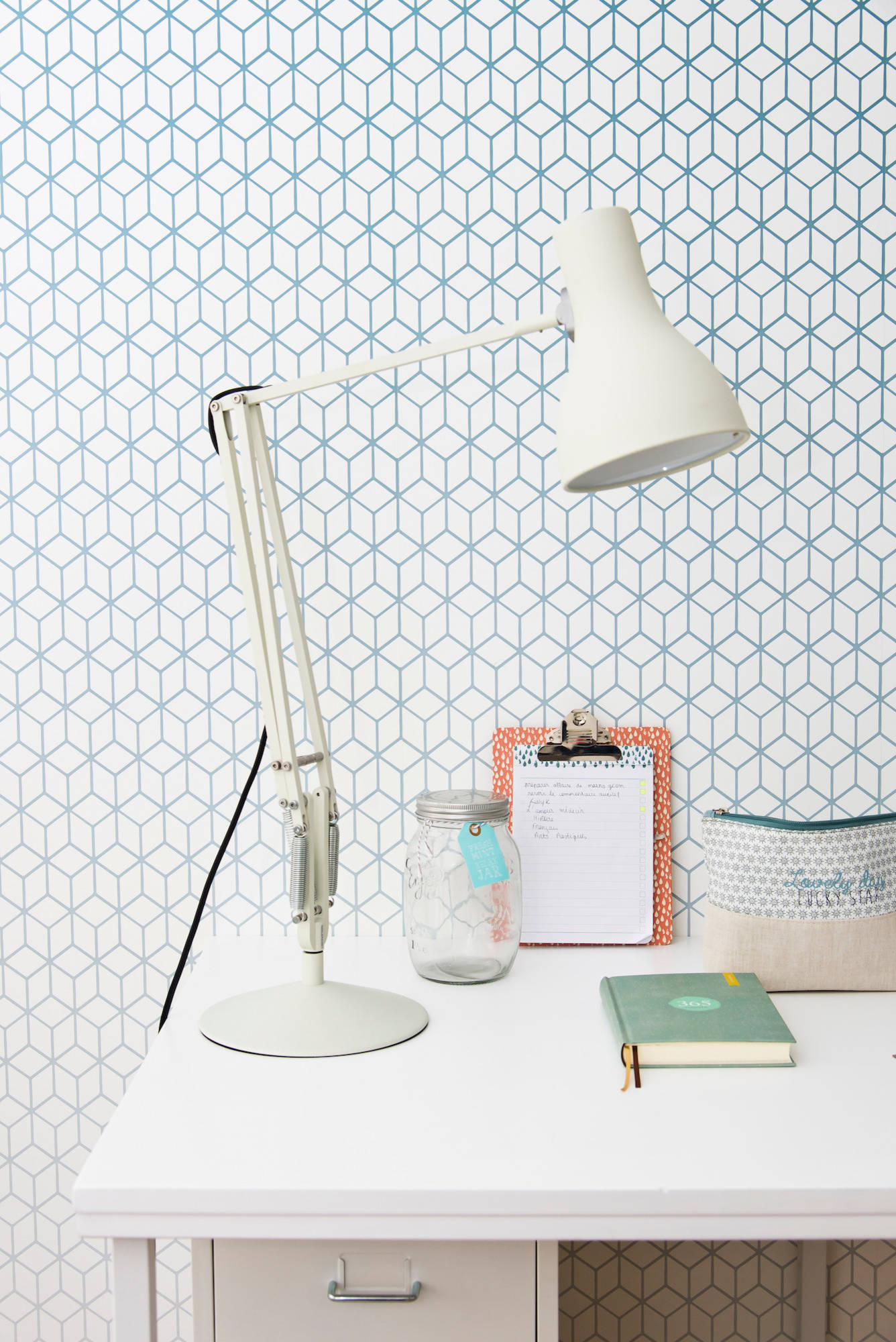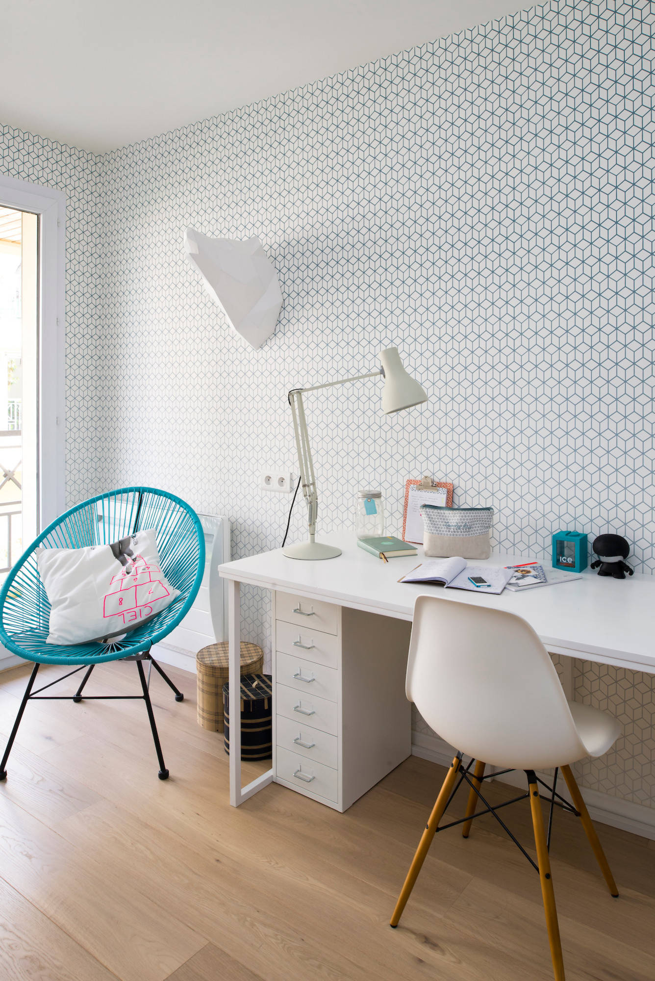 La plus jeune des filles, qui partageait précédemment sa chambre avec son frère, a hérité de la chambre flambant neuve. « Cette demoiselle avait des envies déco précises », se rappelle Olivier. Elle a d’ailleurs trouvé elle-même ce papier peint géométrique et un bureau fait de modules assemblés : des tréteaux en L de chez Habitat, un plateau La Redoute et un casier Ikea.